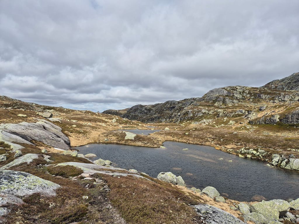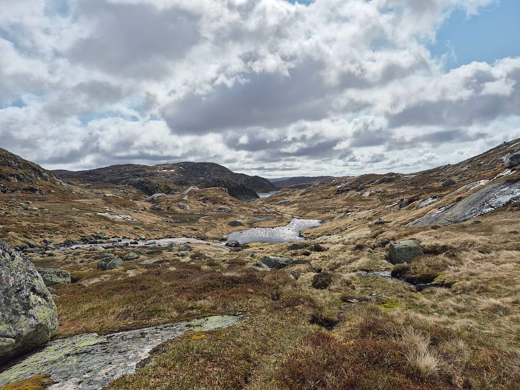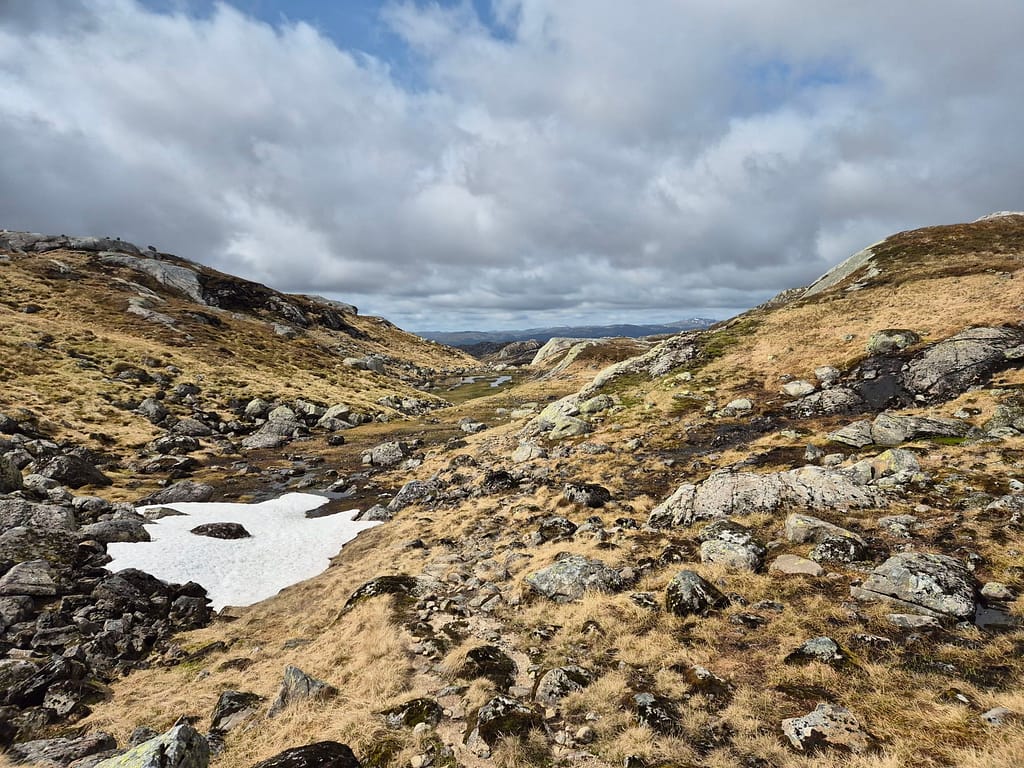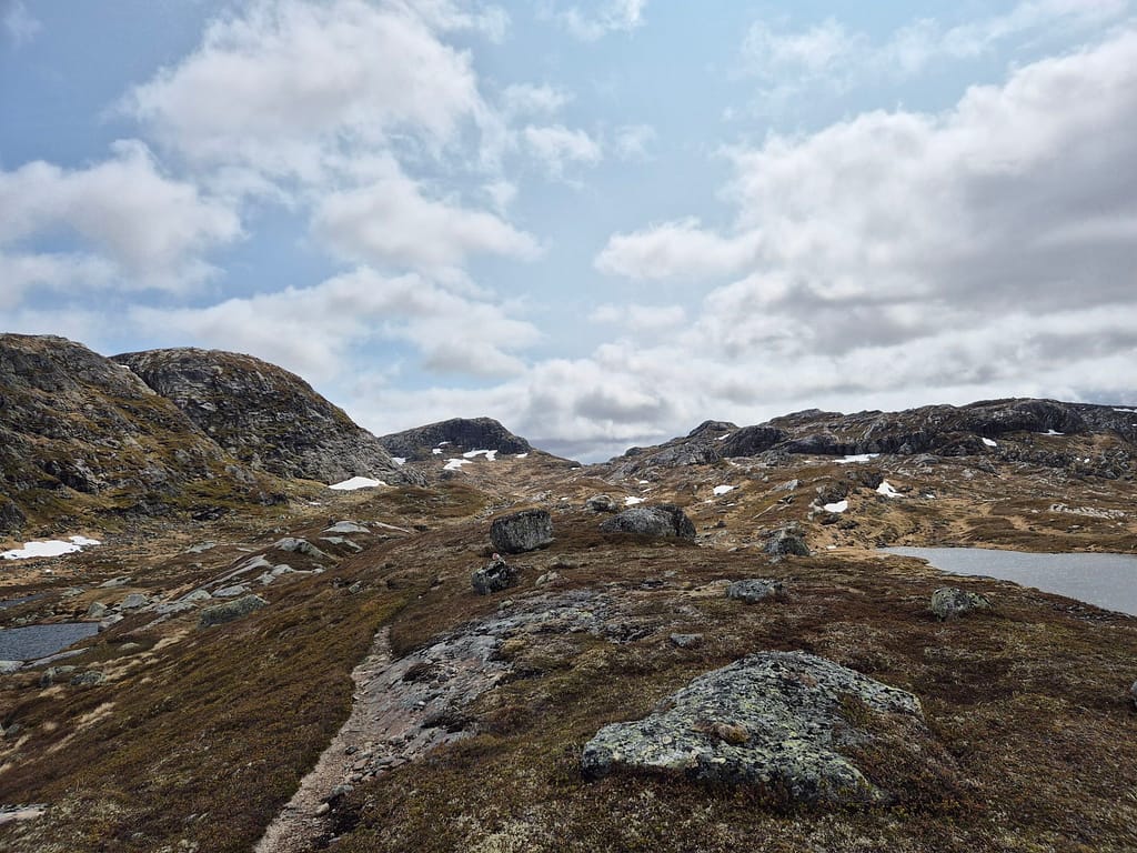 Det ble en rolig og fin marsj langs fjellvann og fine utsikter. I horisonten lengre nordvest kan jeg skimte noe mer snø i fjelltoppene. Det er likevell såpass lite at jeg ikke er bekymret for rutevalget.