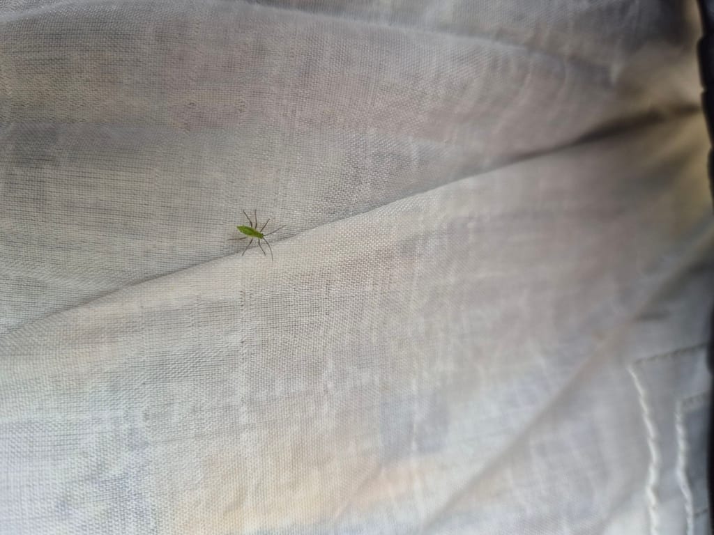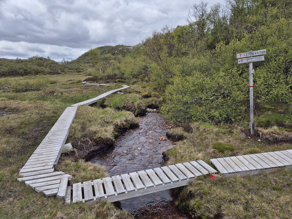 1 km fra Taumevatn traff jeg på et veiskilt og en del klopper (planker man kan gå på). I dette området var det en del bjørketrær tett intill stien. Da jeg skulle ta en pust i bakken og sette meg ned kom det en invasjon av bladlus (eller hva det er. Se bilde). De fylte hele sekken og alt av klær. Det hjalp ikke å børste unna så jeg gikk videre for å få ristet dem av meg. Det krydde av disse i bjørketrærne, men også i gresset.