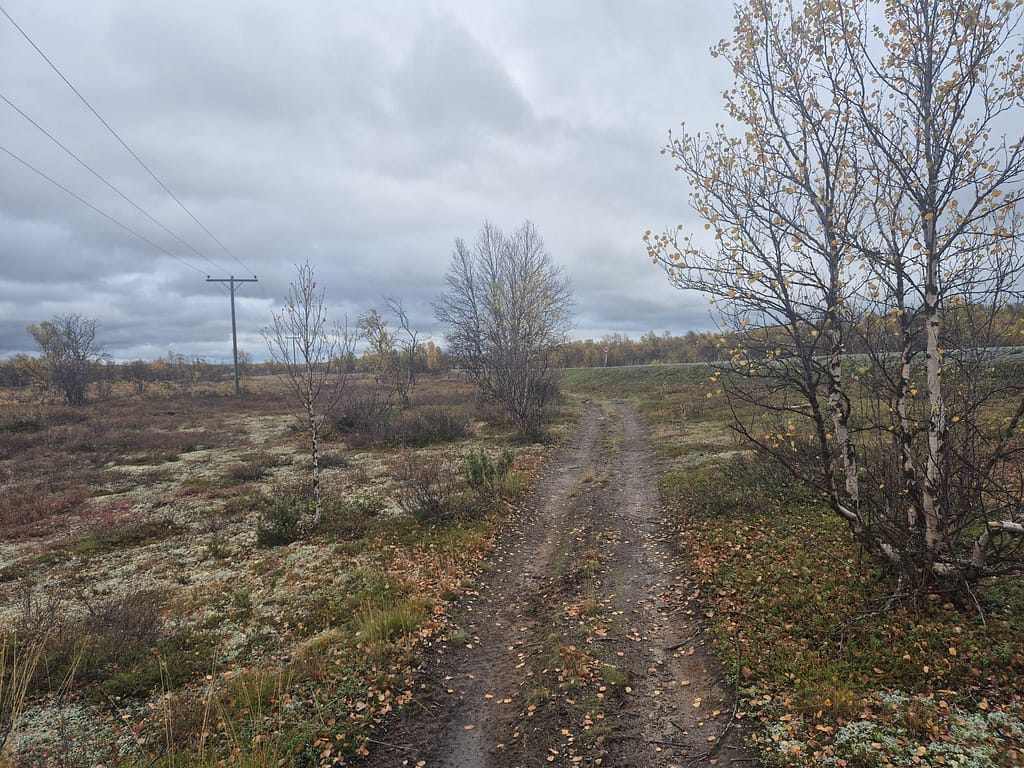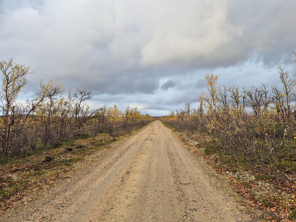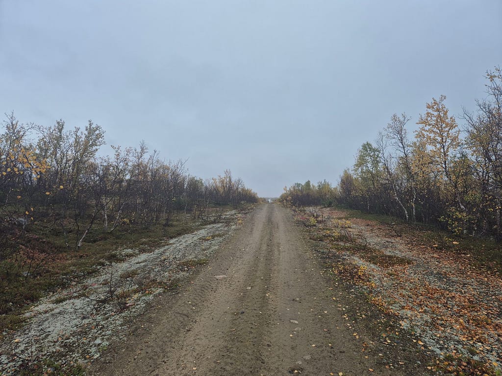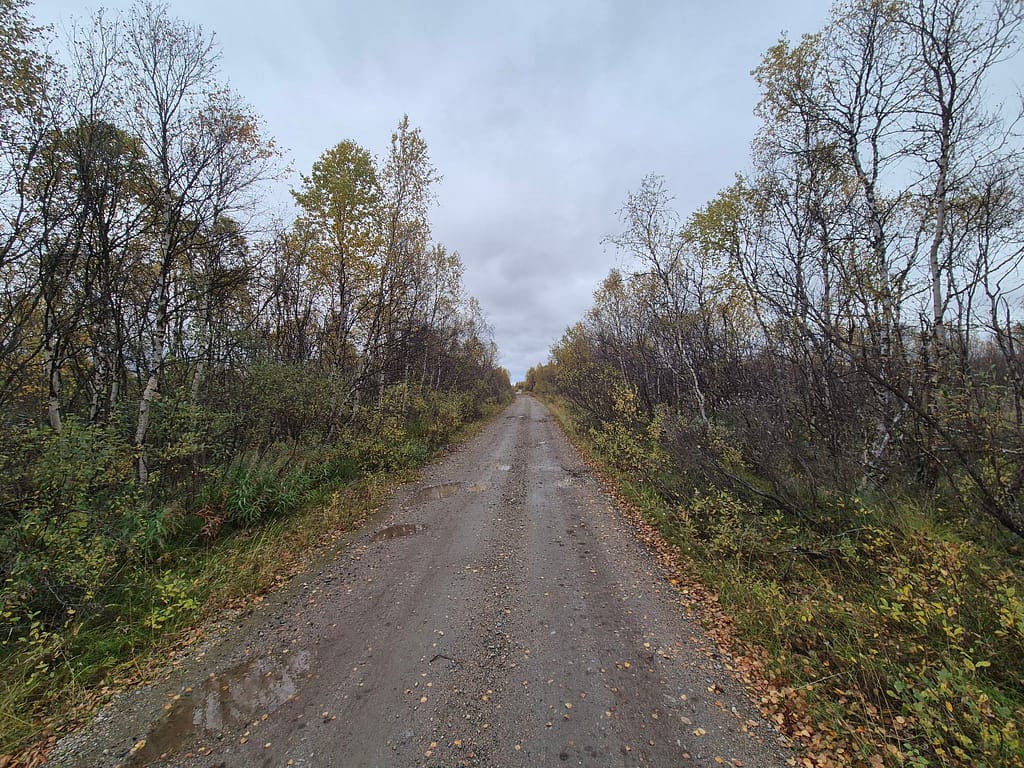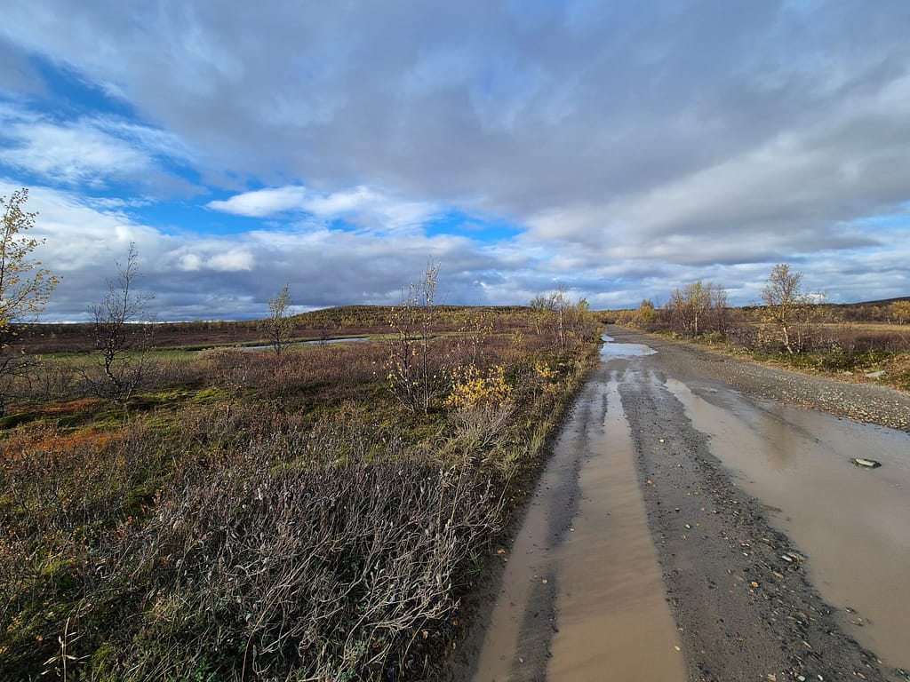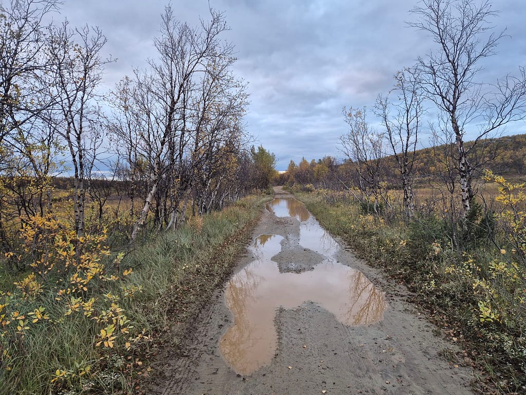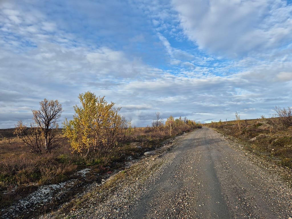 På vei ut fra Kautokeino fulgte jeg en del småveier, og havnet etterhvert på grusvei. Det gikk stort sett raskt å gå, men det var store vanndammer enkelte steder som ikke kunne gås rundt. Det var da bare å si farvell til tørre sko og plaske igjennom søla. Det var ellers ganske ensformig terreng med grusvei i lav bjørkeskog. Jeg slo opp teltet ved en elv nær Skárrejárvi.
