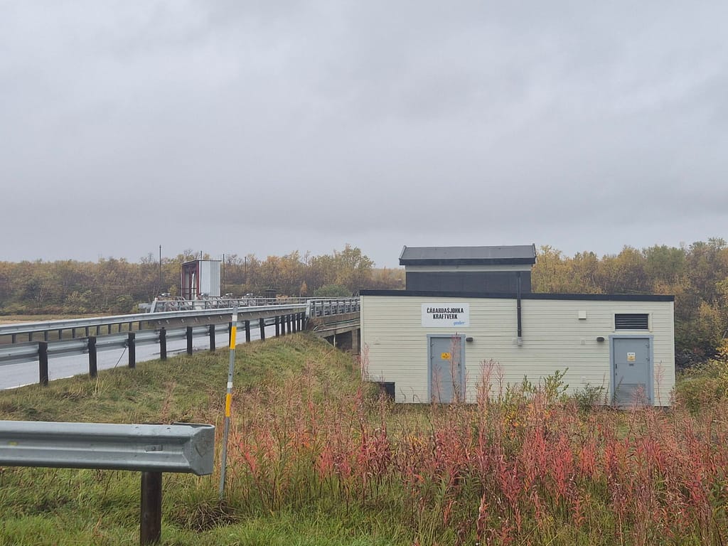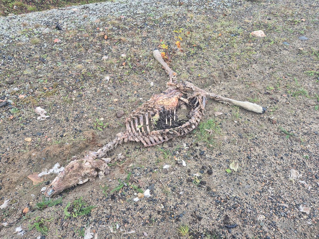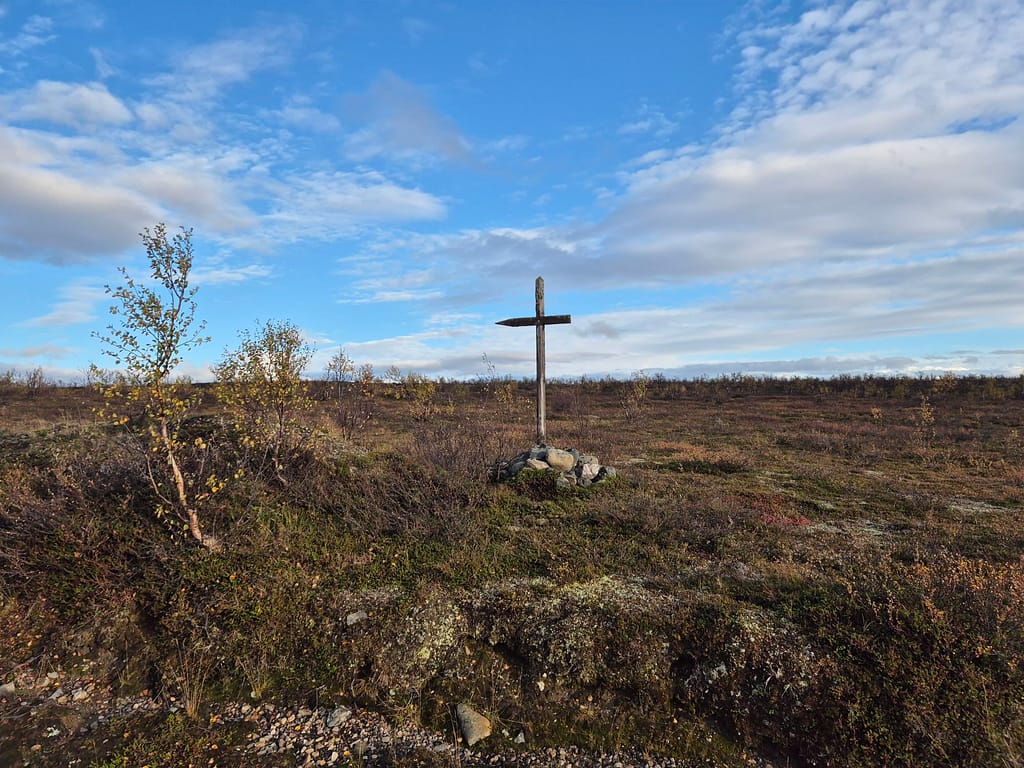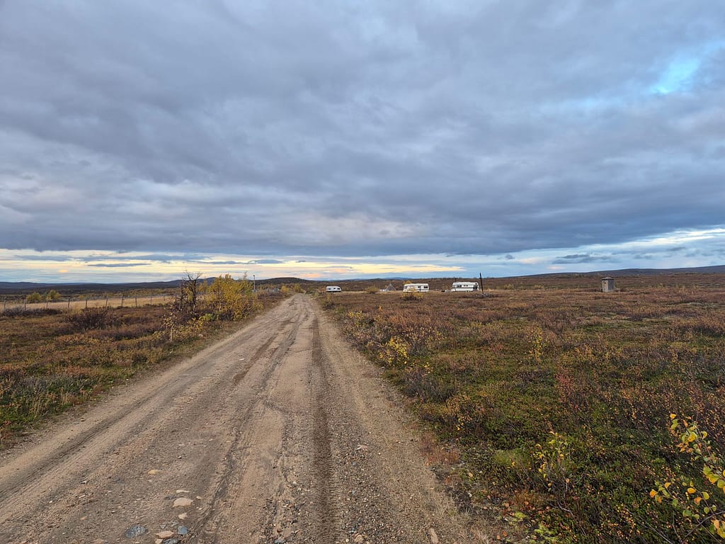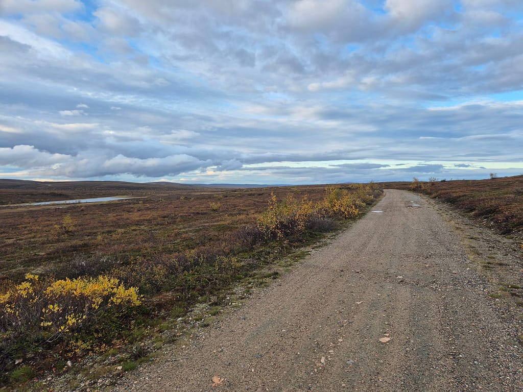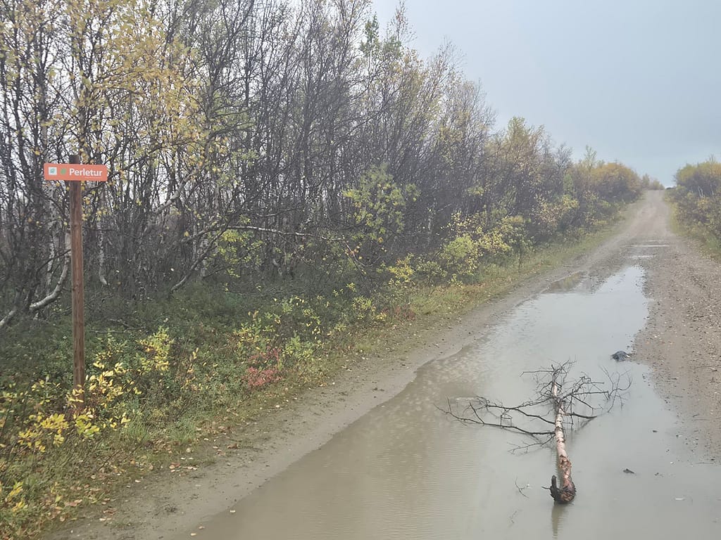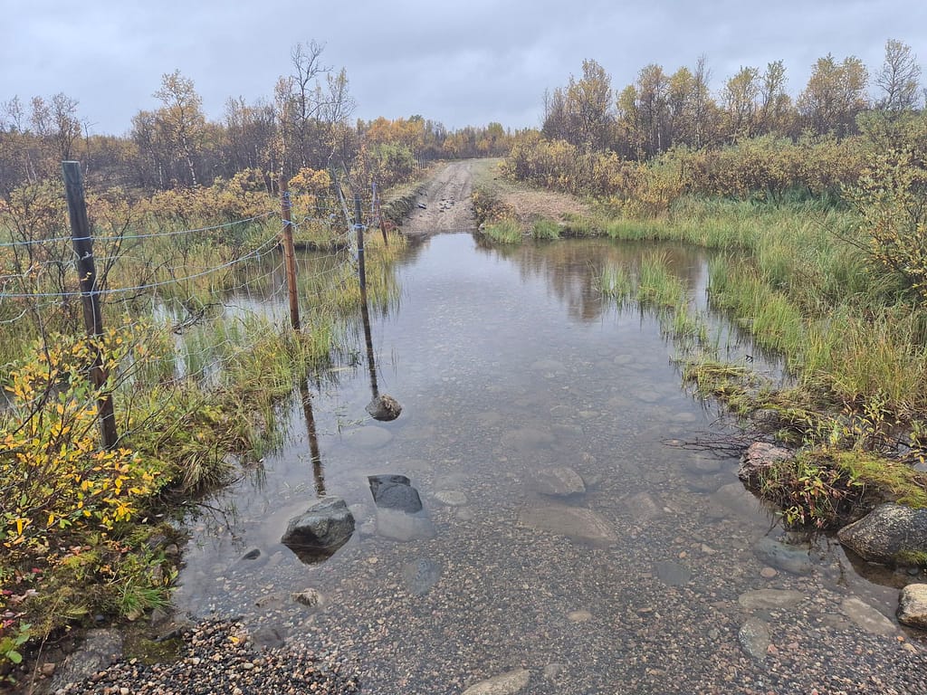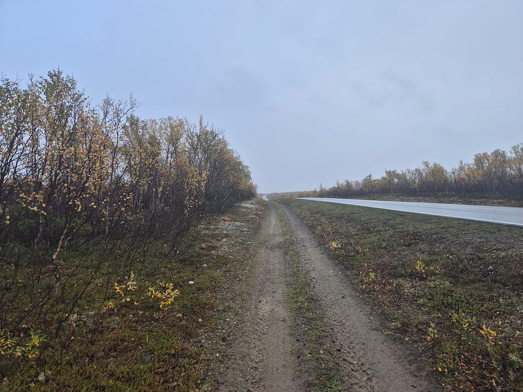 På vei ut fra Kautokeino fulgte jeg en del småveier, og havnet etterhvert på grusvei. Det gikk stort sett raskt å gå, men det var store vanndammer enkelte steder som ikke kunne gås rundt. Det var da bare å si farvell til tørre sko og plaske igjennom søla. Det var ellers ganske ensformig terreng med grusvei i lav bjørkeskog. Jeg slo opp teltet ved en elv nær Skárrejárvi.