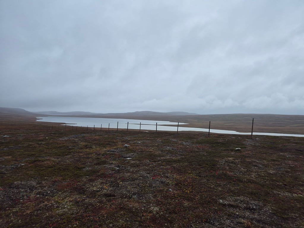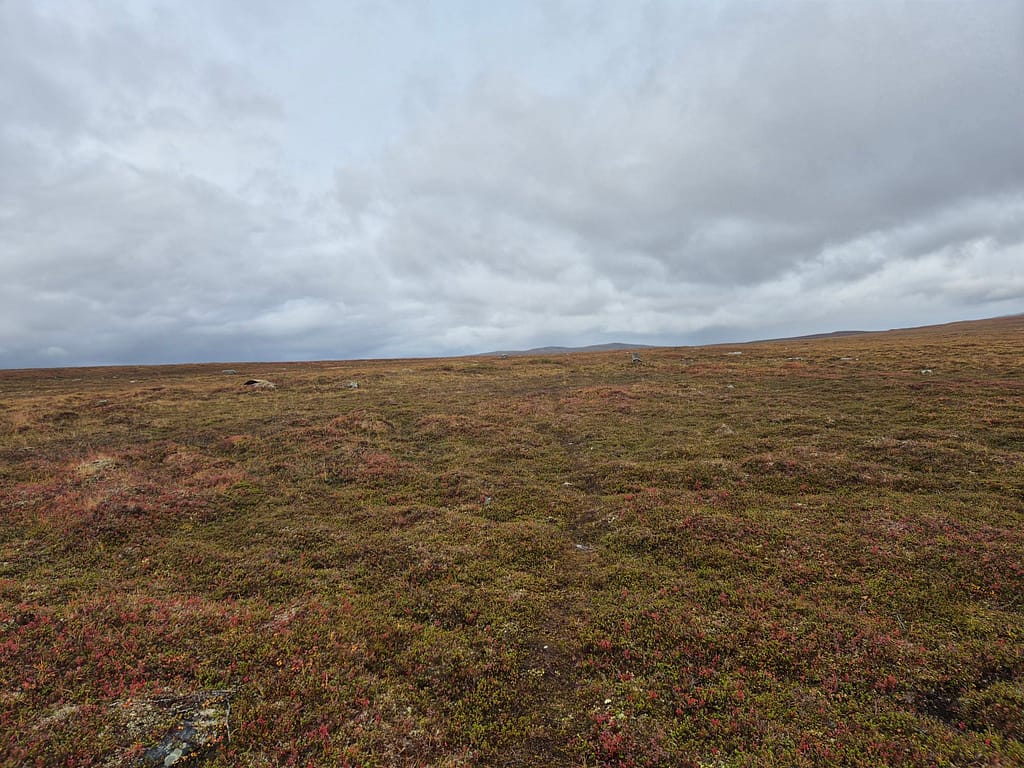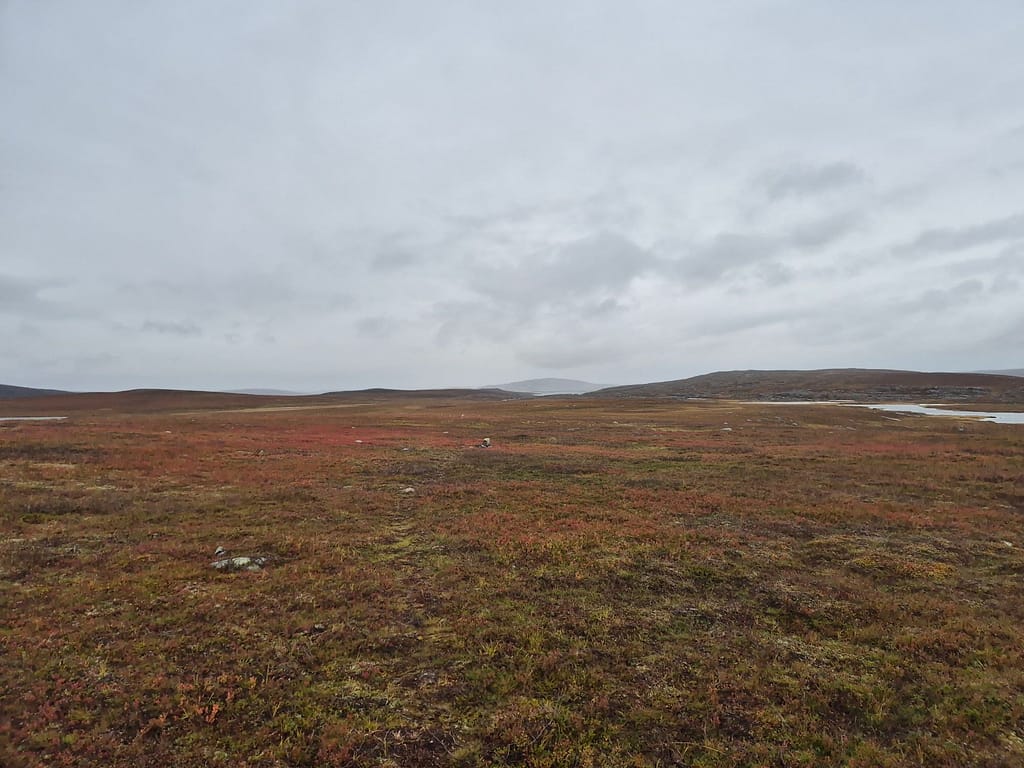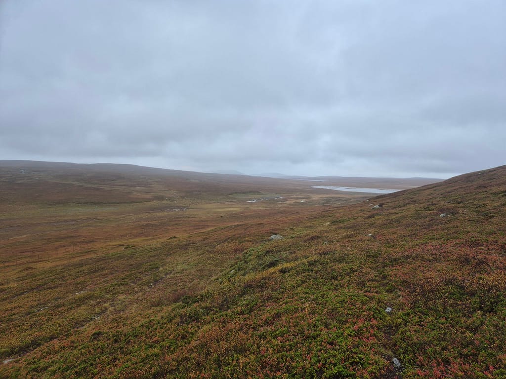I dag våknet jeg halvvåt og kald. Det var en del vind og regn så teltet ble pakket fort sammen. Med regn og sterk vind stort sett hele dagen så ble det å holde seg i kontinuerlig bevegelse. Stiene ble enda vanskeligere å følge i dag og jeg brukte en del tid på å lete etter den. Spesielt i myeområder kan det være større avstander hvor det er lite tegn på varder eller spor.