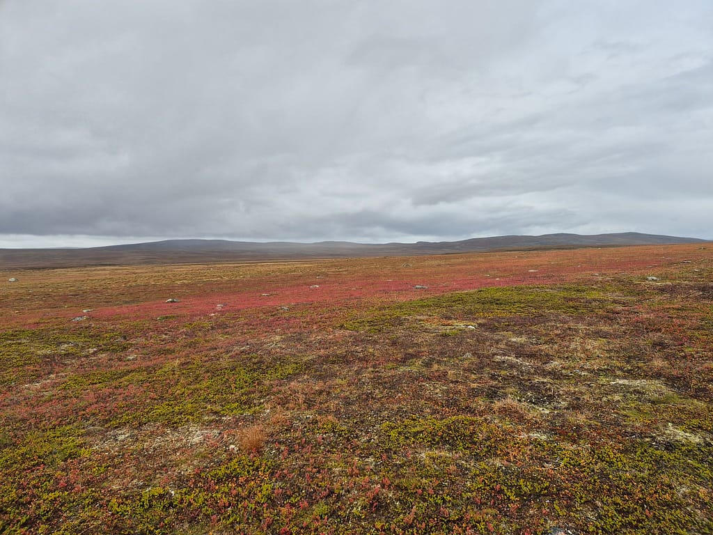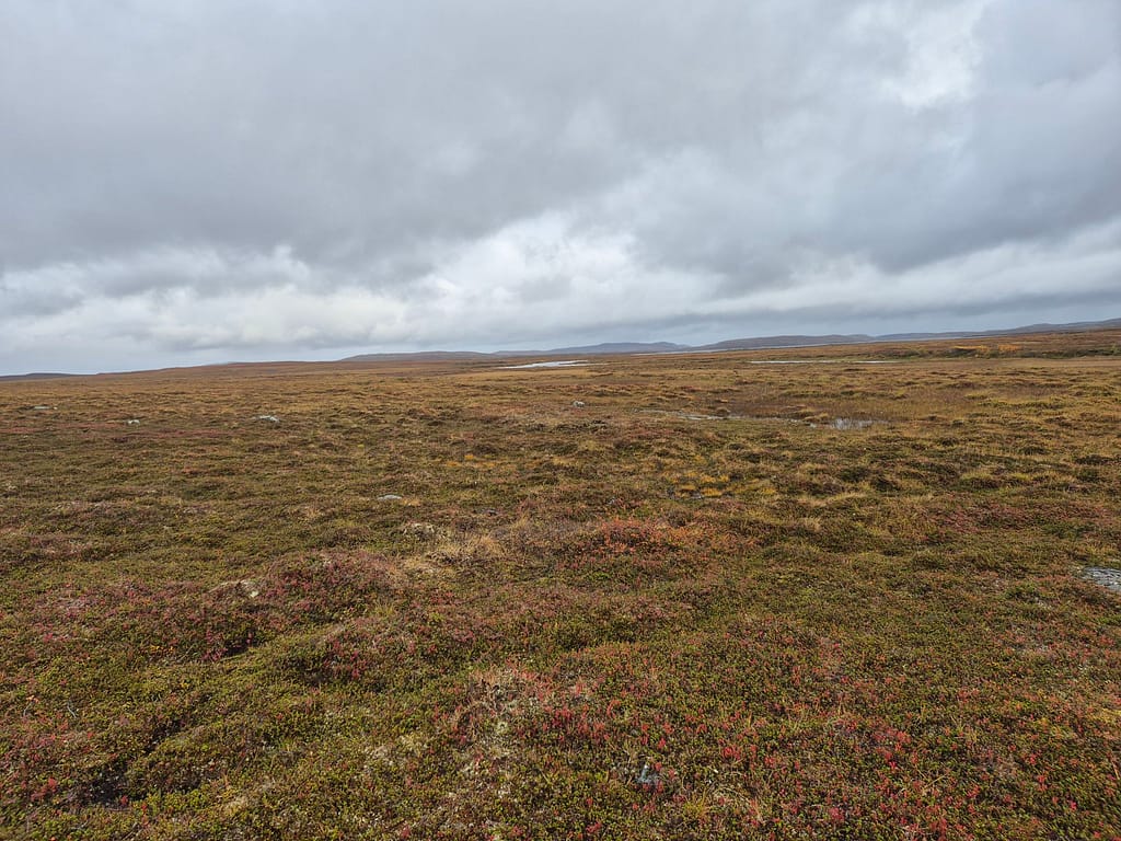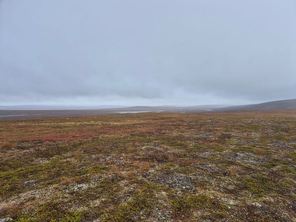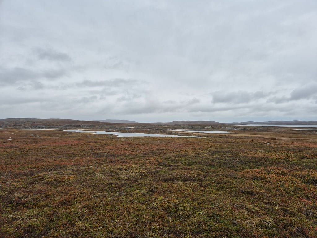I dag våknet jeg halvvåt og kald. Det var en del vind og regn så teltet ble pakket fort sammen. Med regn og sterk vind stort sett hele dagen så ble det å holde seg i kontinuerlig bevegelse. Stiene ble enda vanskeligere å følge i dag og jeg brukte en del tid på å lete etter den. Spesielt i myeområder kan det være større avstander hvor det er lite tegn på varder eller spor.