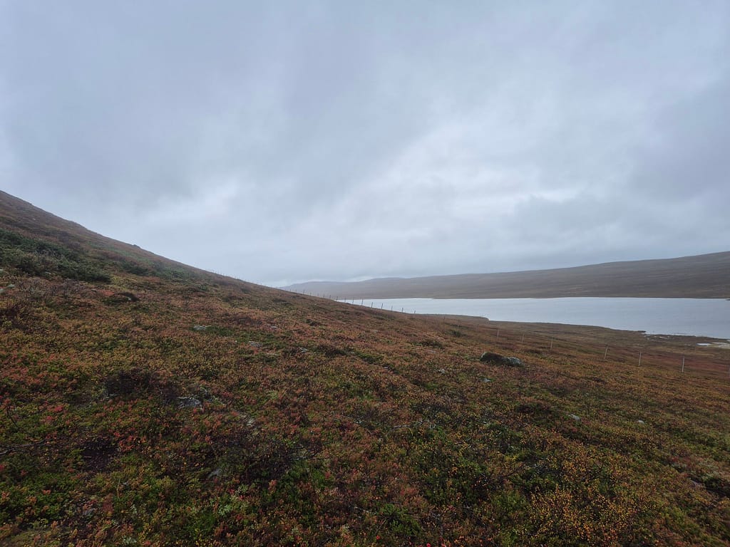 På ettermiddagen var jeg veldig kald. I tillegg var synet blitt veldig tåkete. Det er antakeligvis tørre øyne, men jeg får ikke gjort noe med det nå. Tåkete, kaldt og vått vær gjorde ikke saken bedre. Det ble etterhvert veldig vanskelig å se sti og varder. På dette tidspunktet fant jeg første aktuelle teltplass nær vann og ga meg for dagen.