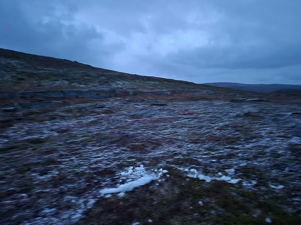 Det var ikke noe særlig å vokne til dette. Ute er det helt bekmørkt. I dette været var det håpløst å få stabilisert teltet. Etter et mislykket forsøk så endte jeg opp med å bruke teltet som vindsekk og vente til kl. 05 hvor det ble antydninger til lys på himmelen. Jeg pakket sammen det meste og ble sittende å vente fult påkledd. Allerede ganske våt ble det et par kalde timer.