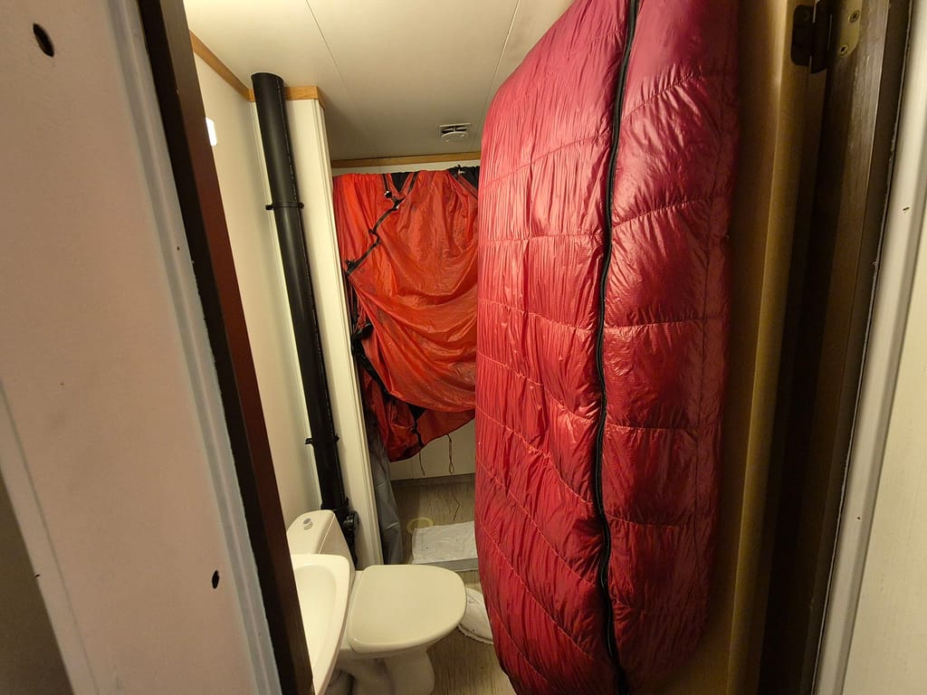 Jeg sjekket inn på et hotellrom på Olderfjord turistsenter. Dette er helt enkel standard, ingen frokost. Planen var å tørke så mye utstyr jeg kunne. Det var en panelovn på rommet og en på badet som ble satt på maks. Med kreative løsninger for opphenging fikk jeg hengt opp og tørket alt. Jeg vasket også litt klær, og fikk tatt meg en etterlengtet dusj. Det var helt fantastisk. For å rekke å få tørket alt over natta ble det badstu på rommet.