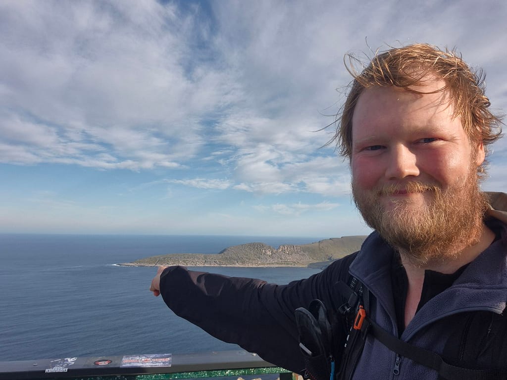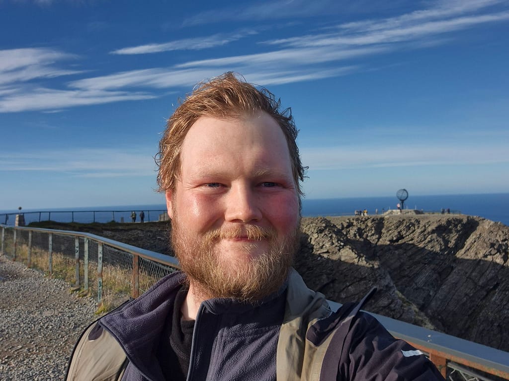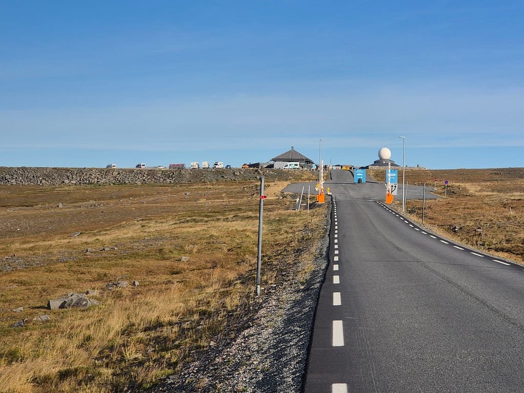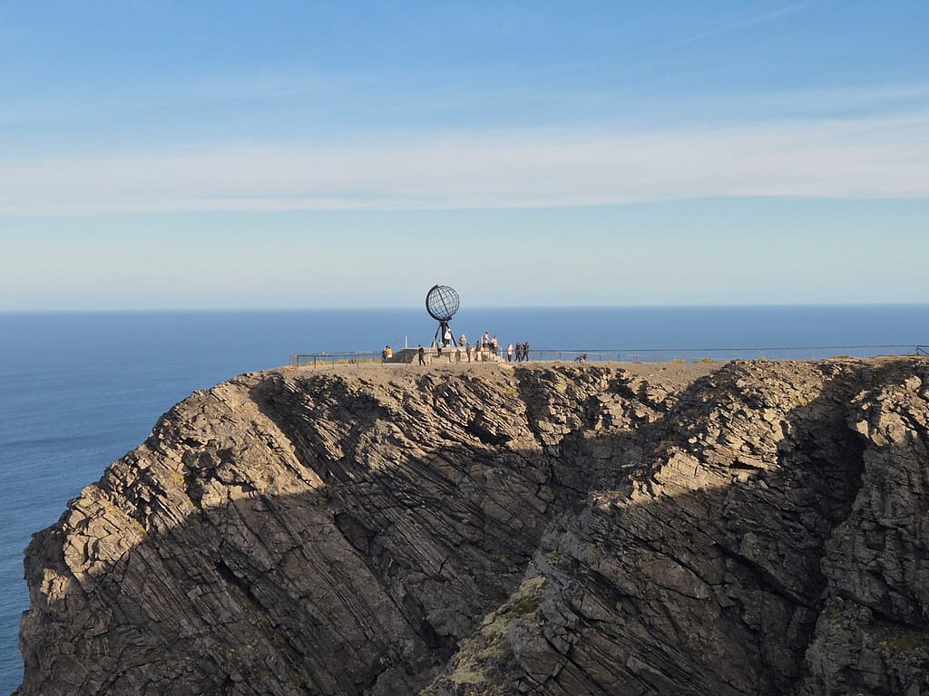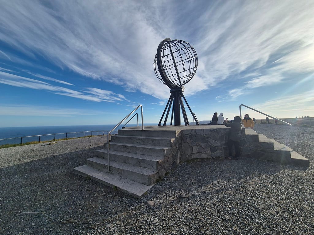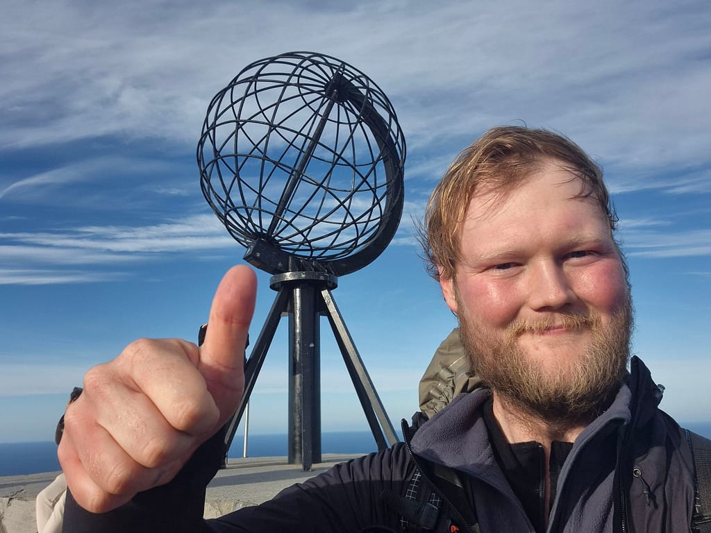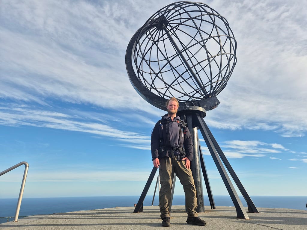 Siden jeg startet tidlig, møtte jeg få mennesker før jeg nærmet meg parkeringsplassen. Der kastet jeg det siste søppelet i en container før jeg fortsatte den siste biten opp til Nordkapplatået. Etter bare noen timer på vei sto jeg plutselig der. Jeg tok de obligatoriske bildene ved metallglobusen – et synlig bevis på at målet var nådd.