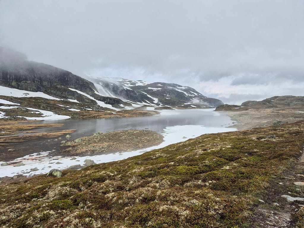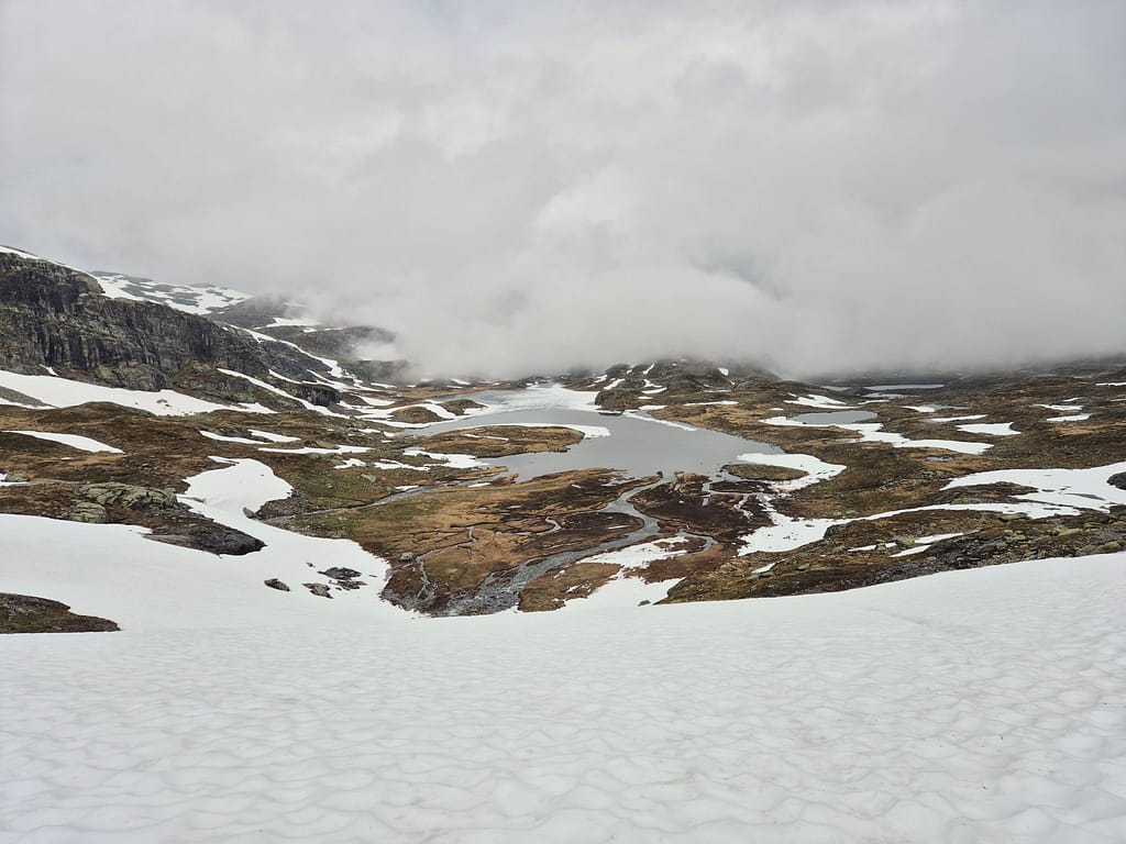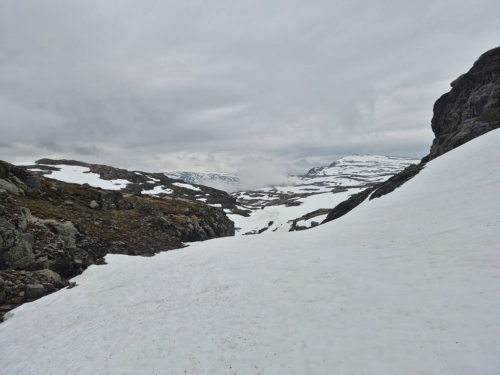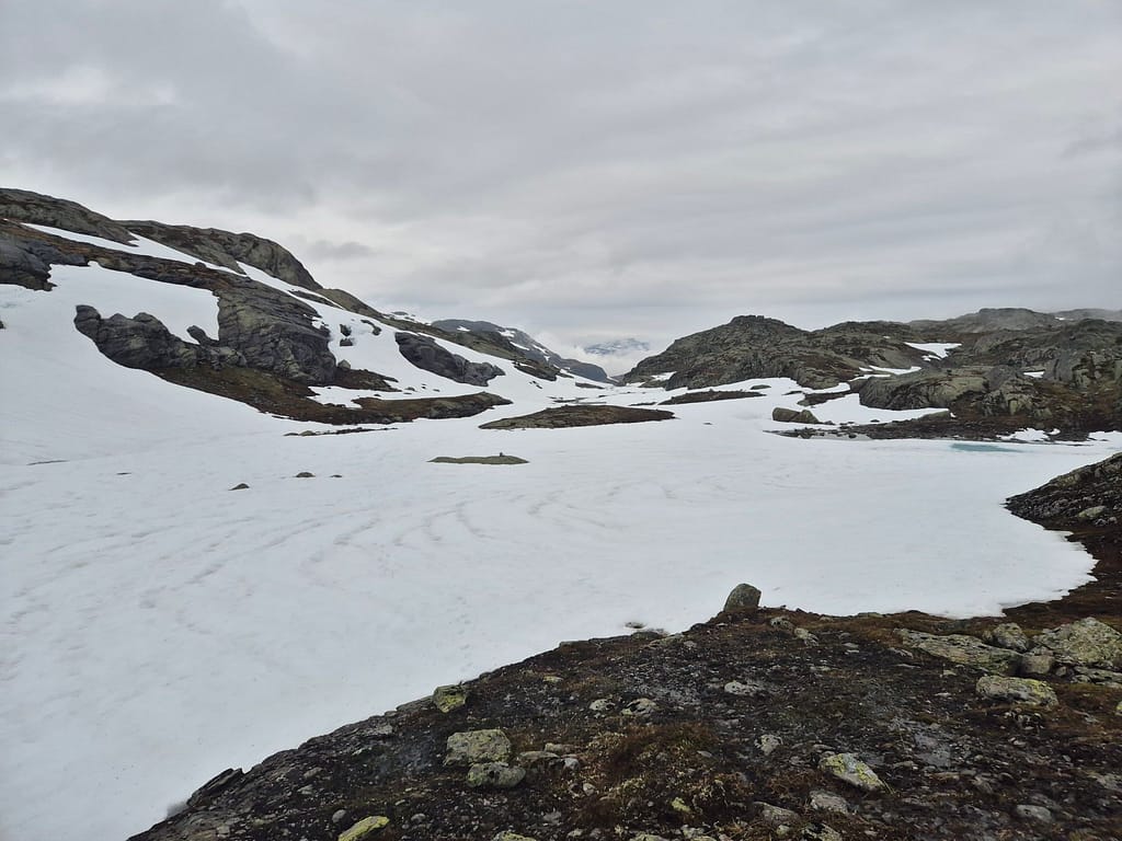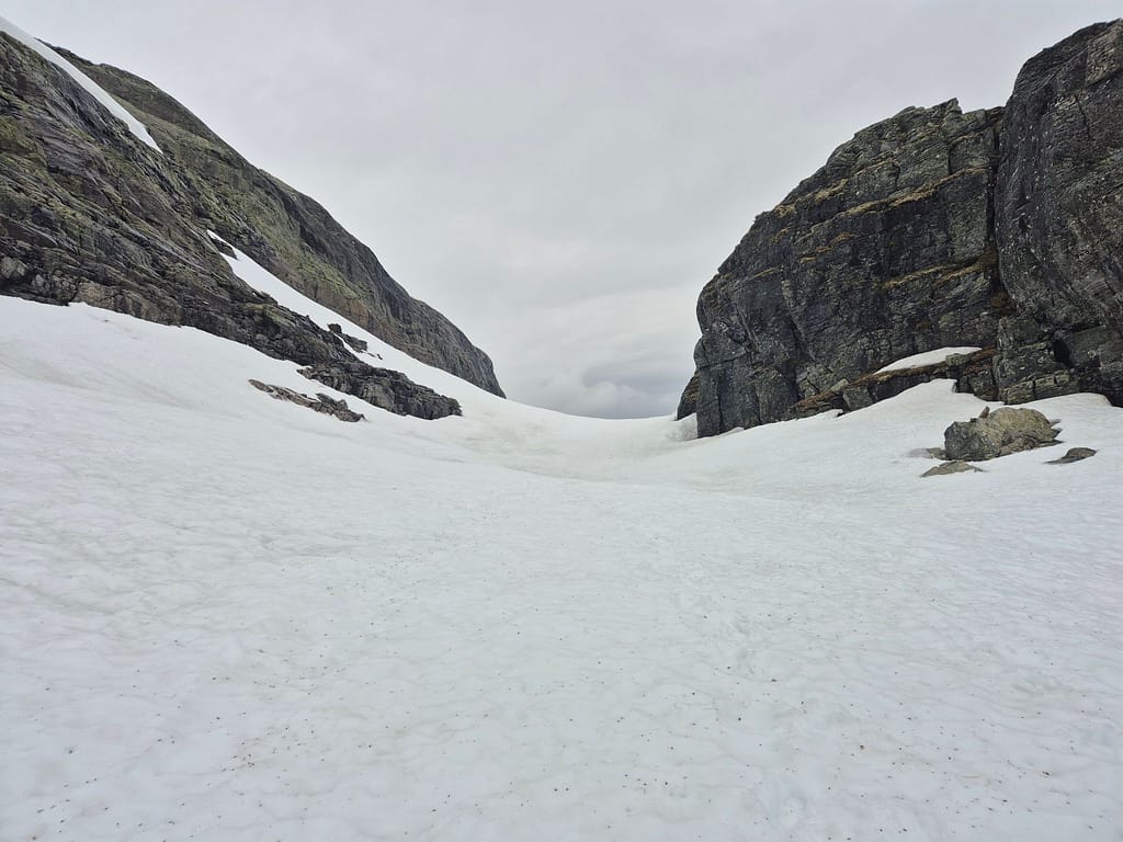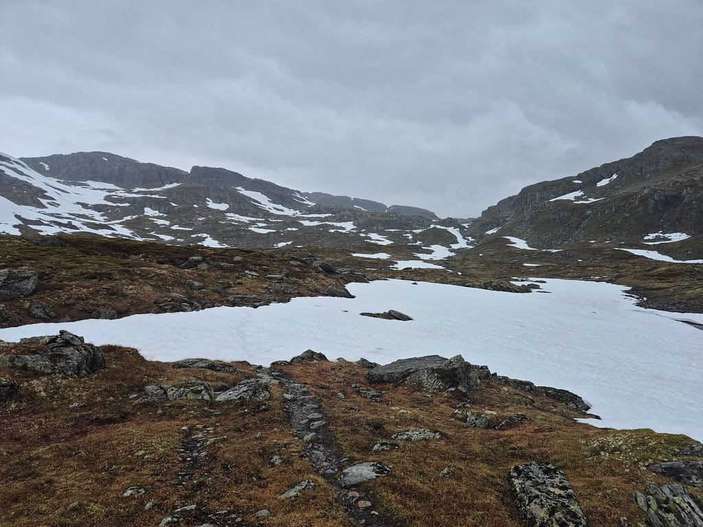 Etter et par timers gange så nærmet jeg meg det høyeste punktet Turistskaret som ligger på 1350 moh. Plutselig kom det et torden. Jeg så ikke lynet så antar at det var et stykke unna. Likevell var jeg ikke så høy i hatten der jeg sto på det høyeste punktet. Det var også en del snø i skaret.