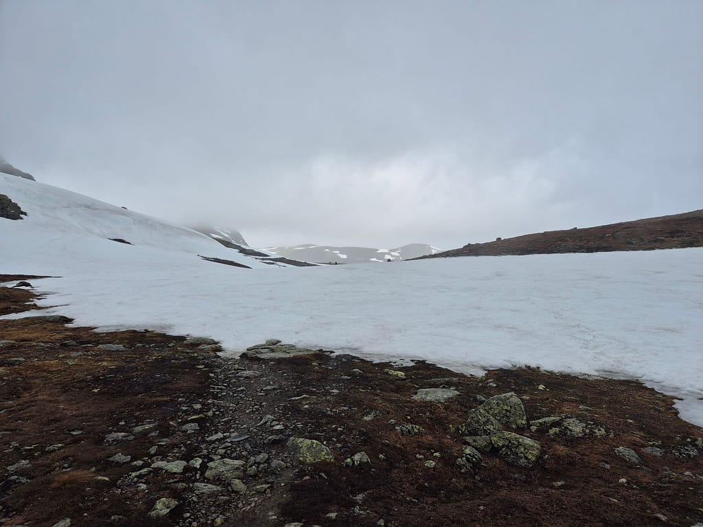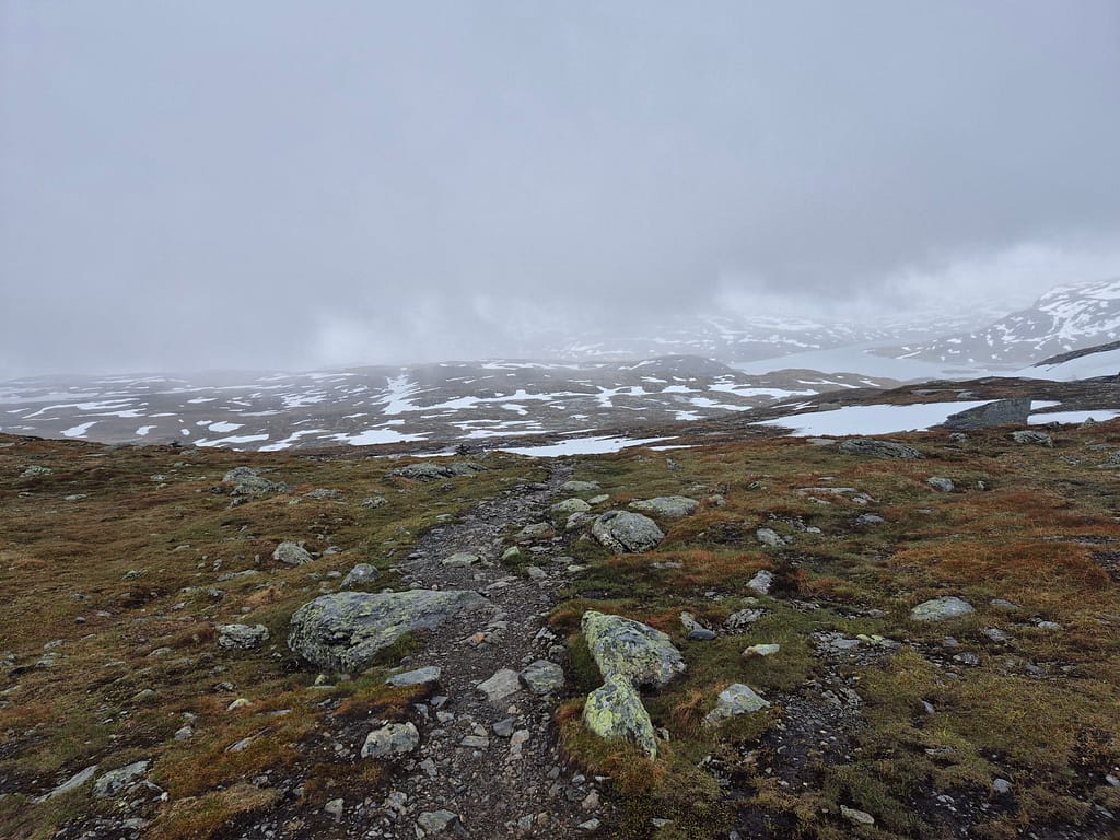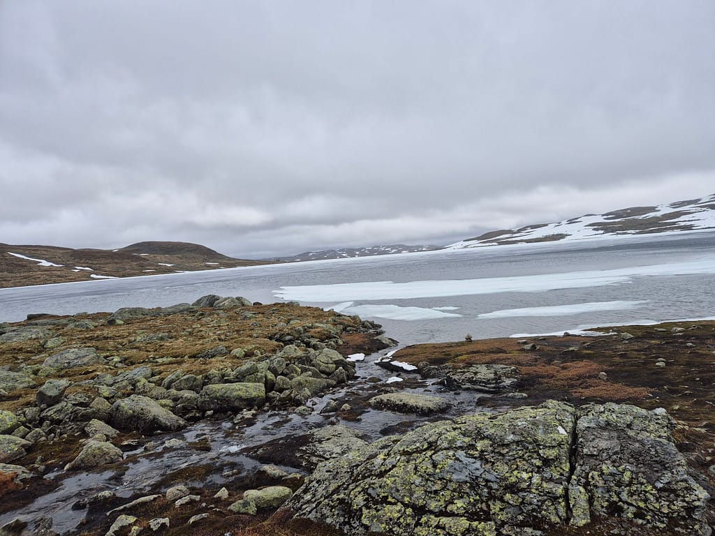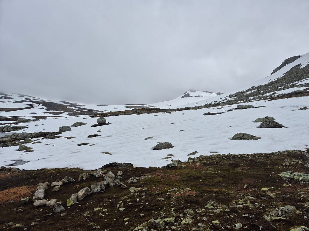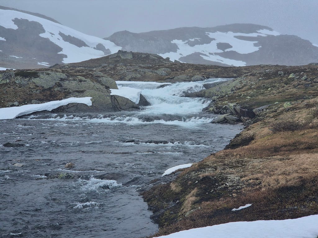 På grunn av regnet et det små bekker i alt av stier. Underlaget blir også stadig mer gjørmete. Dette i kombinasjon med delvis snødekte områder ble starten på vidda. Jeg blir veldig spent på hva som venter meg nærmere Finse.