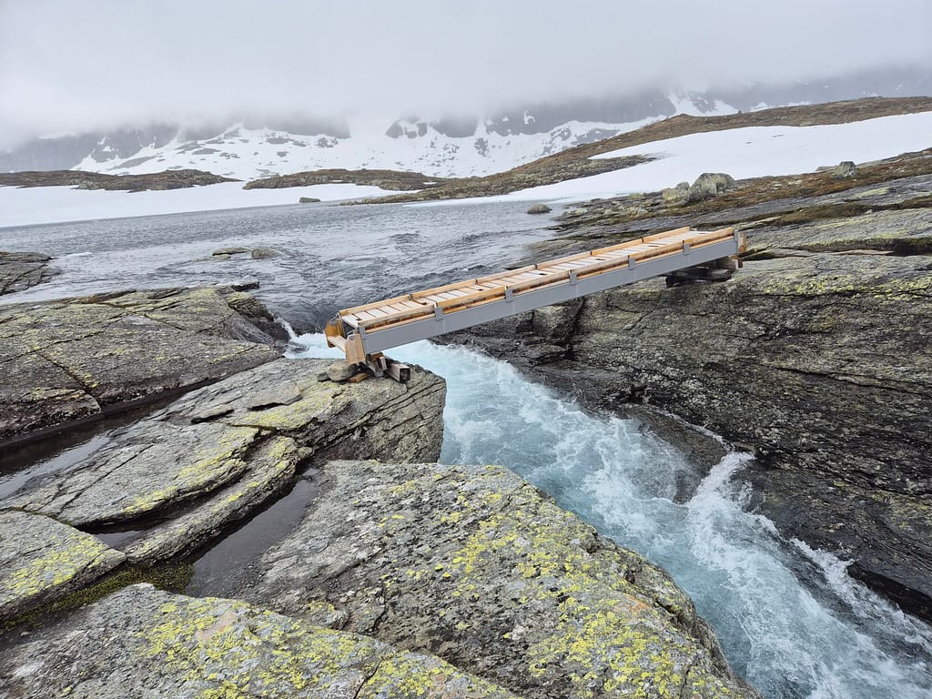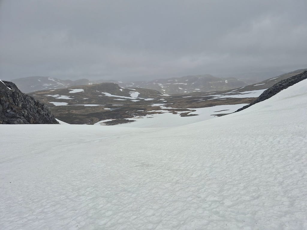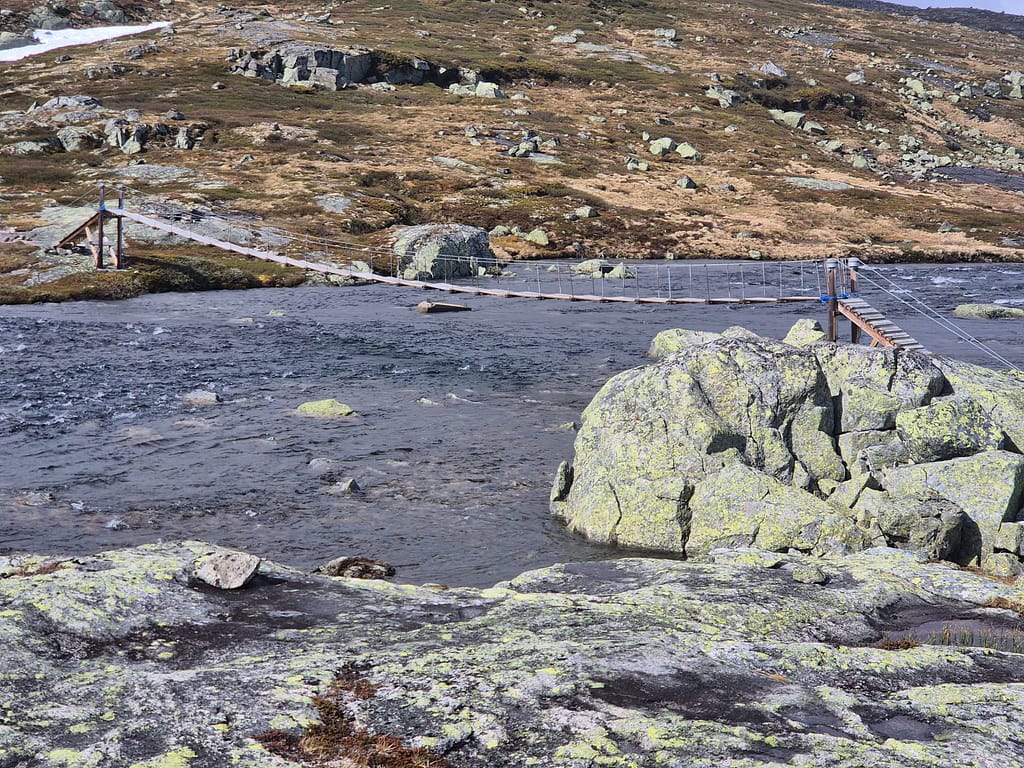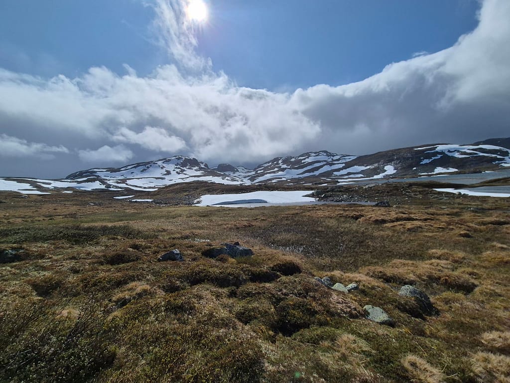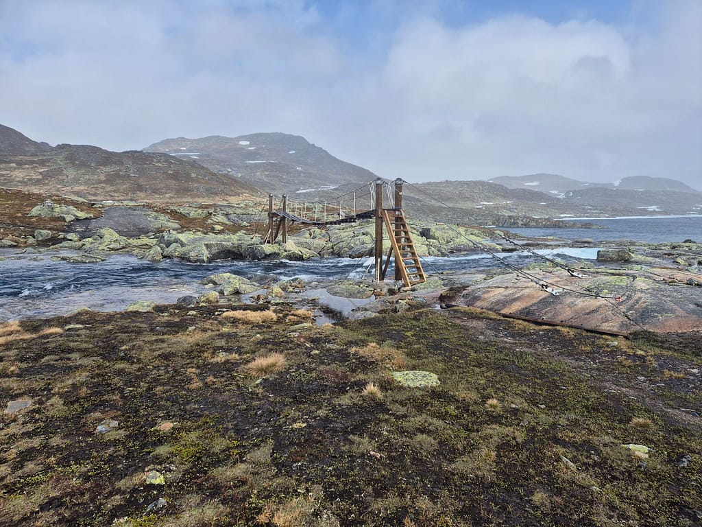 På grunn av regnet et det små bekker i alt av stier. Underlaget blir også stadig mer gjørmete. Dette i kombinasjon med delvis snødekte områder ble starten på vidda. Jeg blir veldig spent på hva som venter meg nærmere Finse.