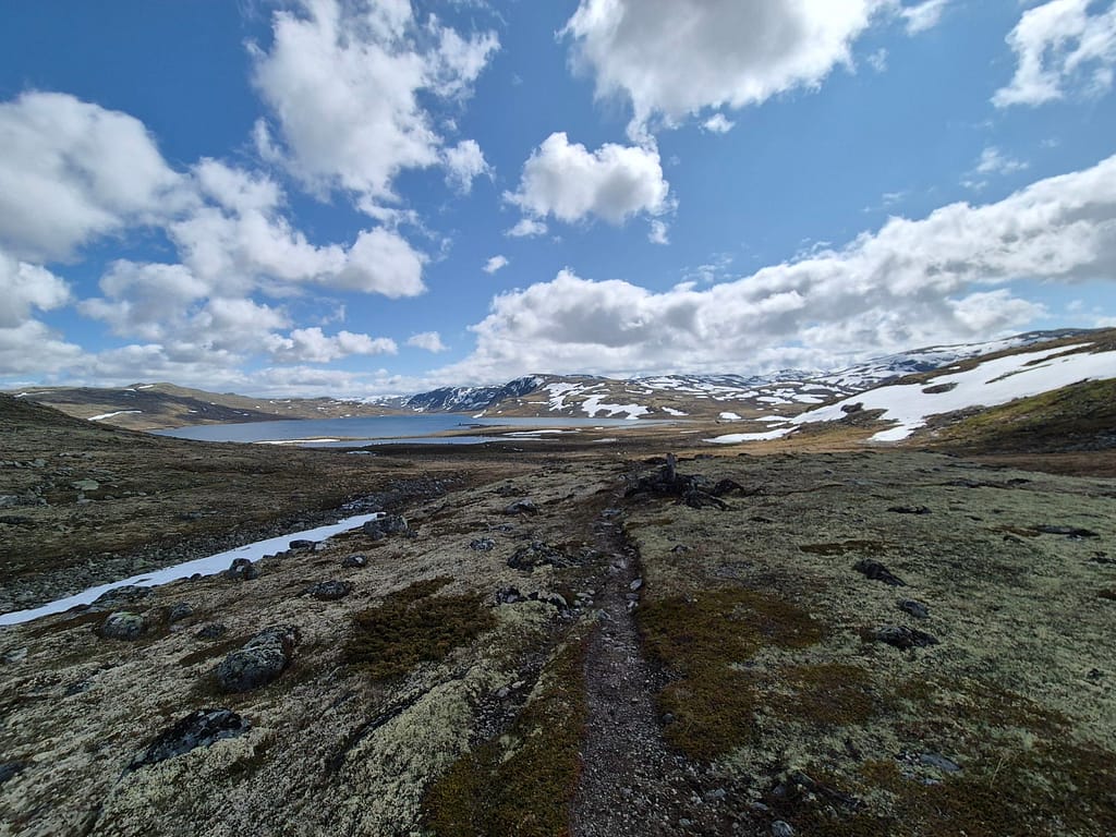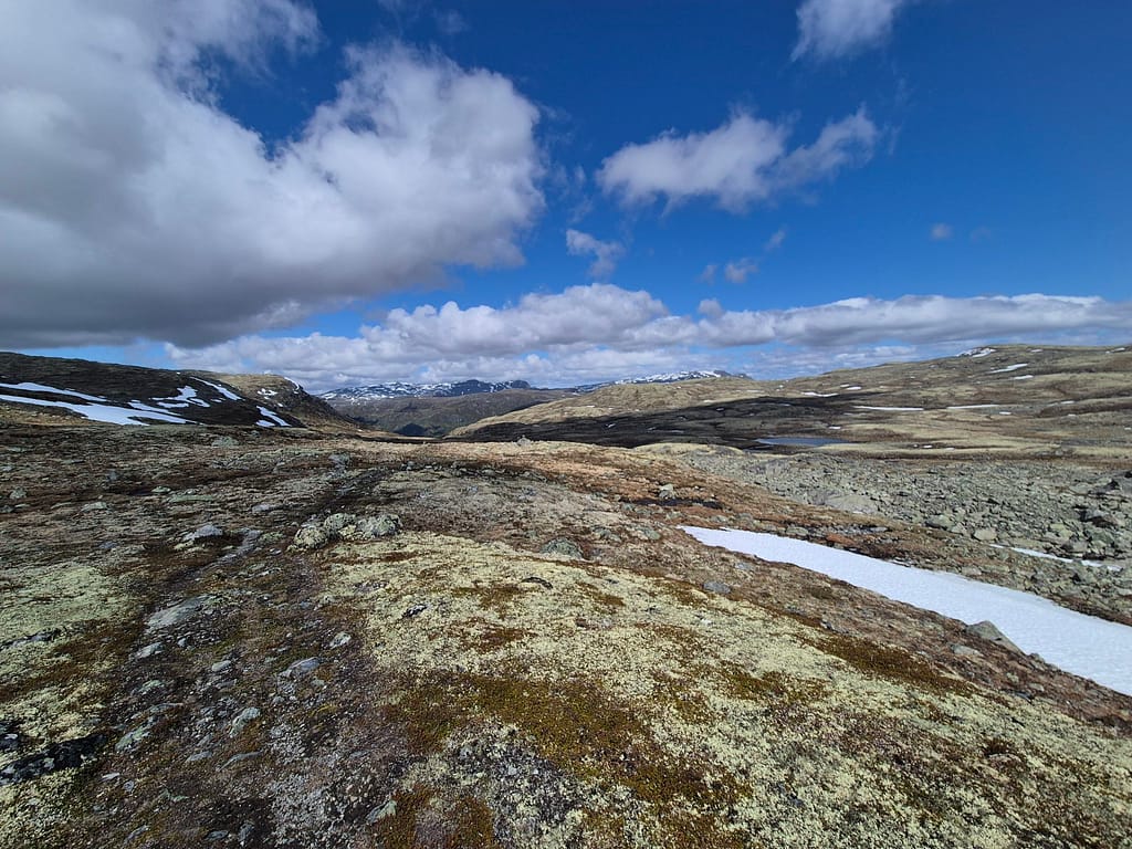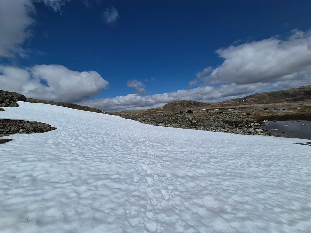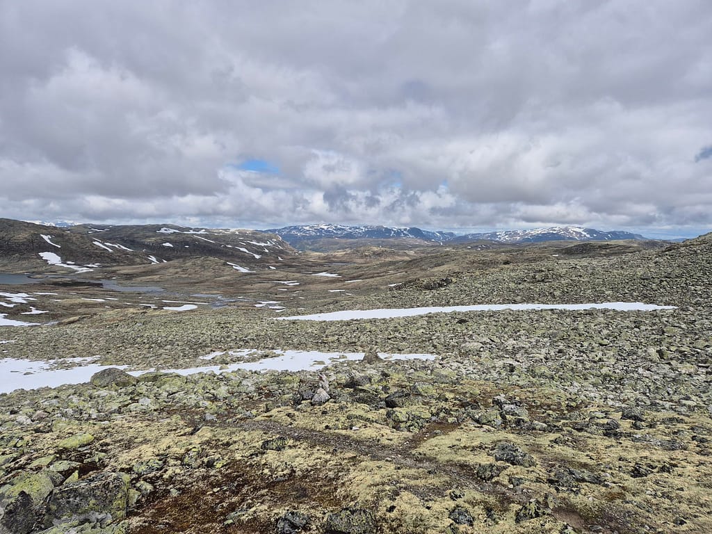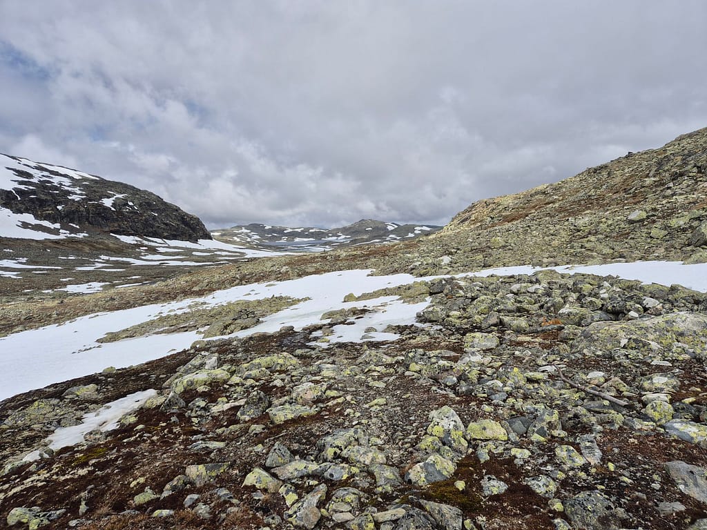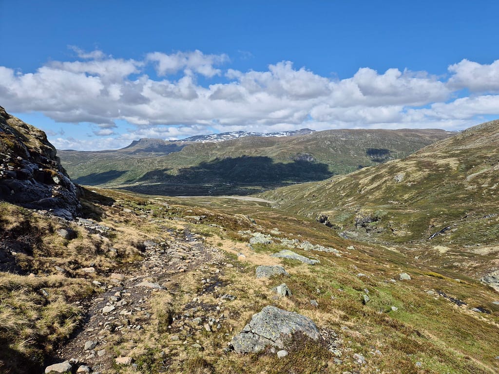 I dag var det fint vær og det skulle bli en kort tur ned til DNT Hytta Skarvheim. Det ble en del steinur i starten og flekkevis snø før jeg møtte mer normale stier i dalen ned mot hytta. Siste biten var det grusvei et lite stykke før jeg møtte på bilveien som var rett ved hytta.