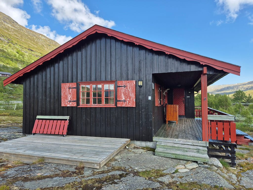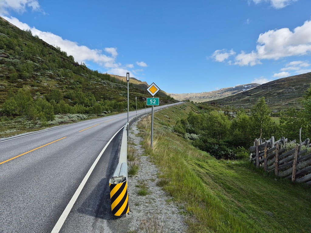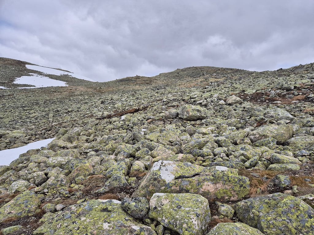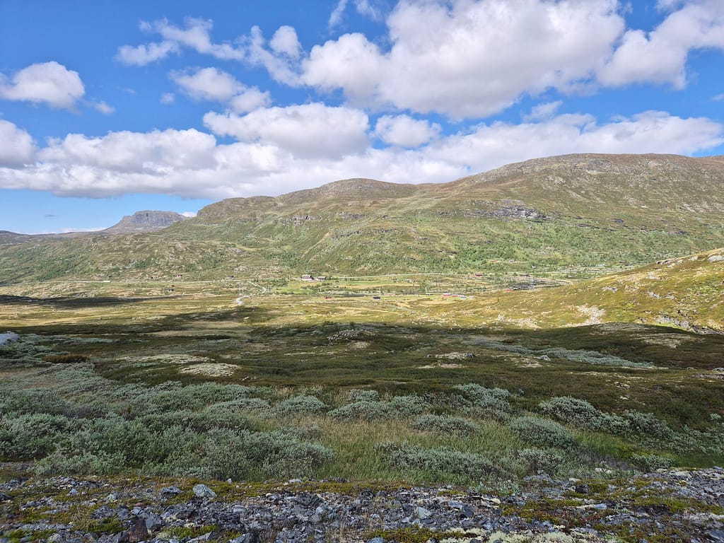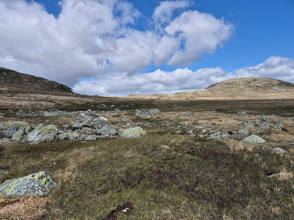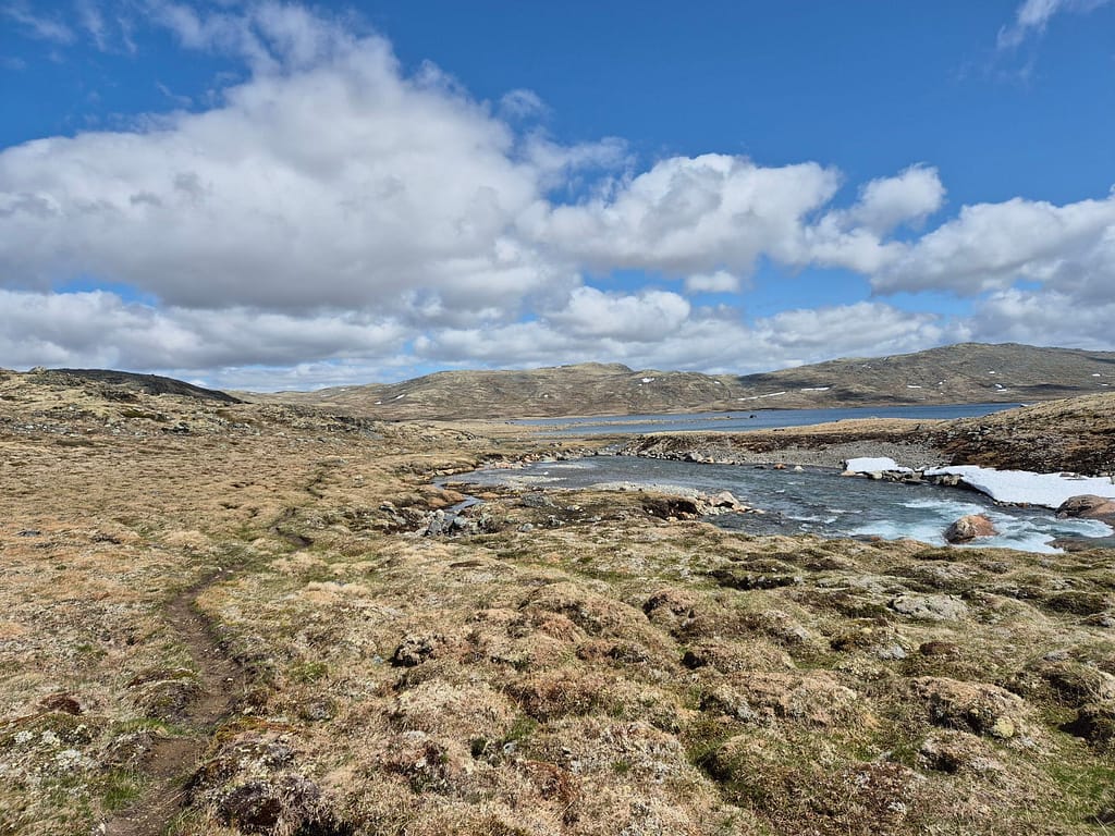 I dag var det fint vær og det skulle bli en kort tur ned til DNT Hytta Skarvheim. Det ble en del steinur i starten og flekkevis snø før jeg møtte mer normale stier i dalen ned mot hytta. Siste biten var det grusvei et lite stykke før jeg møtte på bilveien som var rett ved hytta.