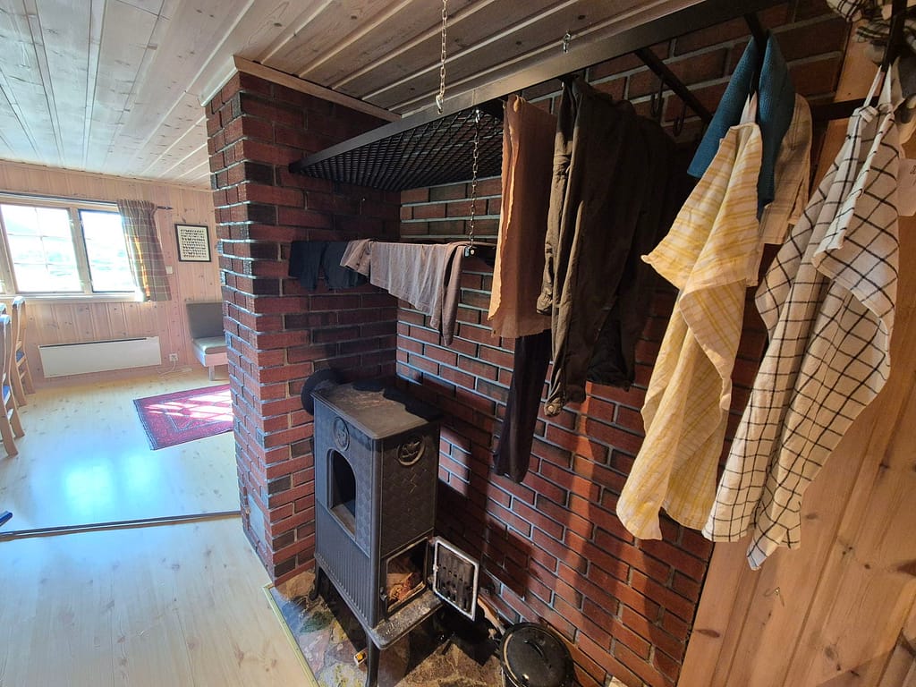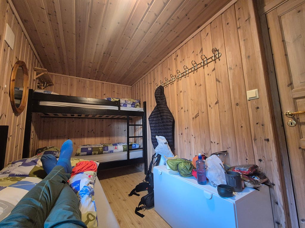 Vel fremme på hytta var jeg første person. Denne hytta hadde jeg gledet meg til ettersom det både er innlagt vann og dusj. Dusjen var helt fantastisk etter flere uker med kun cowboyvask. Klærne ble også vasket i vasken og hengt til tørk. I gangen var det en skotørker som også var veldig luksus.