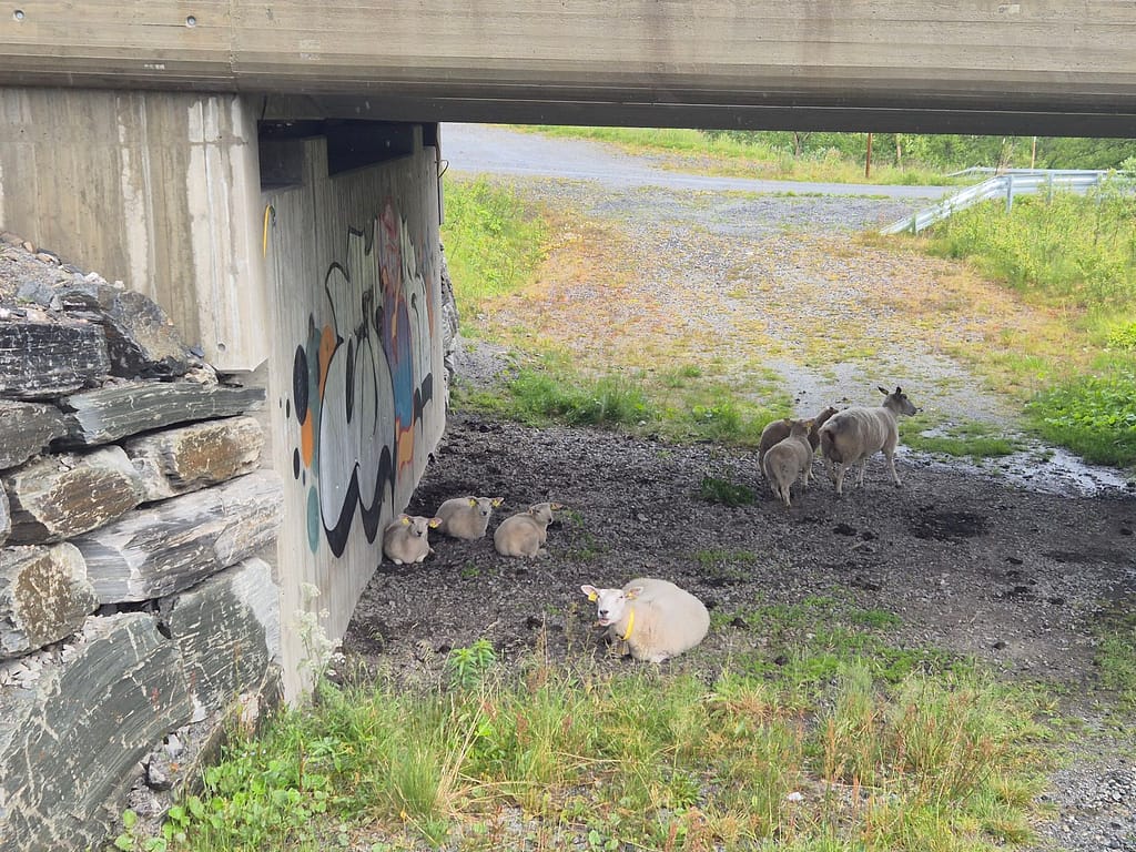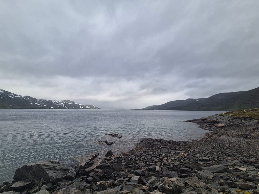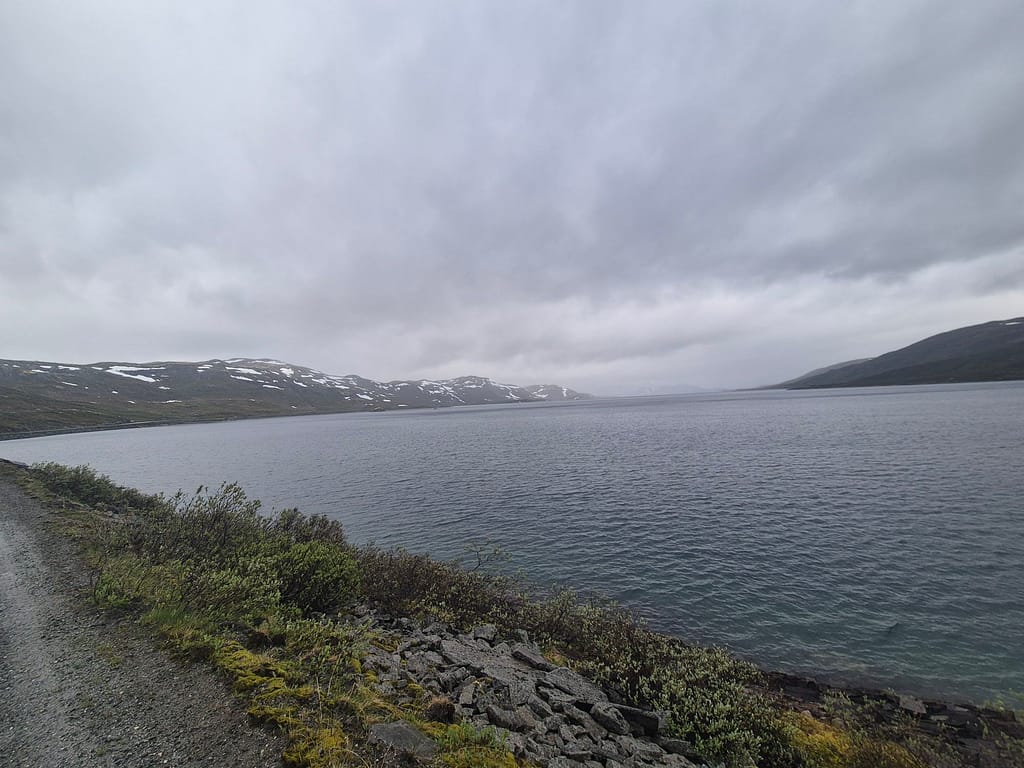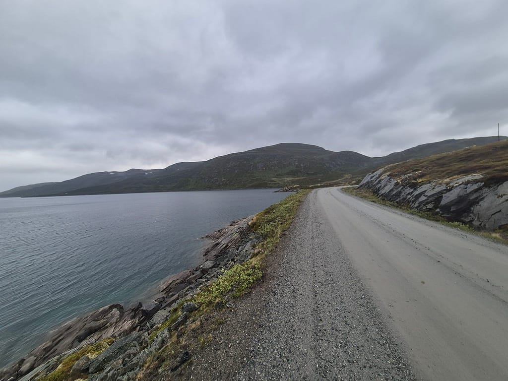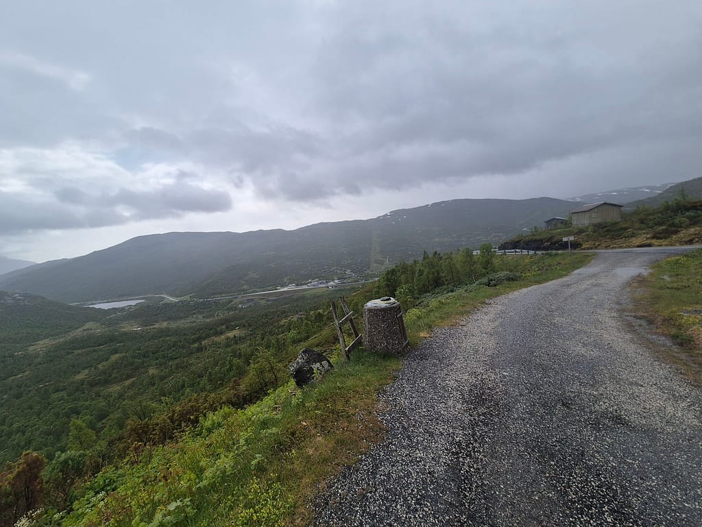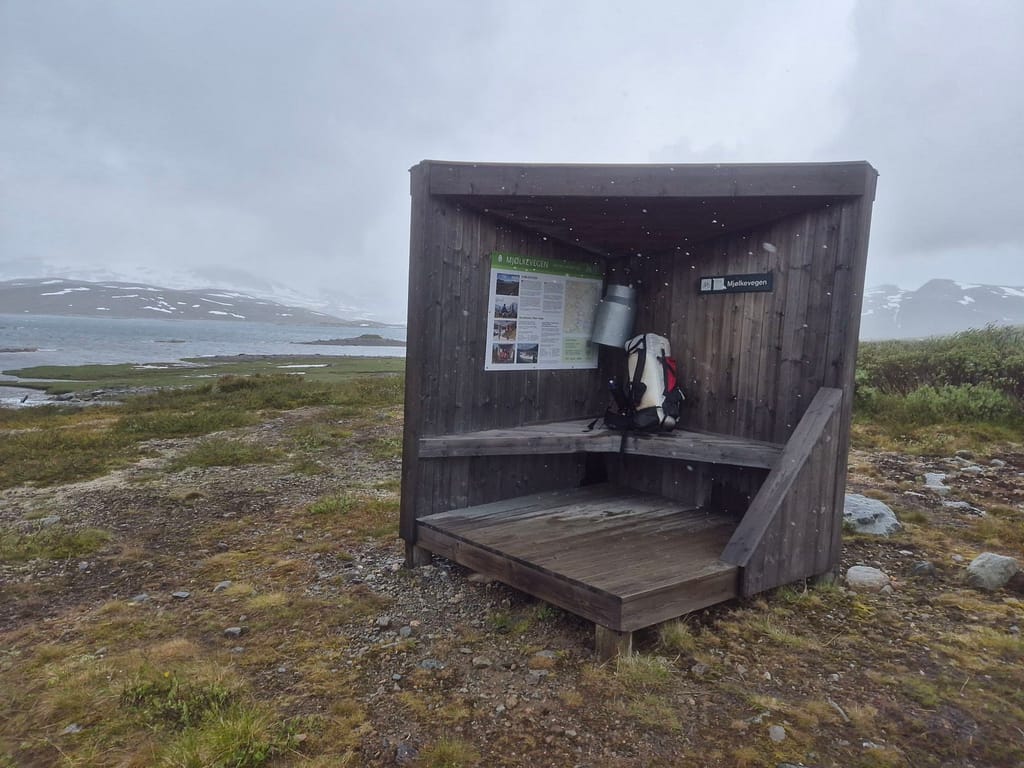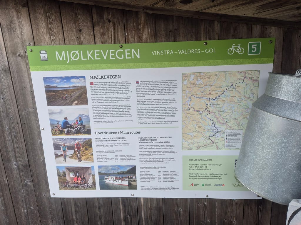 Videre fulgte jeg grusvei rundt østsiden av vannet frem til Tyinholmen. Flere steder var det merkingen av «melkeveien» som skal være en av de vakreste sykkelrutene i landet. Jeg fant ett skur med informasjon om ruten hvor jeg også fikk litt le for været. Dagens etappe gikk svært fort og jeg var tidlig fremme på hytta.