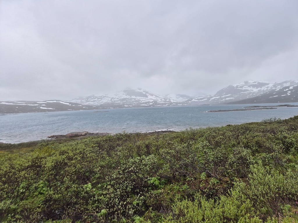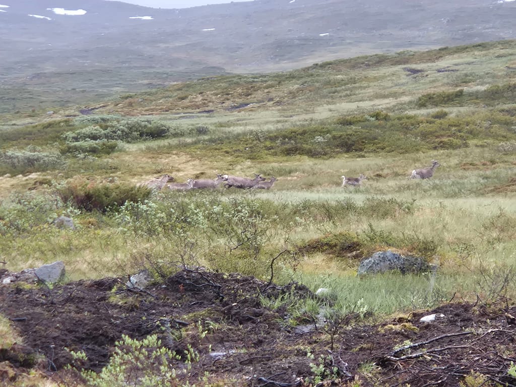 Dagens etappe var en kald og våt fornøyelse. Likevell var det vakker utsikt til tross for både regn og tåke. Etter å ha vinket Martine farvell på busstoppet satte jeg i gang oppover mot innsjøen Tyin. Det ble litt stigning, men farten var god for å holde på varmen. Jeg møtte på en liten reinflokk langs veien og ble stående en stund å se på dem.