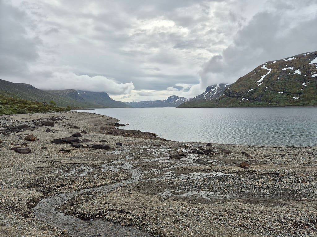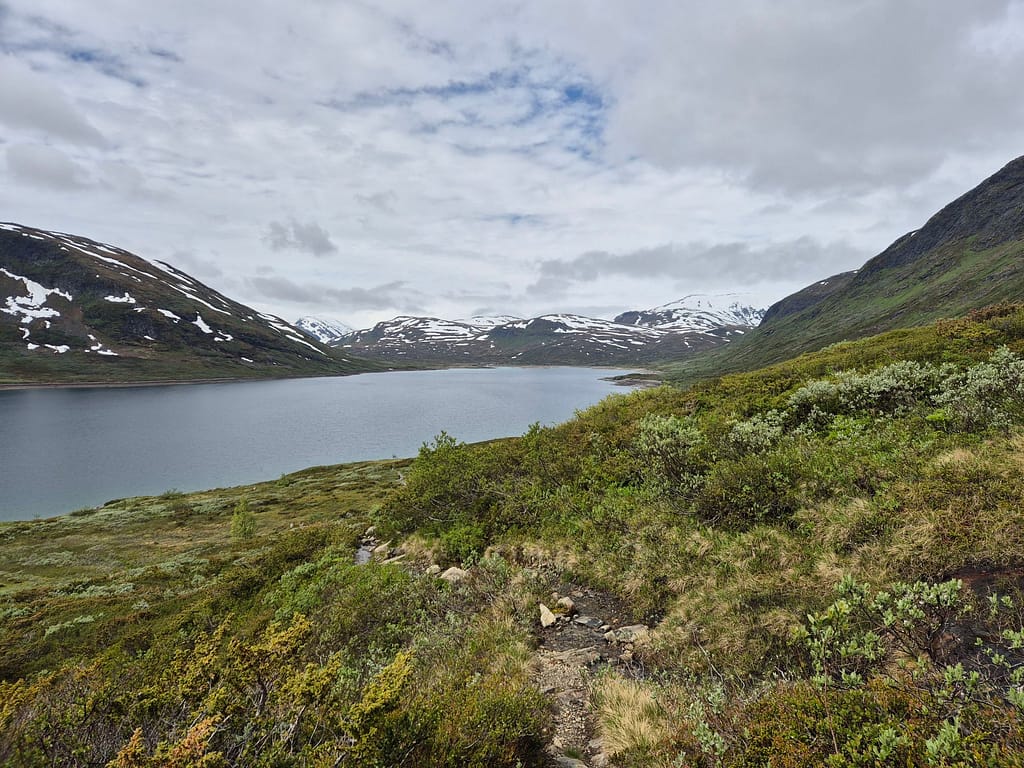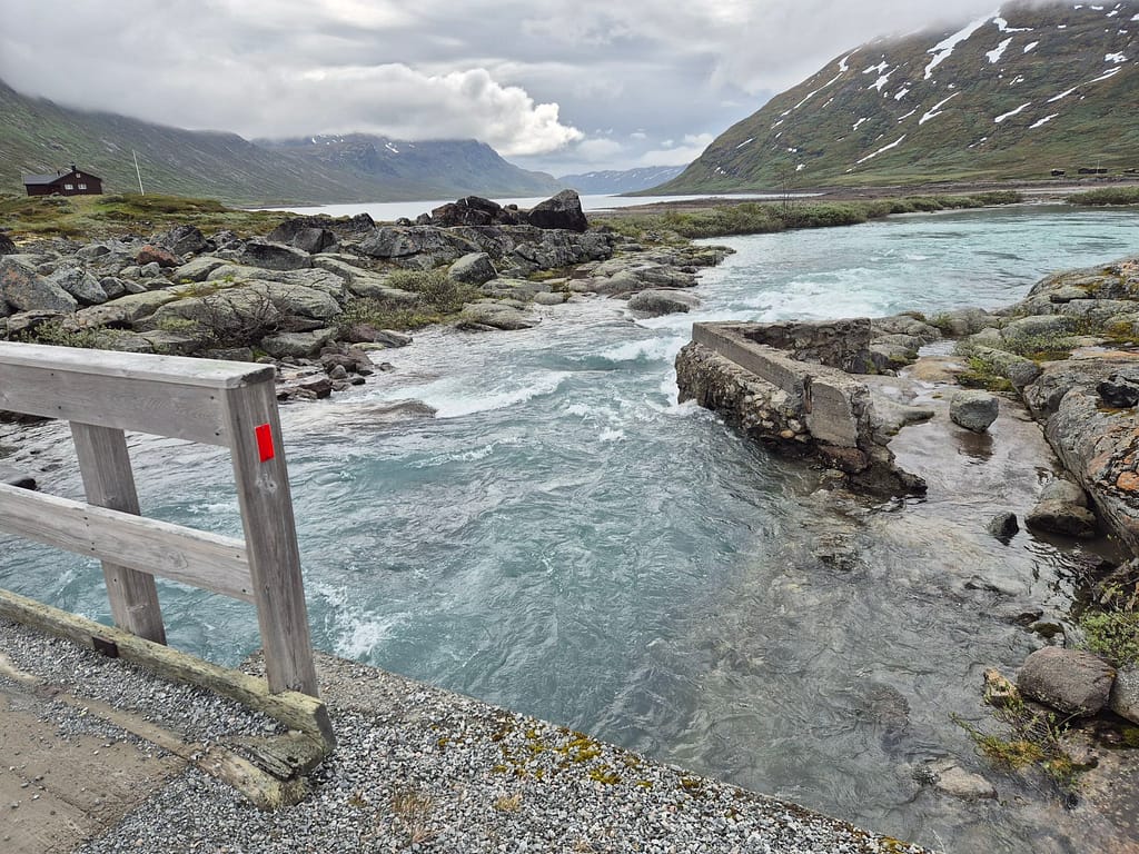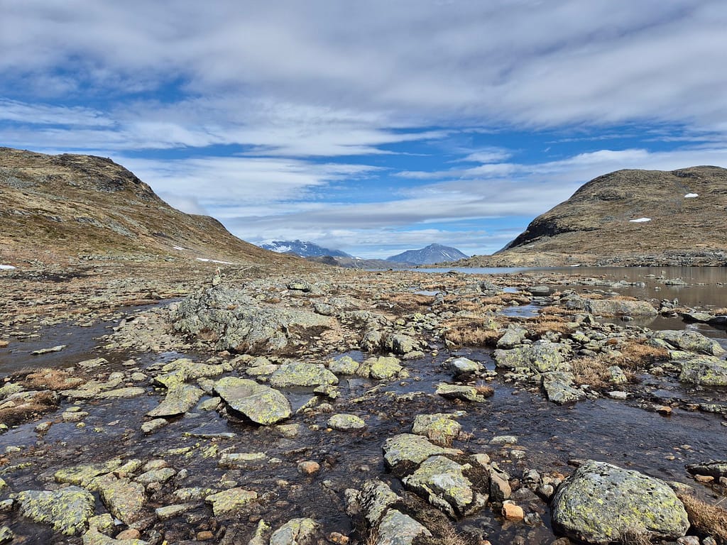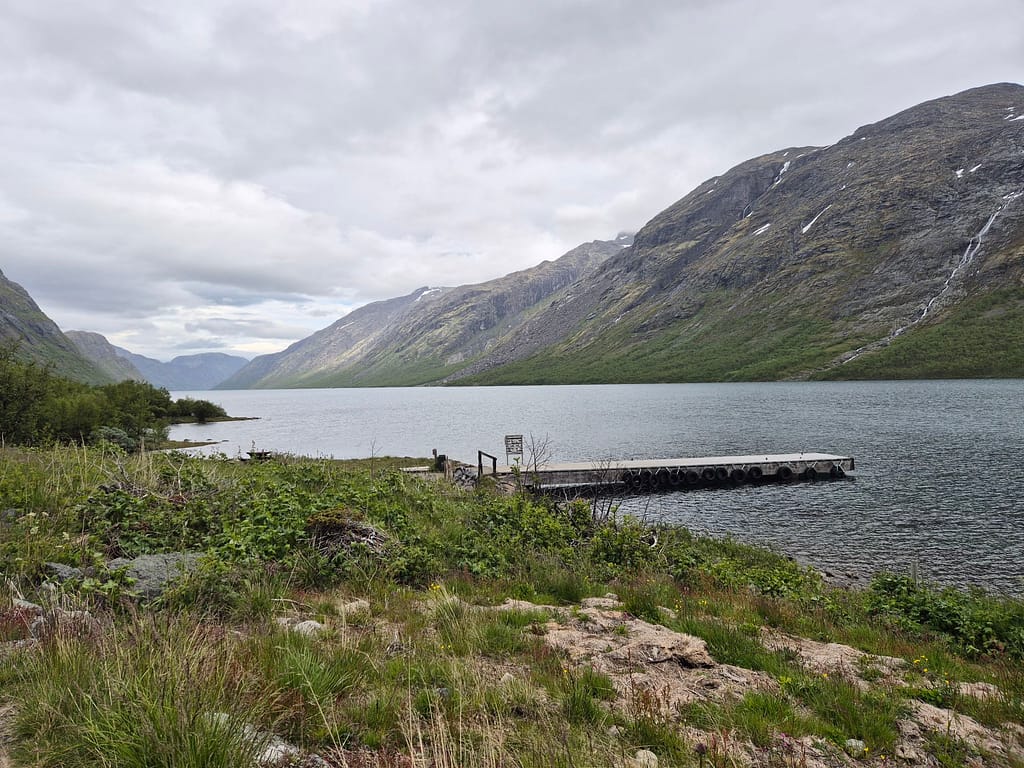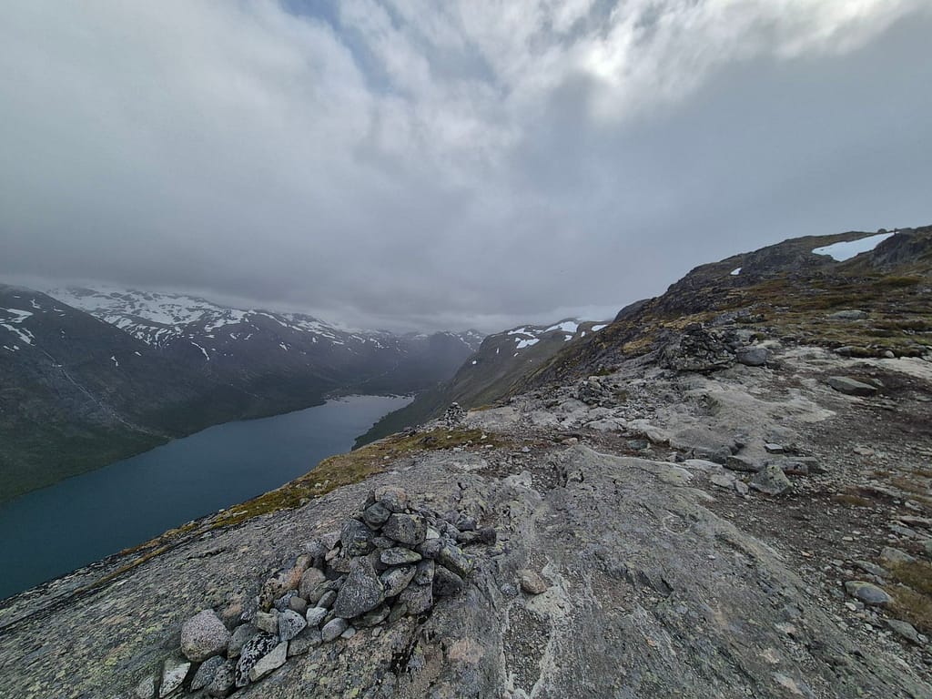 Fremme ved Gjendebu fikk jeg kjøpt en vaffel med rømme og syltetøy samt en cola. Skikkelig luksus på fjellet. Jeg slappet av her i omtrent en time før jeg gikk videre. Her fikk jeg også bekreftet at det skal være tilnærmet snøfritt over Besseggen. Planen blir dermed å gå over den i morgen. Ettersom jeg har sovet en del på hytter og det er meldt oppholdsvær så er planen telt i natt. Spesielt viktig for at teltet ikke skal bli muggent siden det ikke er pakket ned helt tørt.