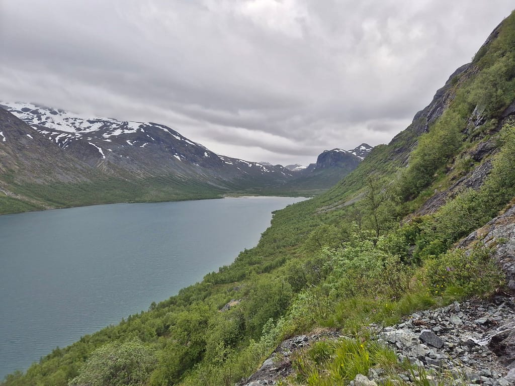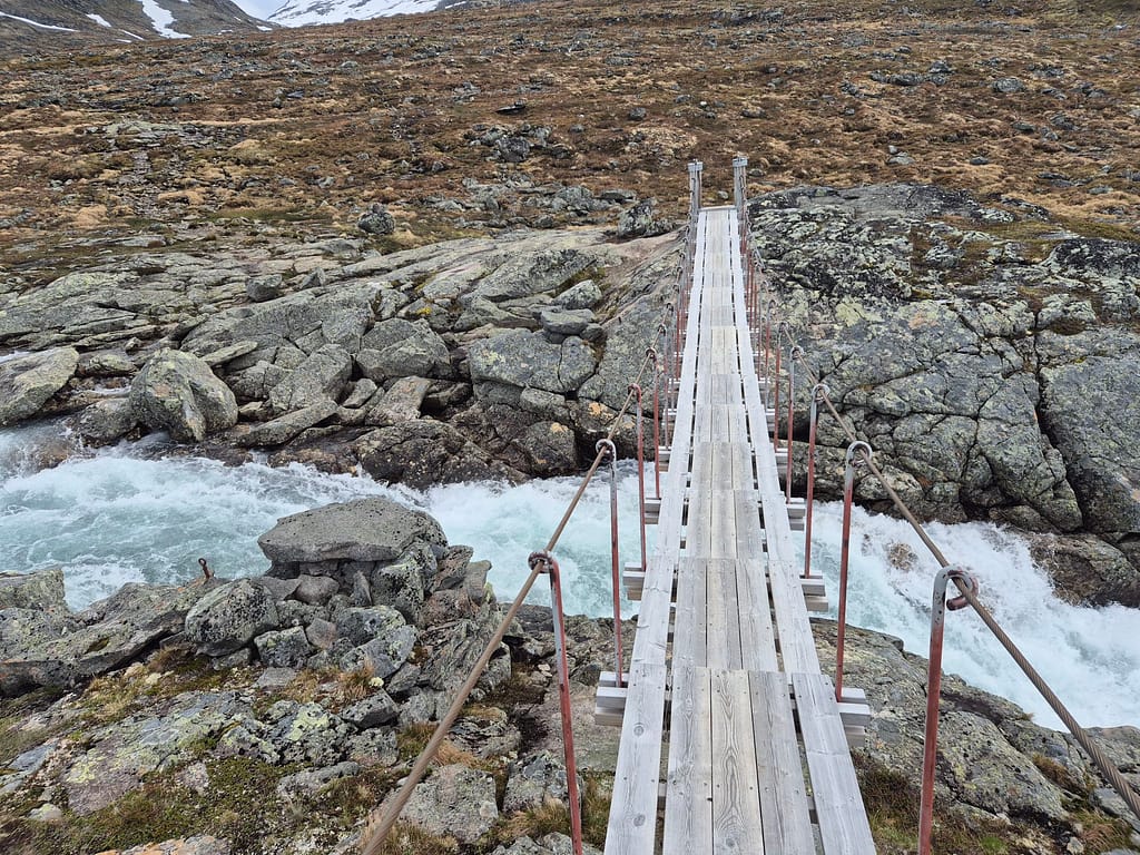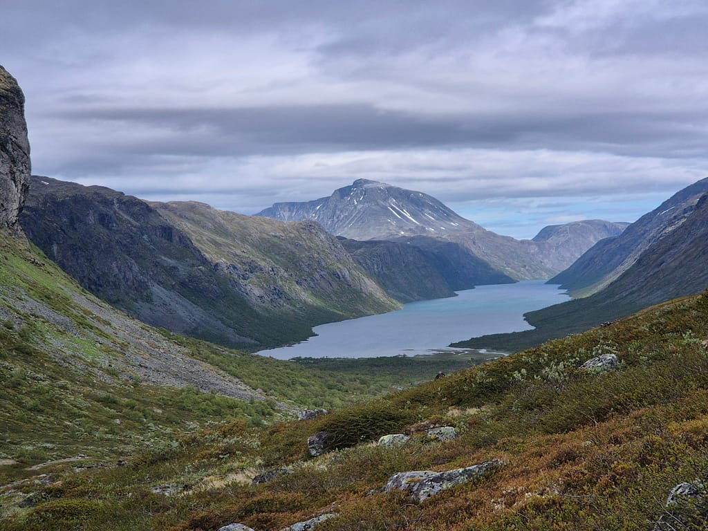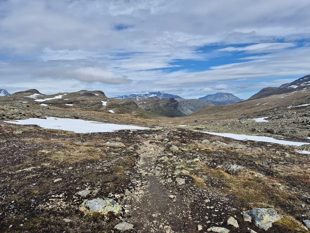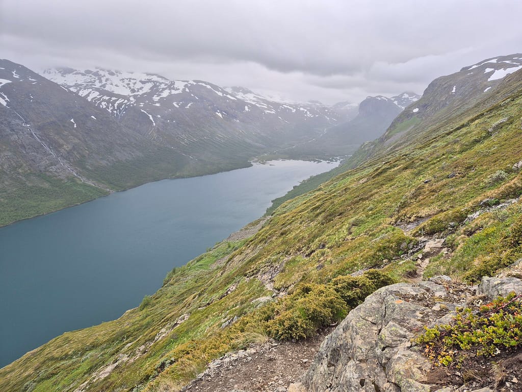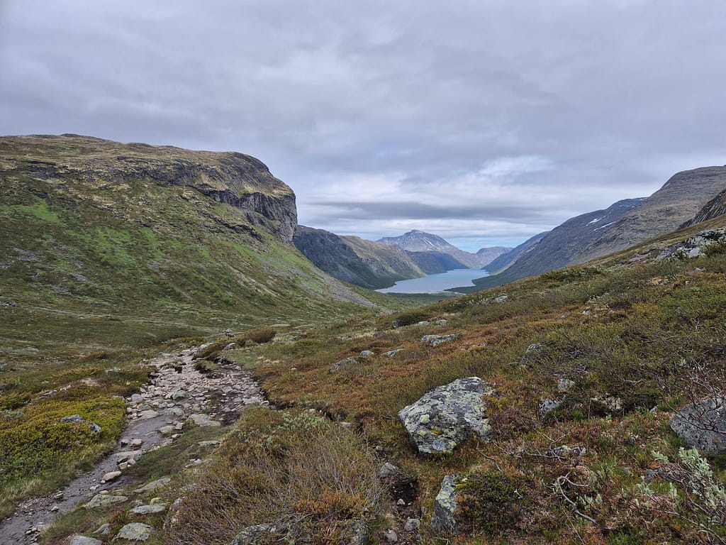 Fremme ved Gjendebu fikk jeg kjøpt en vaffel med rømme og syltetøy samt en cola. Skikkelig luksus på fjellet. Jeg slappet av her i omtrent en time før jeg gikk videre. Her fikk jeg også bekreftet at det skal være tilnærmet snøfritt over Besseggen. Planen blir dermed å gå over den i morgen. Ettersom jeg har sovet en del på hytter og det er meldt oppholdsvær så er planen telt i natt. Spesielt viktig for at teltet ikke skal bli muggent siden det ikke er pakket ned helt tørt.