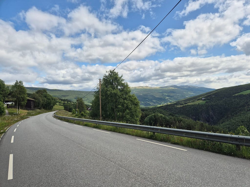 Ikke lenge etterpå møtte jeg en kar som satt å pauset på et liggeunderlag ved en avkjørsel. Dette var Kristoffer som også går Norge på langs. Da jeg nærmet meg spurte han om jeg var Alexander og at han hadde fulgt bloggen min. Vi pratet litt og endte opp med å slå følge veietappen ned til Heidal. Det var hyggelig med selskap, særlig på en veietappe som er tung både psykisk og for føttene.