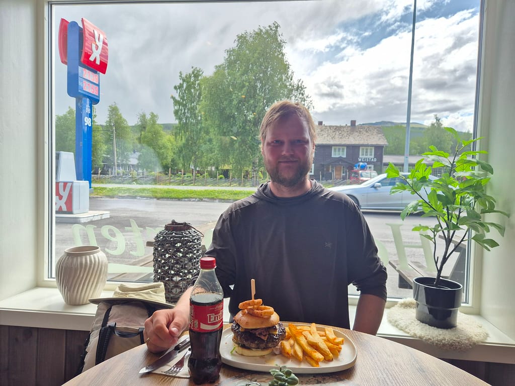 Ved Heidal kjøpte jeg litt brødvarer til kvelds også endte vi begge med å kjøpe burger ved den lokale bensinstasjonen. Jeg er fryktelig lei av turmat så det var helt nydelig. Kristoffer hadde startet dagen en del tidligere enn meg så han tok inn på campingen i Heidal mens jeg spaserte videre.