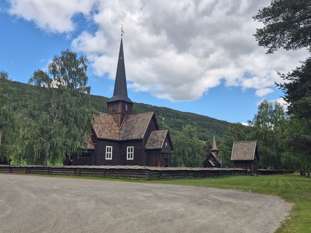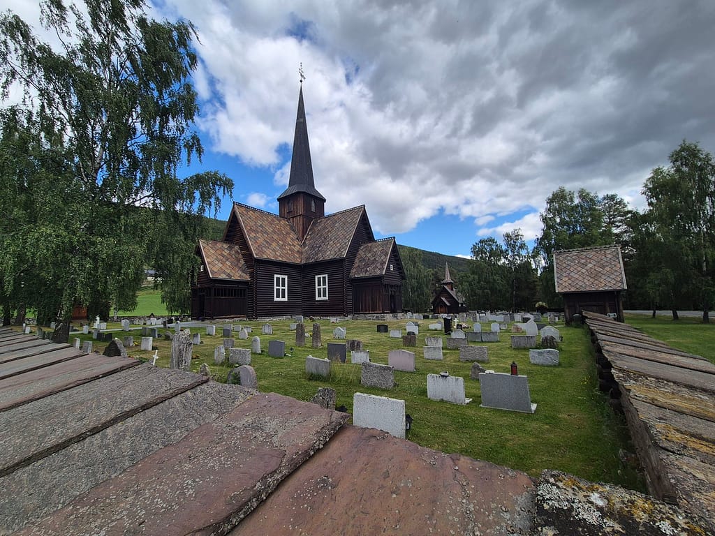Litt senere passerte jeg Heidal kirke. Denne er fra 1941 og en blitt gjennbygd etter den gamle brant opp etter lynnedslag. Her er det bevart byggeteknikk datert svært langt tilbake og det er et spesielt byggverk å se med mye historie helt tilbake til 1000-tallet.