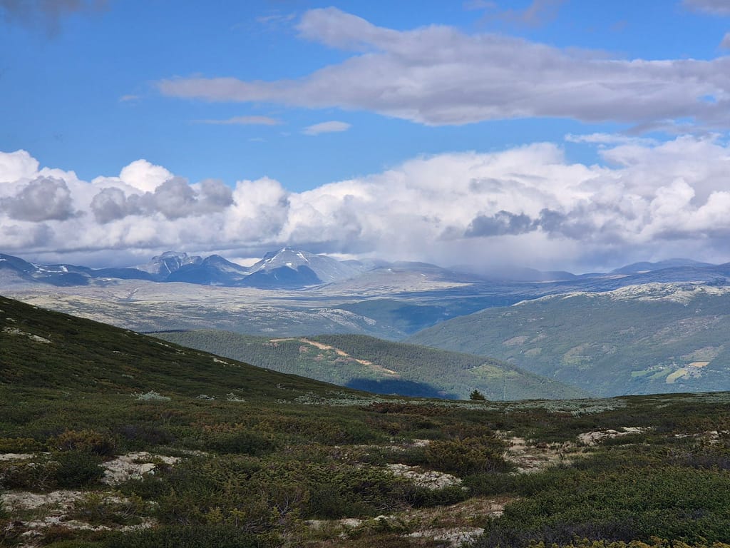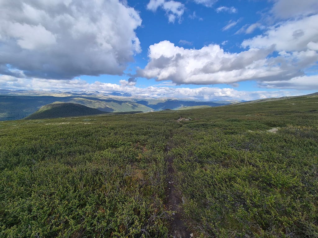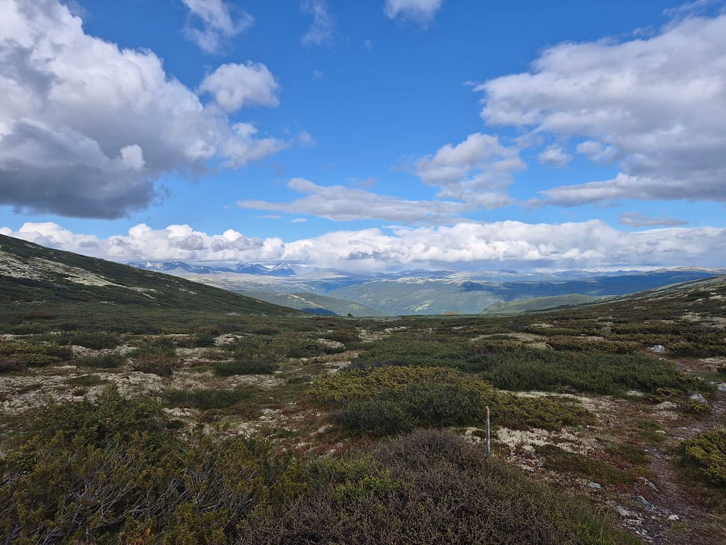 Det var en del stigning opp fjellet. Det viste seg å være en historisk vandrerute der folk tidligere reiste fra Heidal til Otta for å komme til Martnan. Ruta var derfor godt merket og det var en god sti det meste av veien. Over Fjellhammen så fikk jeg god utsikt over fjellene omkring, både mot Rondane i nordøst og Dovre i mer nordlig retning. Jeg gikk litt forbi toppunktet før jeg slo opp teltet i litt mer le for vinden.