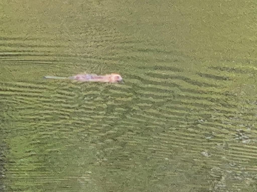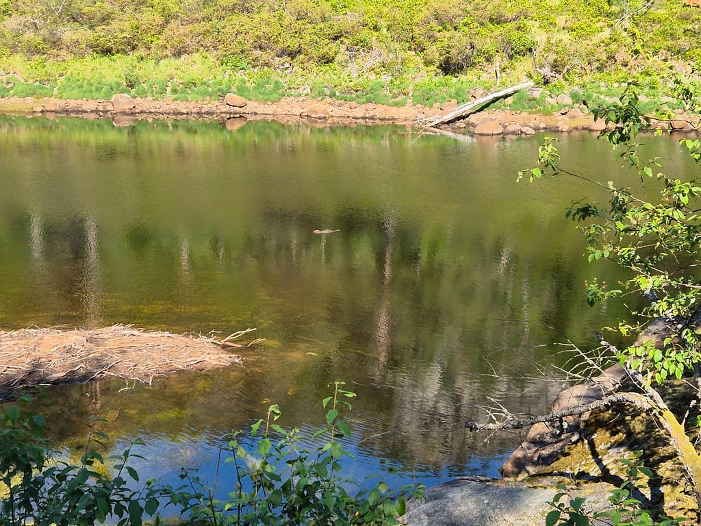 Rett før Snartemo så passerte jeg en bever som lå å plaska og kosa seg i vannet. Hak tok det helt med ro og nøt det fine været. Jeg fikk ikke så bra bilde. Mulig linsa var litt skitten eller at jeg ikke er stø nok på handa.