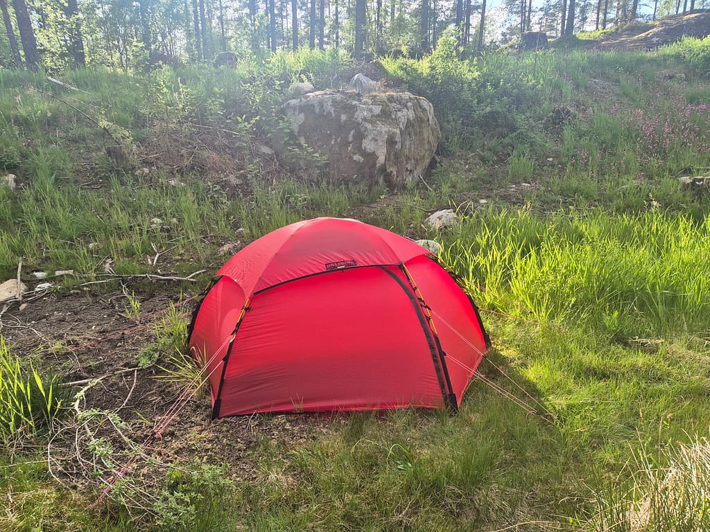Med nye sko gikk jeg videre og ut av Eiken. Planen var å slå opp teltet ganske raskt siden det var meldt regn. Desverre viste det seg vanskelig å både finne vann og en aktuell teltplass. Det ble derfor en altfor lang dag på nytt med litt over 40 km tilbakelagt. Etterhvert traff jeg på en hyggelig dame på en gård som fylte flaskene mine. Noen km etter dette fant jeg endelig teltplass. Timingen var helt perfekt ettersom det rett etterpå begynte å regne veldig mye. Denne posten blir publisert dagen etterpå ettersom det har vært litt tynt med dekning på mobilen.