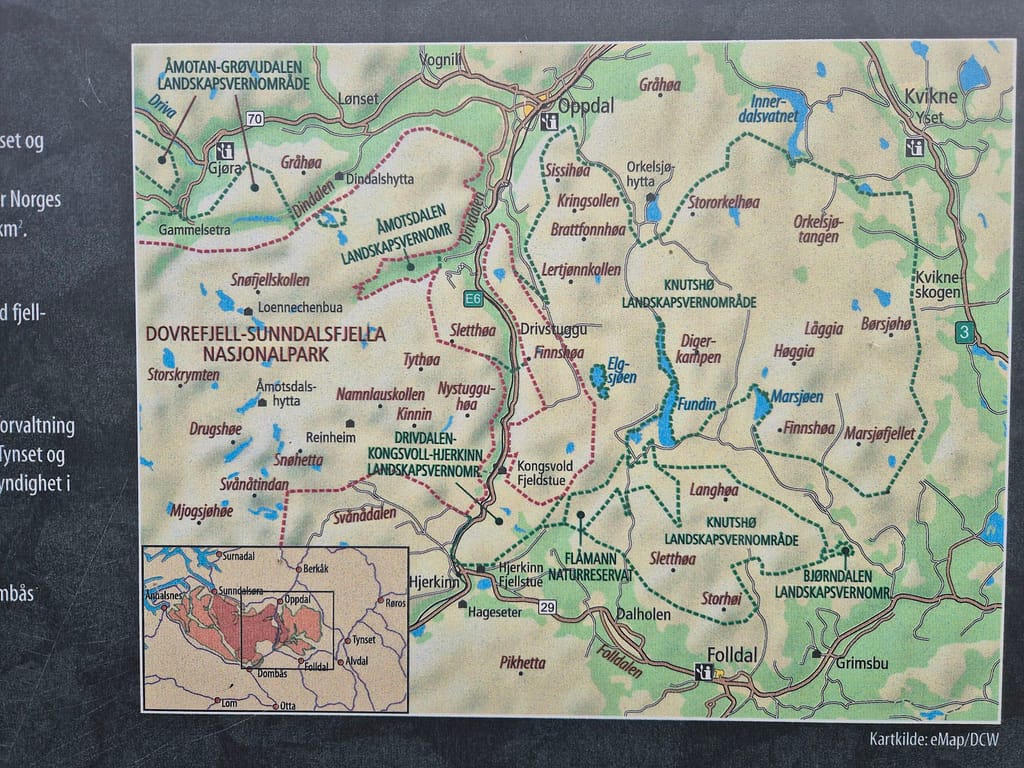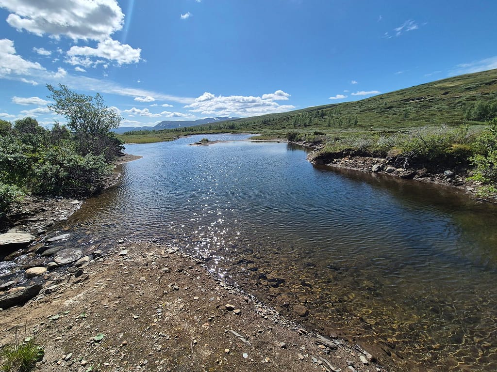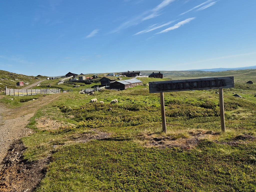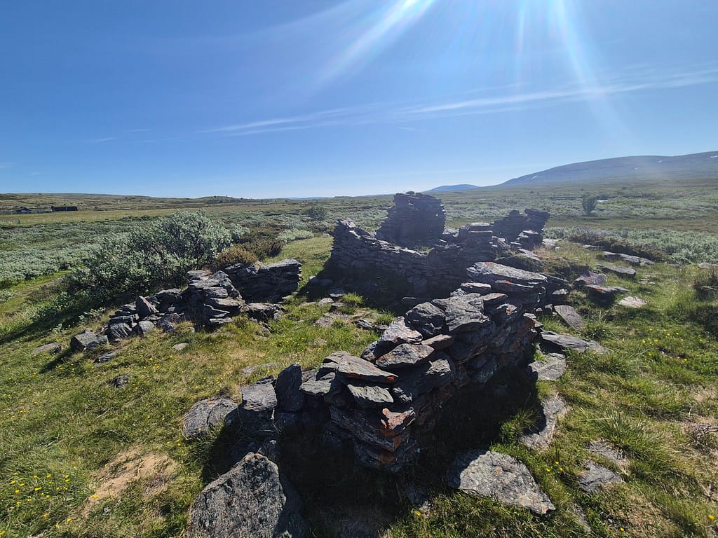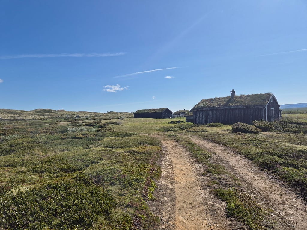 Underveis passerte jeg flere eldre sætrer som og en liten ruin av et bygg. Jeg endte opp med å ta av sko og sokker og vadet over et par elver. Den ene var 30-40m bred, uten at det var så dypt. En stund senere møtte jeg plutselig på en bil. De stoppet og hilset og var på vei opp til en av de eldre sætrene. Bilen var såpass høy at de kjørte rett over elvene.