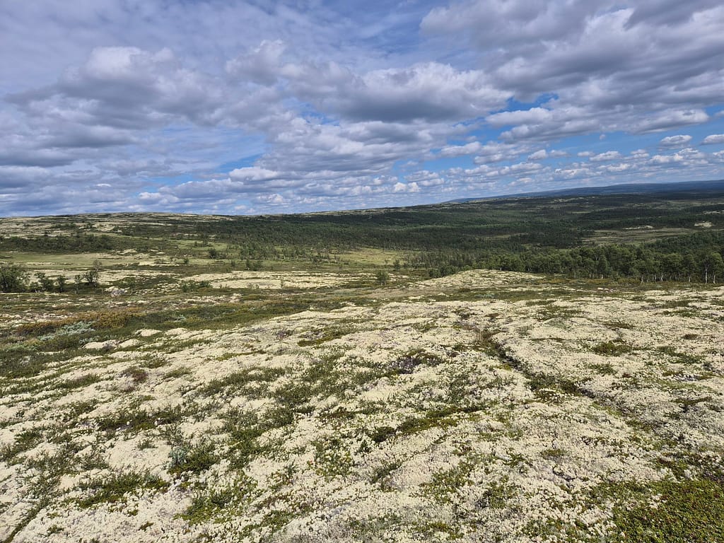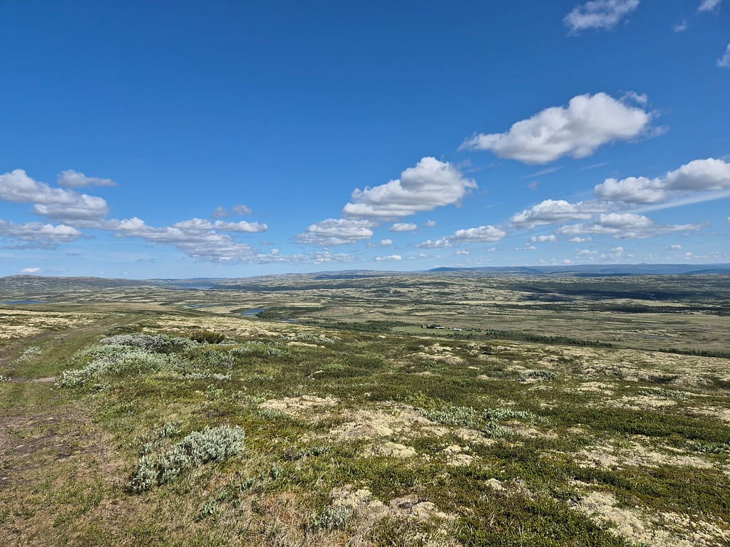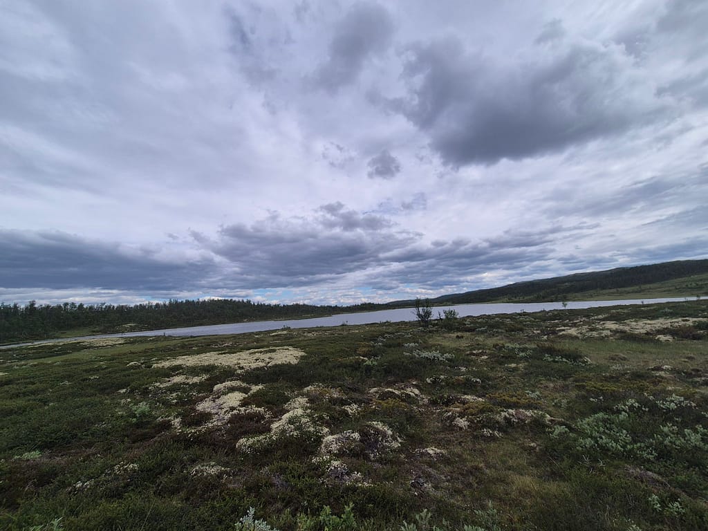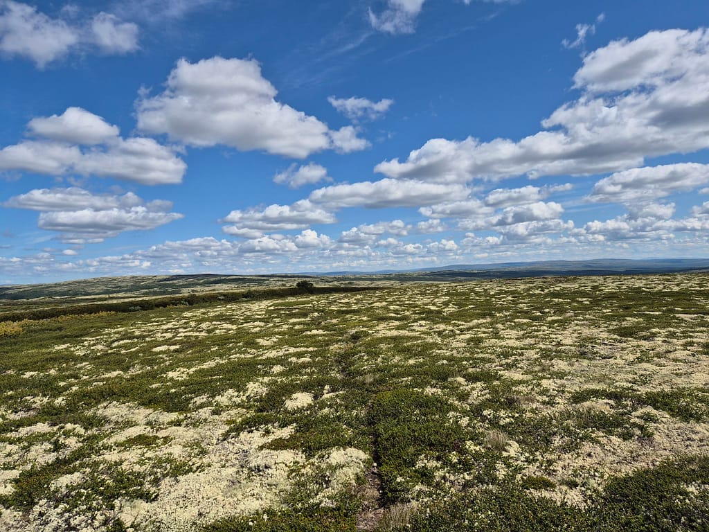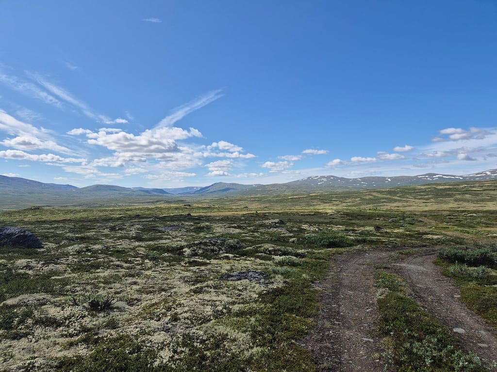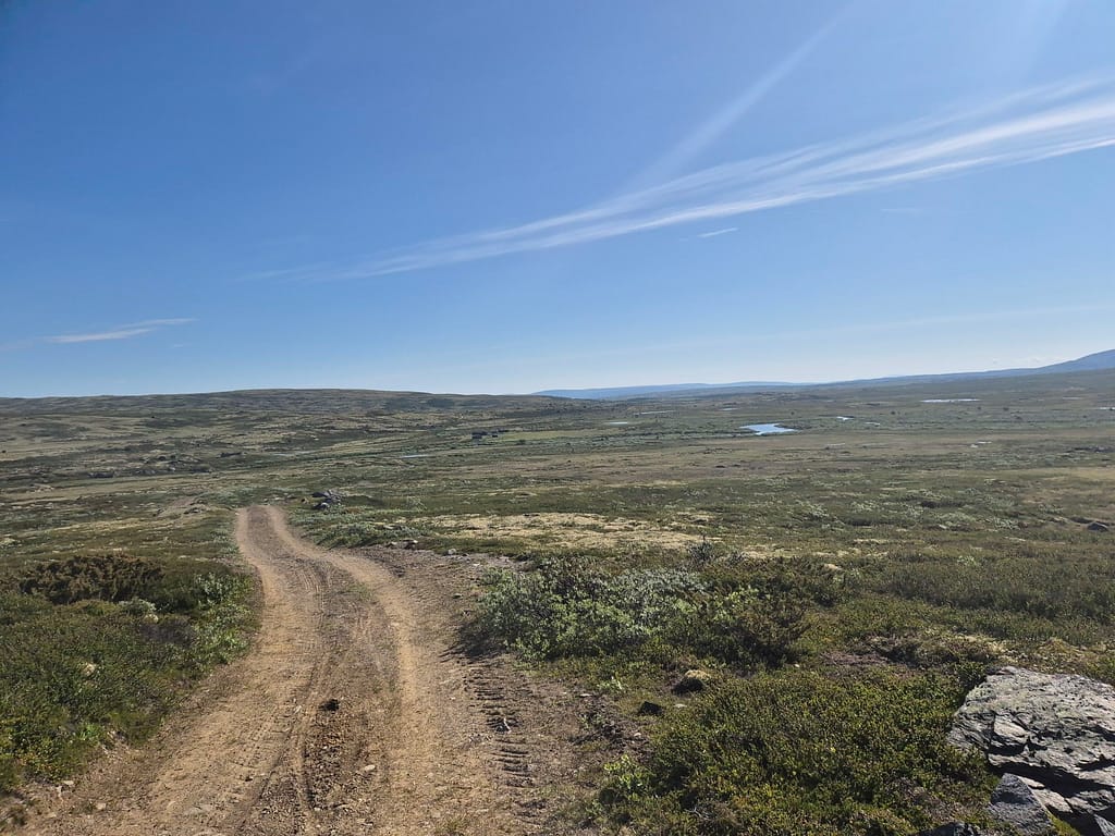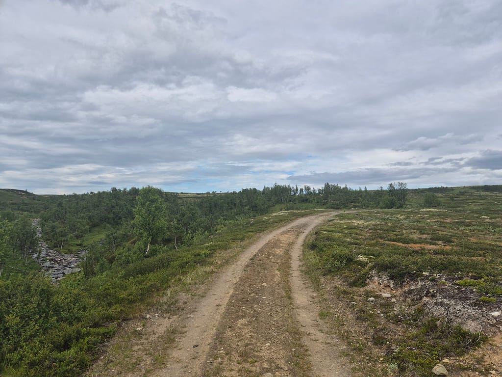 Til tross for at jeg ble vekket av badstuliknende tilstander i teltet så ble klokka nærmere 09:00 før jeg var i gåingen. Etter kort tid passerte jeg en bom og det gikk fra grusvei til overgrodd traktorvei.