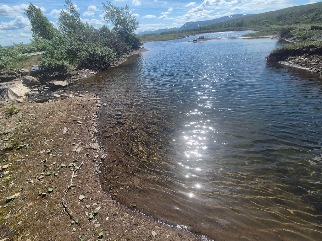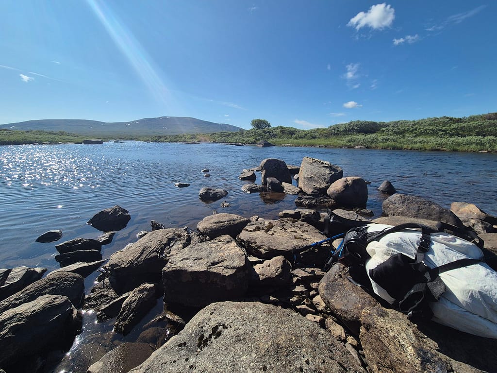 Etterhvert gikk det over til kun overgrodd sti. Første delen var grei å følge. Jeg stoppet ved et lite tjern hvor jeg tok et bad. Det var hærlig etter lange timer i sola, selvom vannet var ganske kaldt. Litt senere forsvant stien helt. Til tross for at jeg gikk med gpsen så ble det kaving omkring i myrer og kratt i noen timer. I stekende sol så var dette en tålmodighetsprøve.