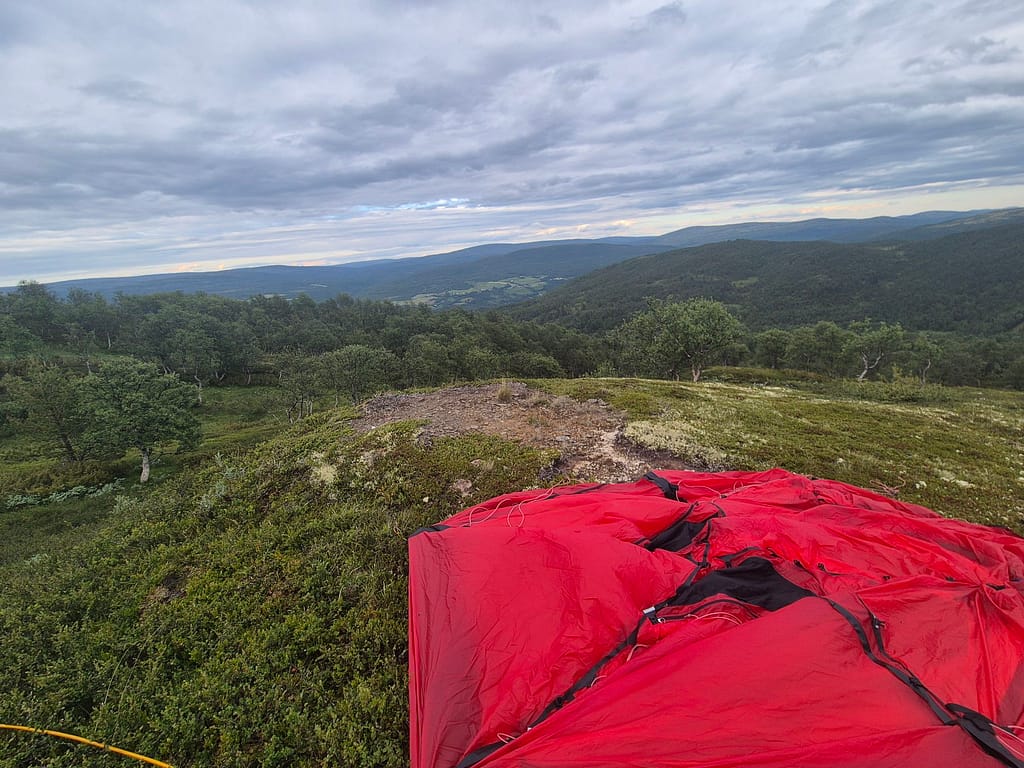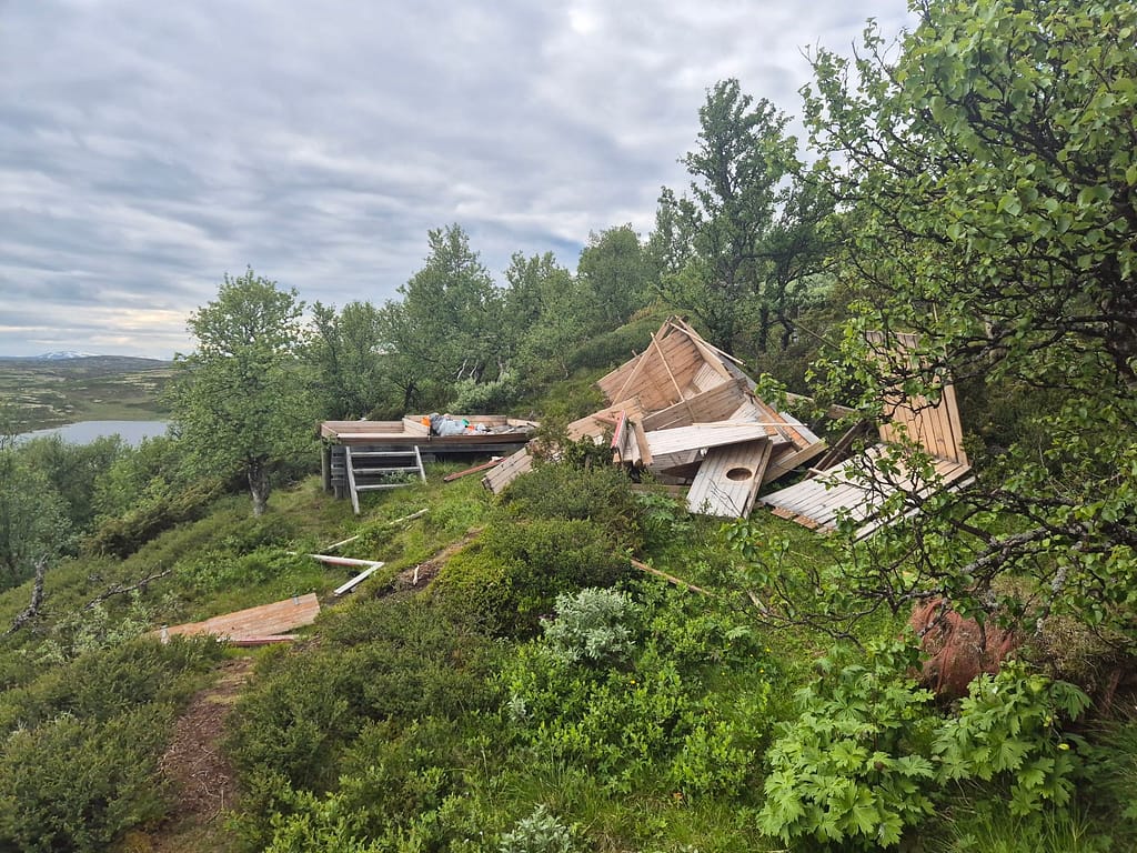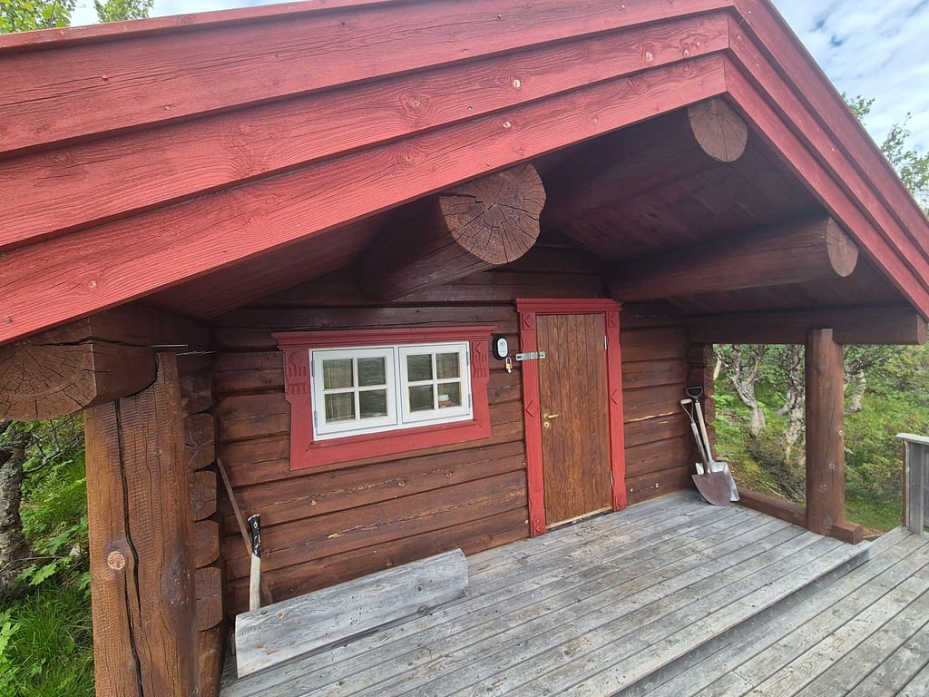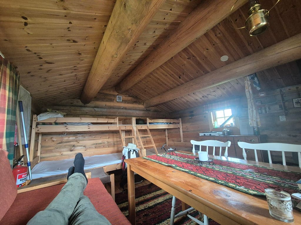 Til slutt traff jeg på grusvei igjen som jeg fulgte frem til Litlj-innsjøbua. Dette er en liten åpen hytte med fire soveplasser. Har kan man låne hytta mot å betale 50 kr. Det viste seg at det lå et par soveposer på den ene senga og at noen hadde skrevet seg i hytteboka for dagen. Videre så jeg at utedoen på hytta hadde blåst ned iløpet av vinteren. I dag var føttene veldig slitne og jeg var blitt ganske solbrent og hadde håpet på å få hytta for meg selv. Jeg slappet av en time på hytta før jeg gikk litt videre og slo opp teltet med utsikt mot Kvikne.