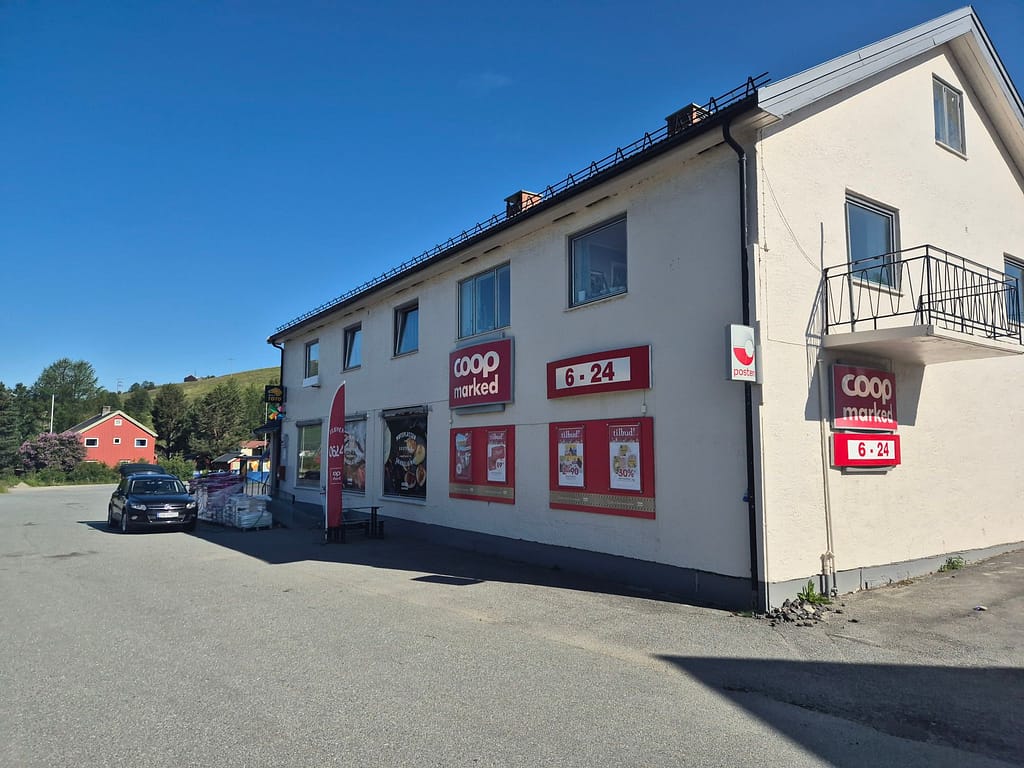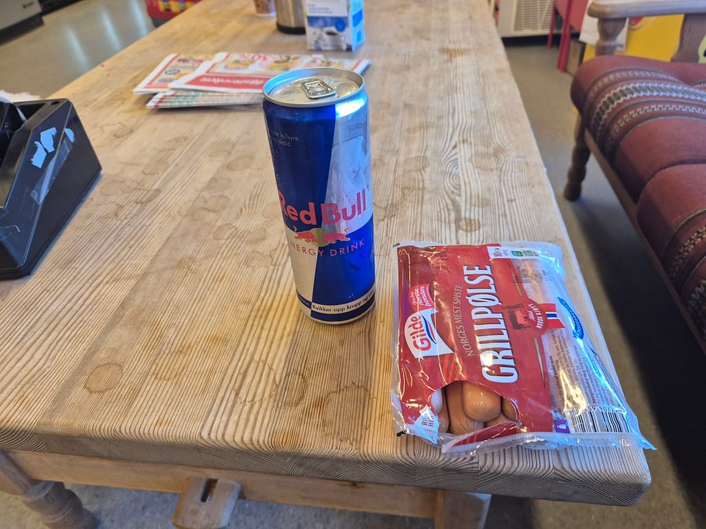 Jeg fortsatte bort til Coop Marked hvor jeg hentet ut proviantboksen for neste etappe over Forollhogna nasjonalpark. Det ble også litt snacks mens jeg først hadde sjansen. Det blir dårlig med lademuligheter på neste etappe. Jeg endte derfor opp med å stå i litt over en time og lade fra en utestikkontakt utenfor butikken. Det holdt bare til å lade powerbankene halvveis så det må bli rasjonering av strømmen de neste dagene.