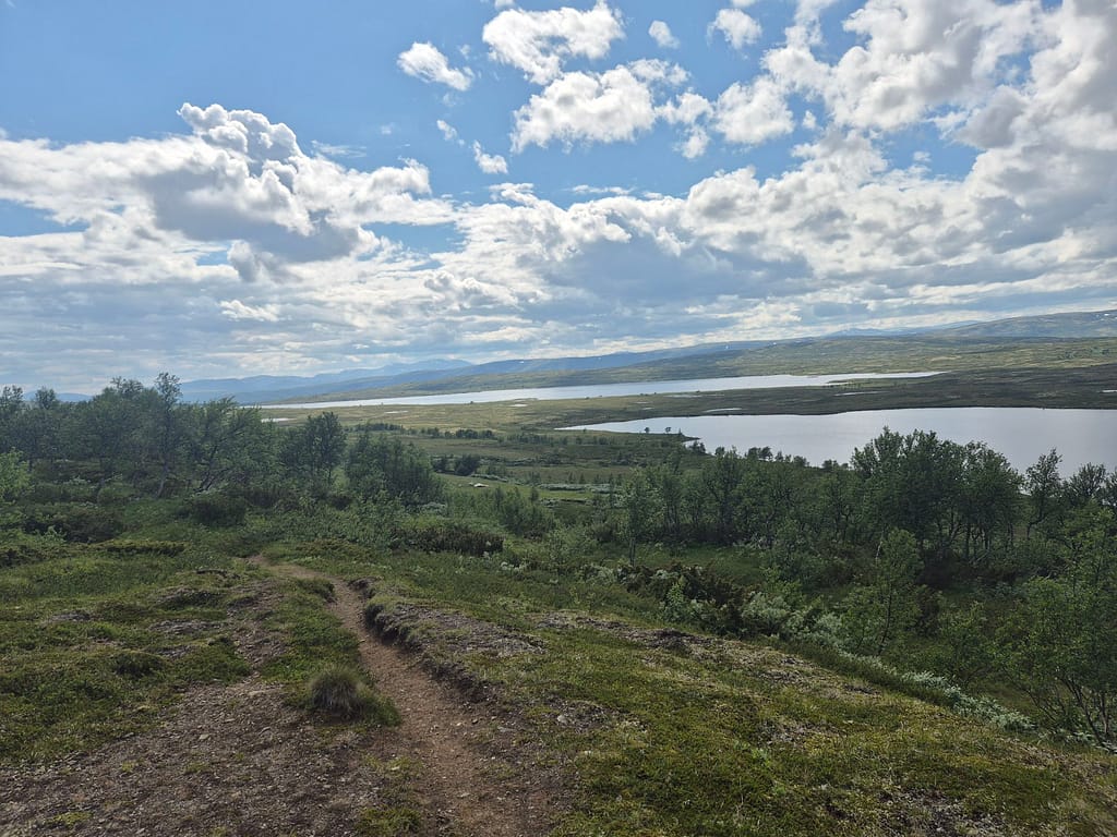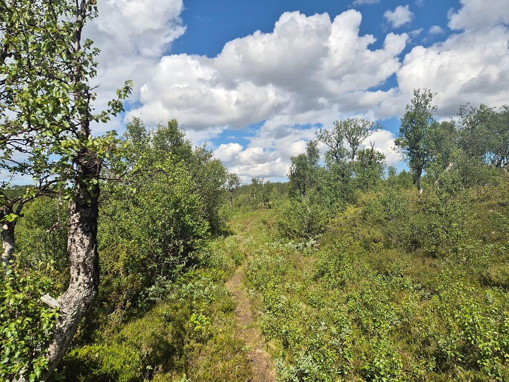Det ble en veldig varm dag og svetten rant godt når jeg gikk opp på fjellet igjen. Det var for det meste grusvei før stien startet ved Litl-Sverjesjøen. Stien var smal i starten men brukbar. Etterhvert var det vanskelig å se noen tydelig sti. Jeg endte opp med å følge det jeg trodde var stien et stykke i feil retning før jeg fikk justert meg inn.