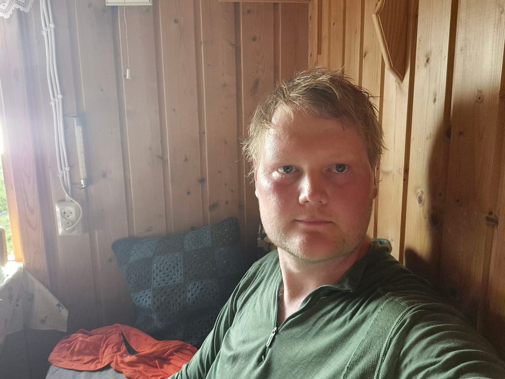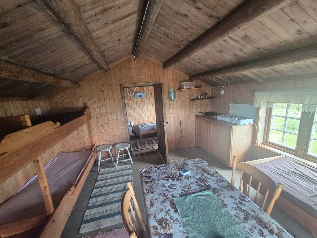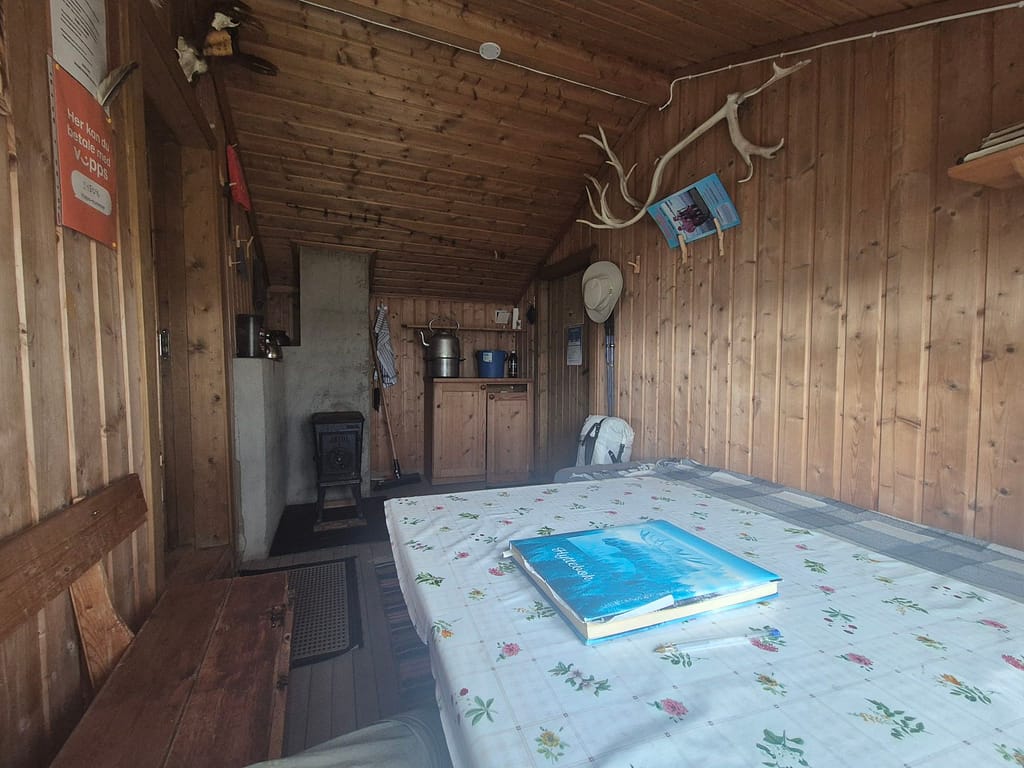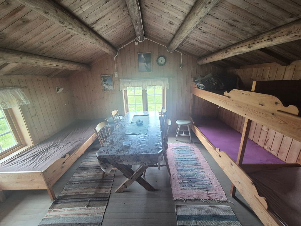 Jeg kom frem til den åpne bua Litjhiåsjøbua i 17 tiden og hadde hytta for meg selv. Jeg vasket litt klær og spiste mat før det kom inn en familie på 3 og en hund. Hytta har to rom hvor det ene kun har en seng mens det andre har 5. Enerommet falt derfor naturlig for meg. Utfordringen var at man må gå igjennom det lille rommet for å komme til det store. Det var ingen større problem. Håper å kunne sove litt ekstra i morgen uten at sola vekker meg som i teltet.