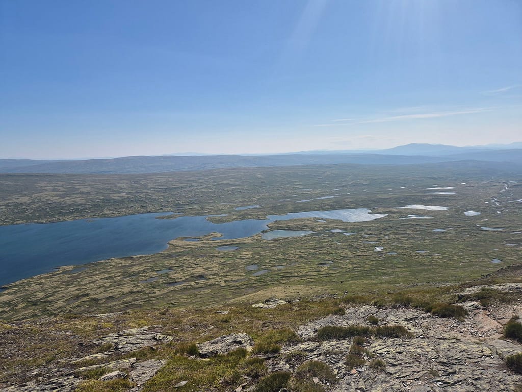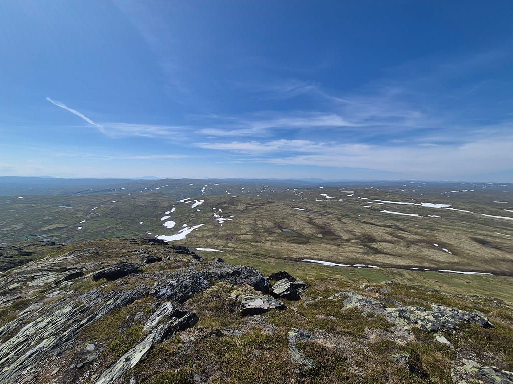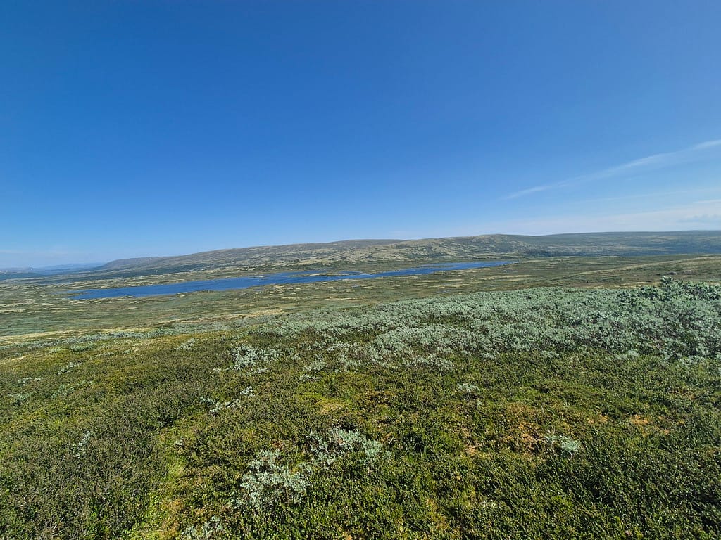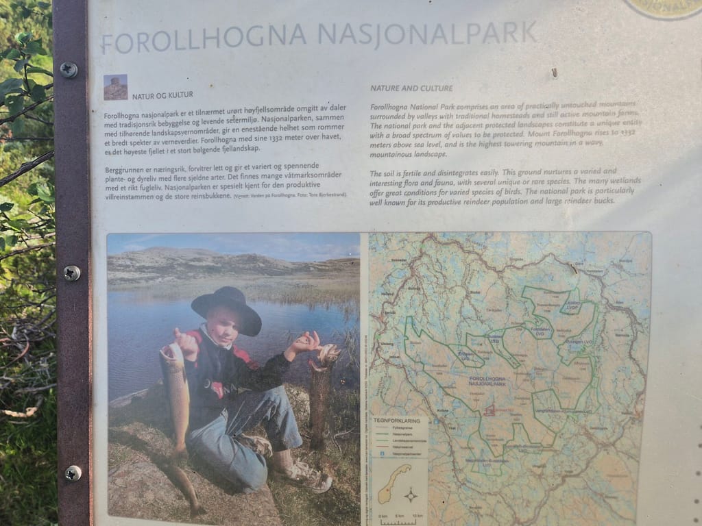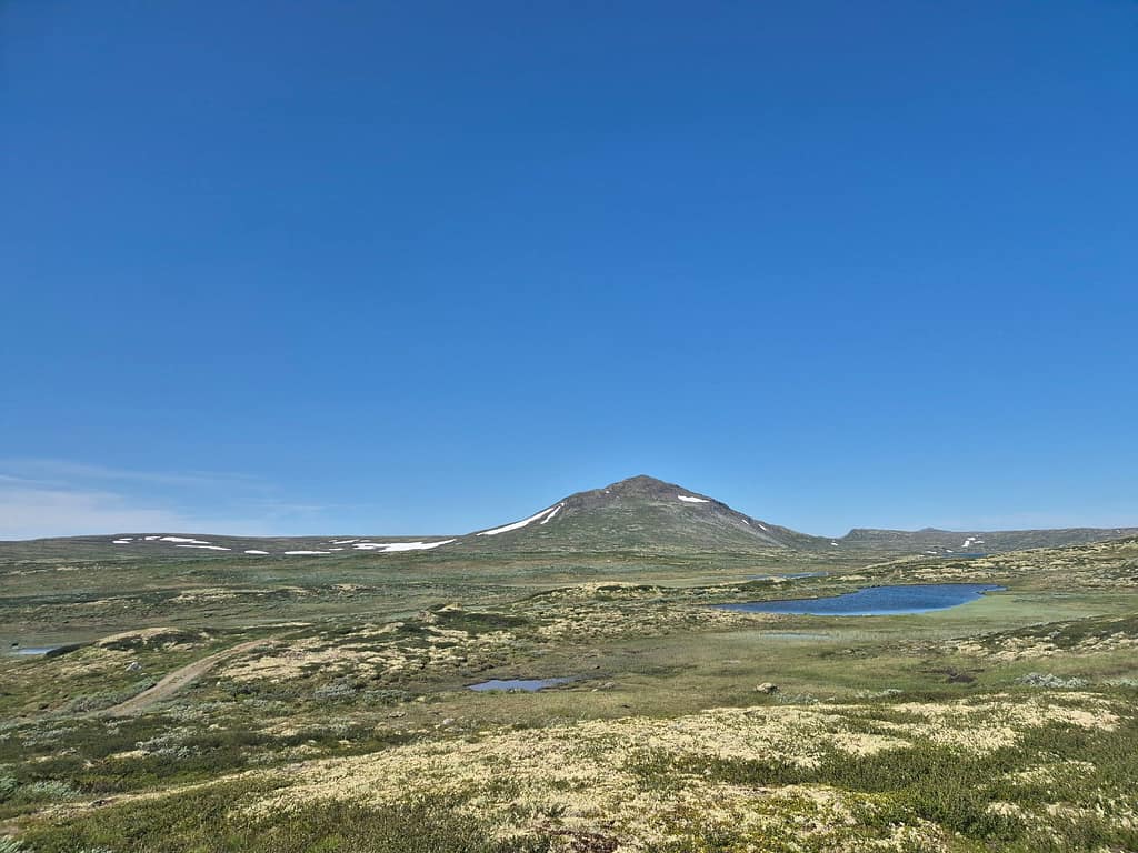 Etter å ha gransket den planlagte ruta endte jeg opp på et punkt å gå bort fra den og heller gå mer rett mot fjellet Forollhogna. Det var lite stier og mye kuppert terreng uansett hvor jeg gikk. Da jeg kom frem til fjellet bestemte jeg meg for å ta turen til toppen når jeg først var der. Det var en del vind men ellers et fantastisk solvær og en enorm utsikt. Selve stigningen var ganske grei.