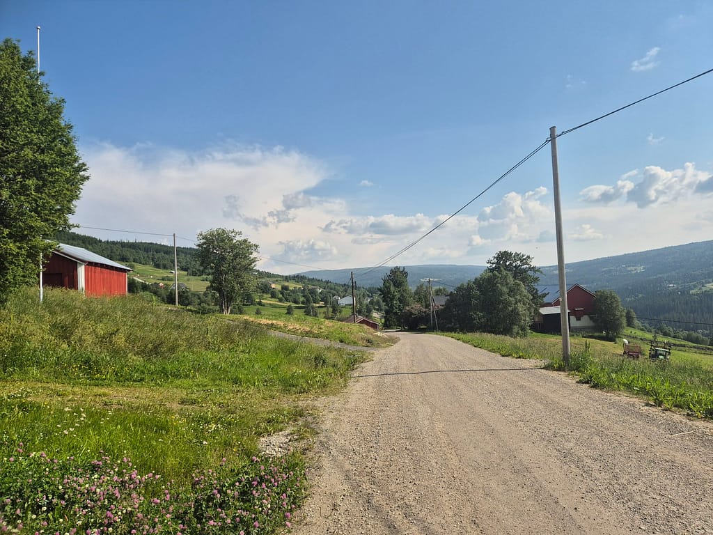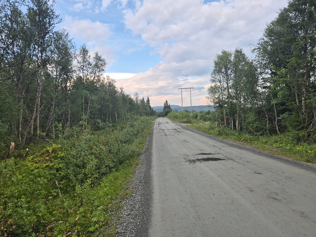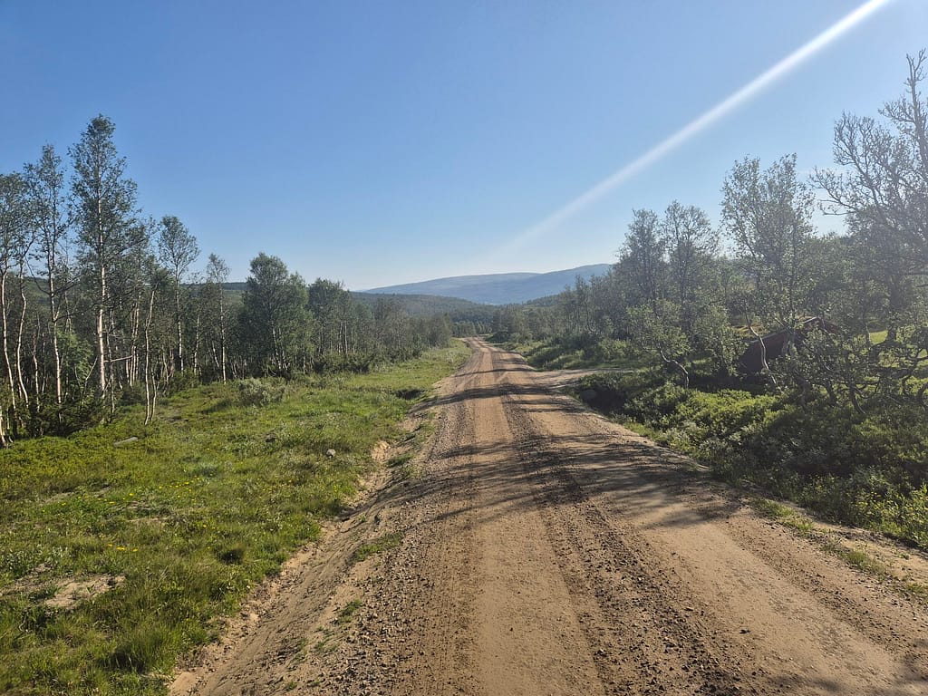 Denne dagen ble en eneste lang veietappe på mest grusveier og litt asfalt. Sola stråler fremdeles og med 30 varmegrader så begynner både jeg og klærne mine å bli veldig klare for en vask. Neste plass hvor jeg kan få dette til blir ved DNT hytta Kjølihytta som fremdeles er et stykke unna.