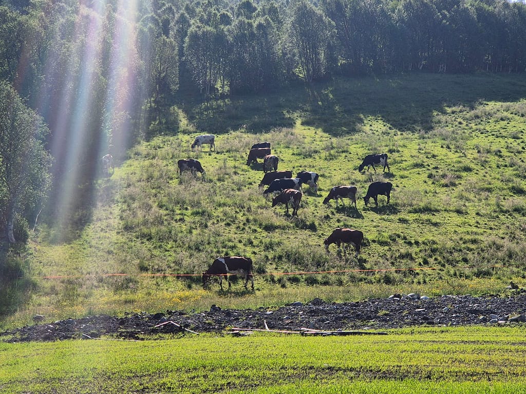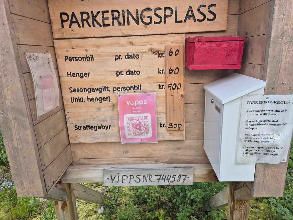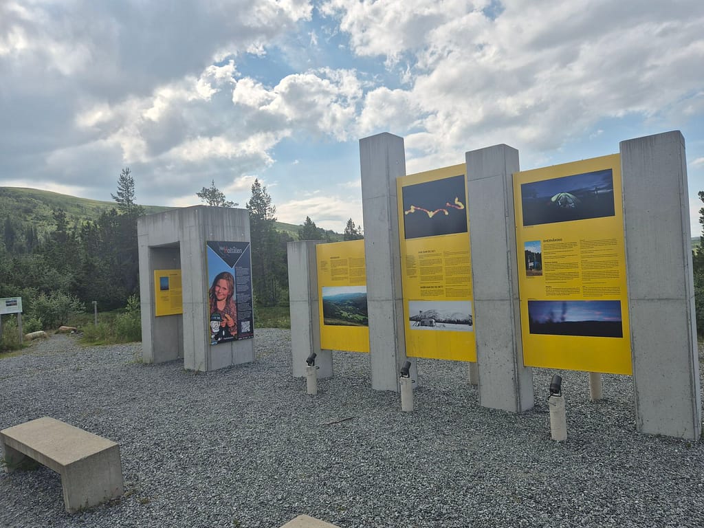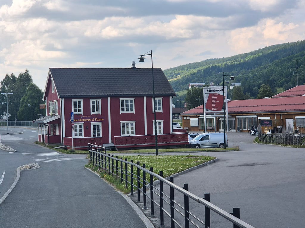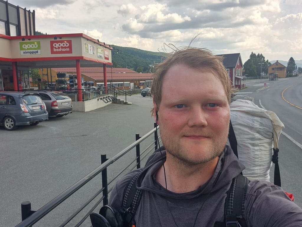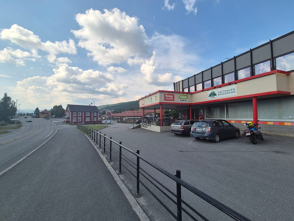 Etter omtrent 20 km hadde jeg kommet ned Hessdalen og frem til Coop Marked på Ålen. Her fikk jeg ladet opp mobilen og hentet ut neste proviantboks. Denne er siste før jeg kommer til Skorovatn. Planen er å kjøpe eventuelle forsyninger jeg trenger når jeg kommer til Storlien på svensk side etter Sylan. Jeg er nå inne i Trøndelag fylke og det merkes at det går litt og litt fremover i retning Nordkapp.