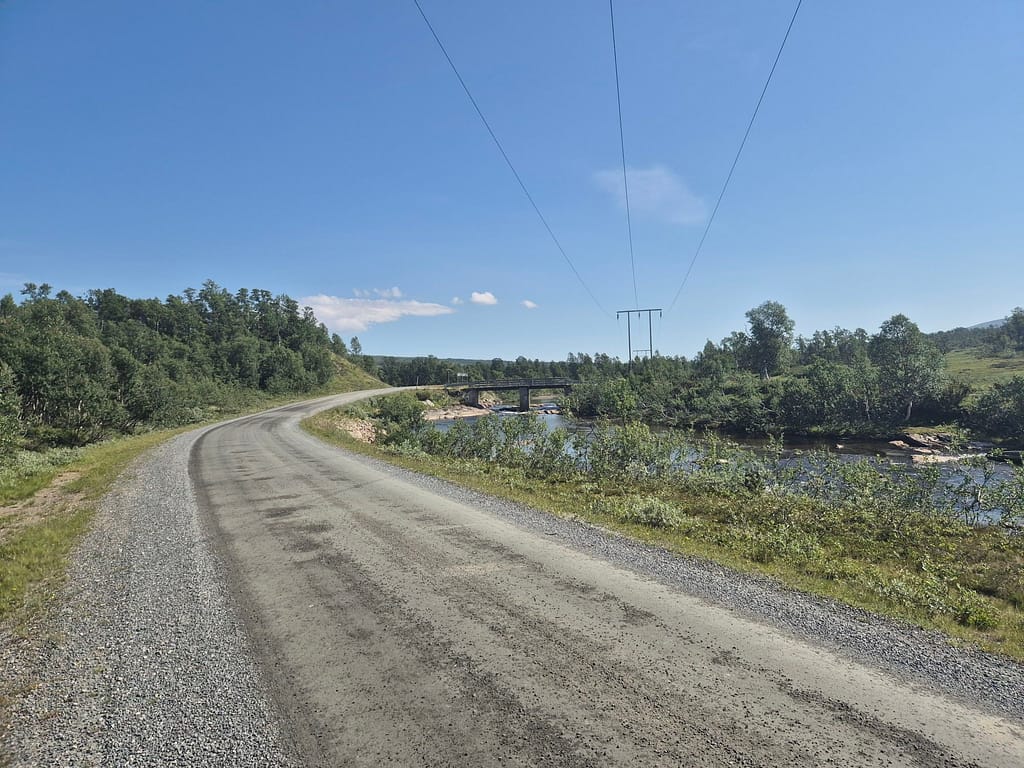 Det ble litt over en mil på grusvei før en rolig etappe opp til hytta. Med fremdeles sprengvarme så endte jeg opp med et bad i en liten elv som rant under grusveien. Der ble det litt lunsj og mens jeg satt der kom plutselig en flokk kuer gående langs veien.
