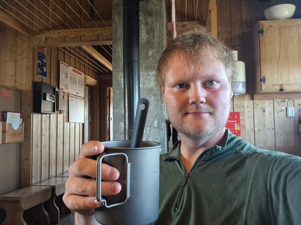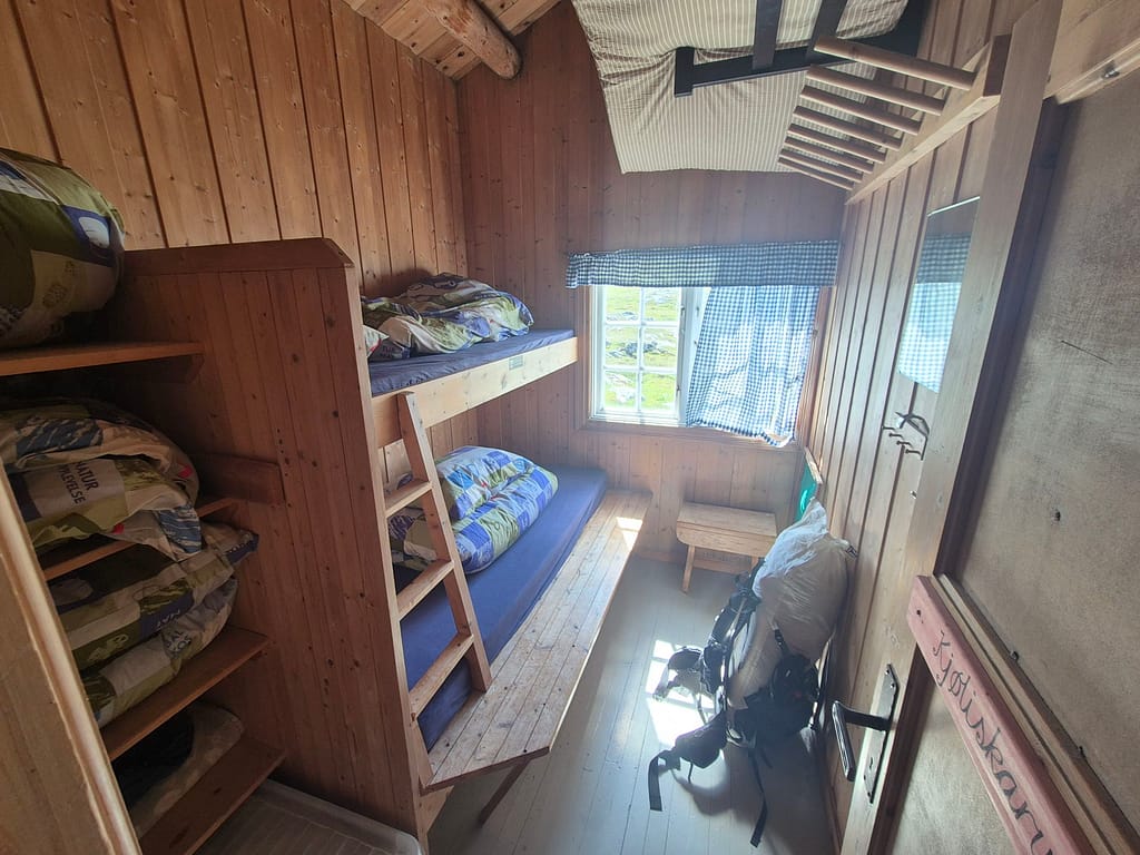 Vel fremme på hytta så hadde jeg hytta for meg selv i starten før det kom en person til litt senere. Jeg var tidlig fremme på hytta og fikk badet, vasket klær og ladet opp utstyr. Det ble ellers en rolig ettermiddag hvor jeg fikk hentet meg inn etter de lange etappene de siste dagene.