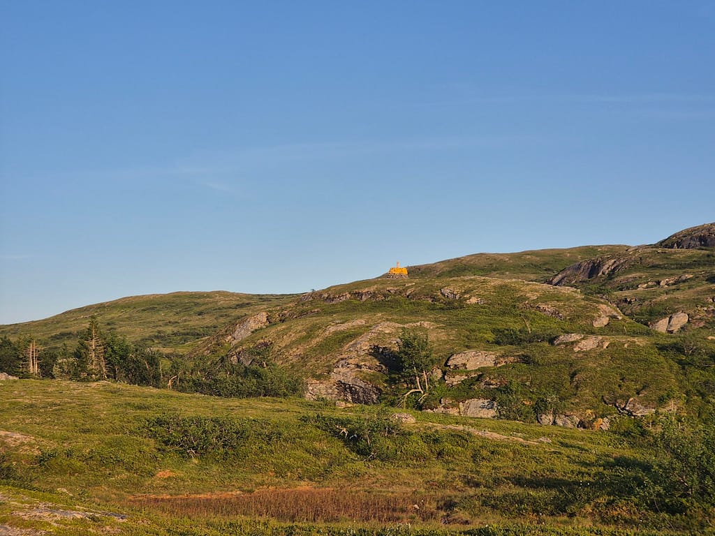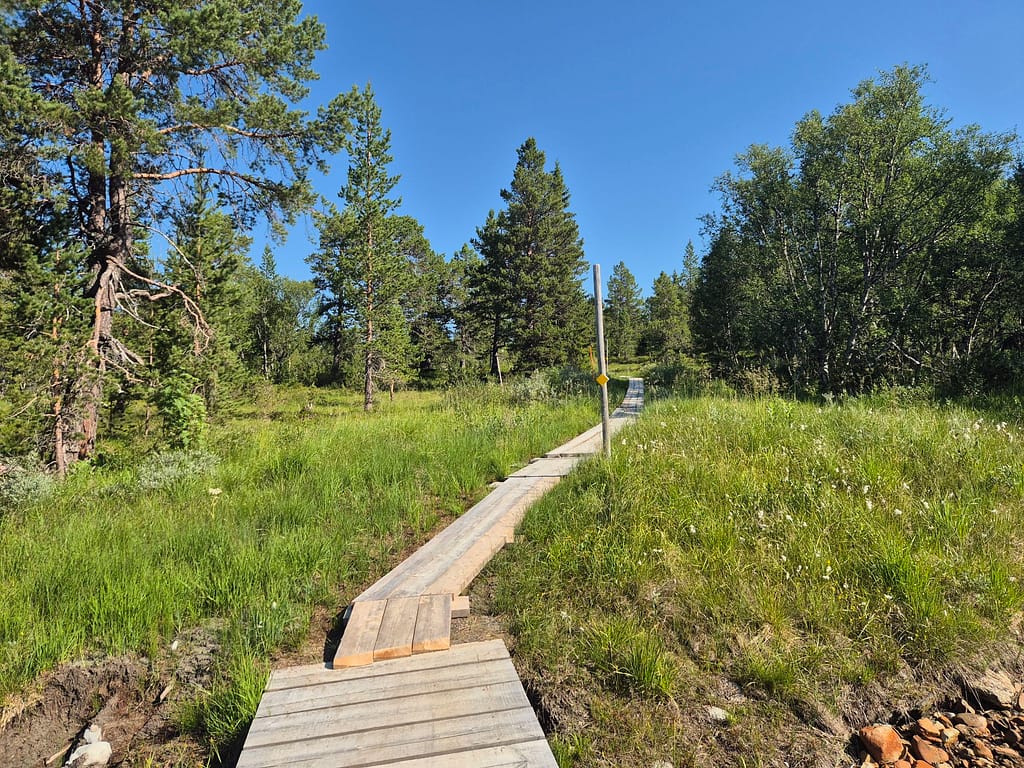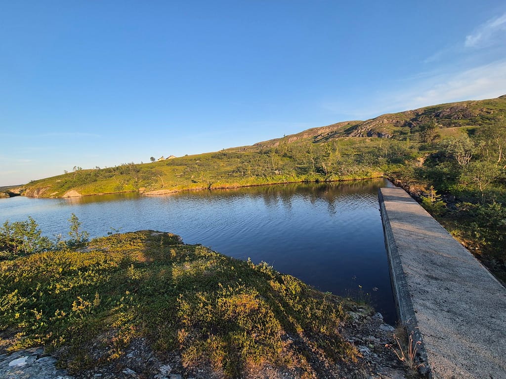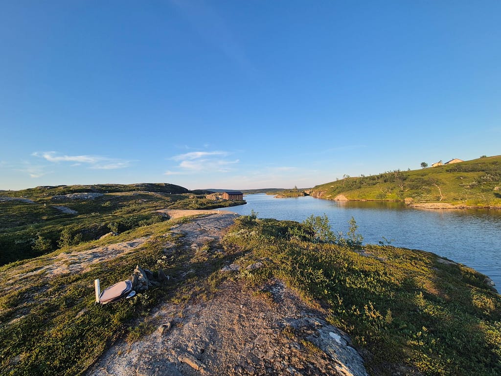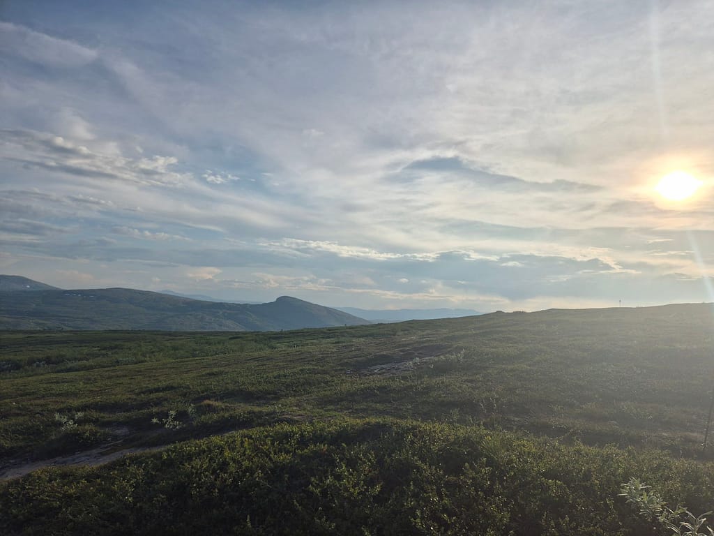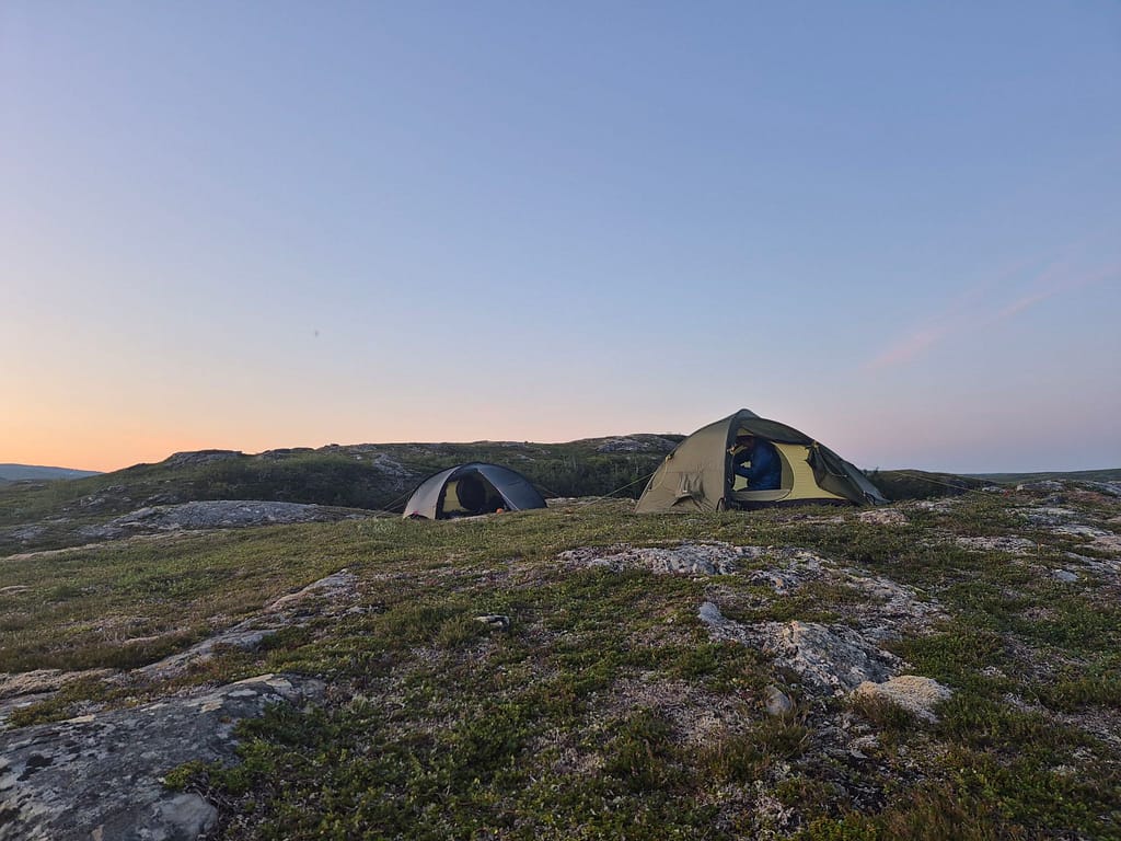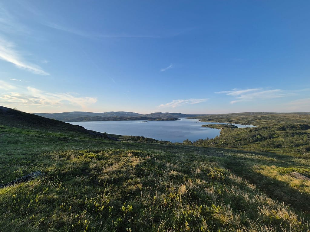 Etter et hyggelig gjensyn med far Anton og svigerbror Axel så startet vi rolig i 19 tiden. Det ble en del stigning i starten opp til Skurdaldshöyden før vi kom til Skurdalssjøen. Her slo vi opp teltet rett over tilbake på norsk side av grensen ca 7-8 km fra parkeringsplassen. Det var en flott teltplass med utsikt over vannet. Jeg tok et bad og vi spiste kvelds sammen og fulgte solnedgangen. En magisk kveld, men det var en god del mygg.
