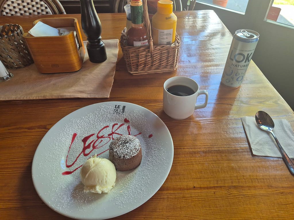 Etter det ruslet jeg bort til stasjonen hvor jeg ble sittende på Le Ski restaurant. Her spiste jeg en pizza, sjokoladefondant, kaffe og brus. Jeg ble sittende noen timer her før jeg skulle møte Anton og Axel som kom kjørende fra Oslo.