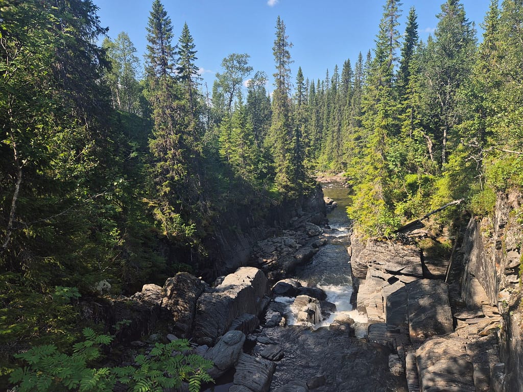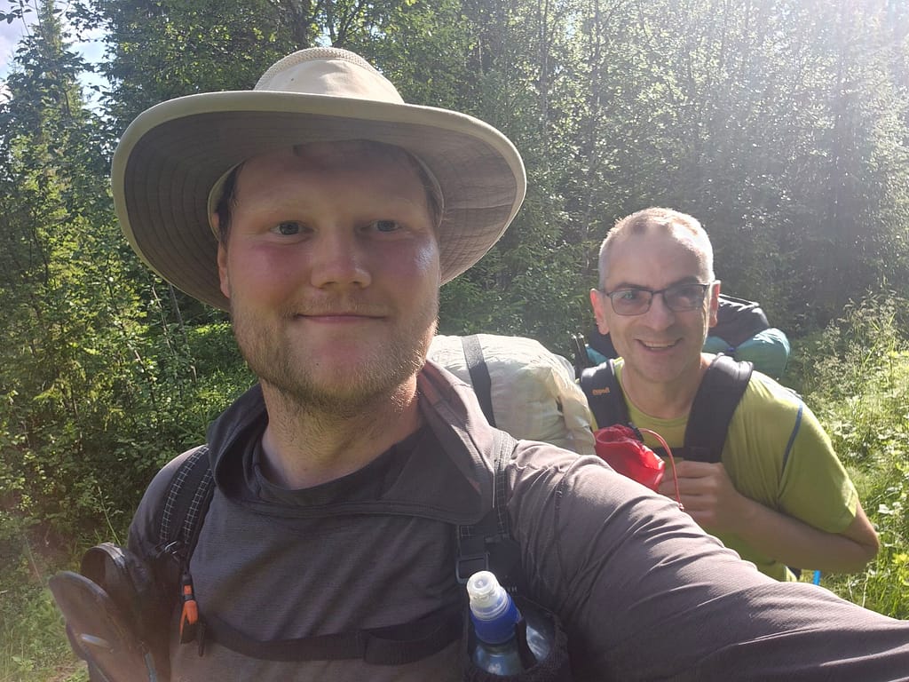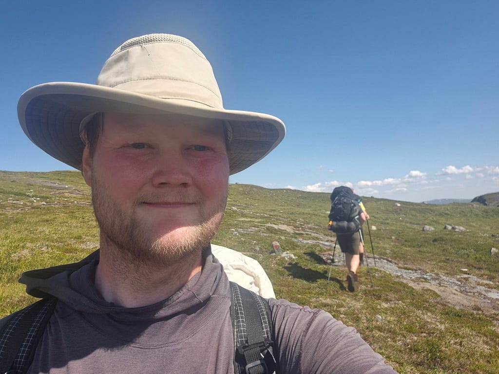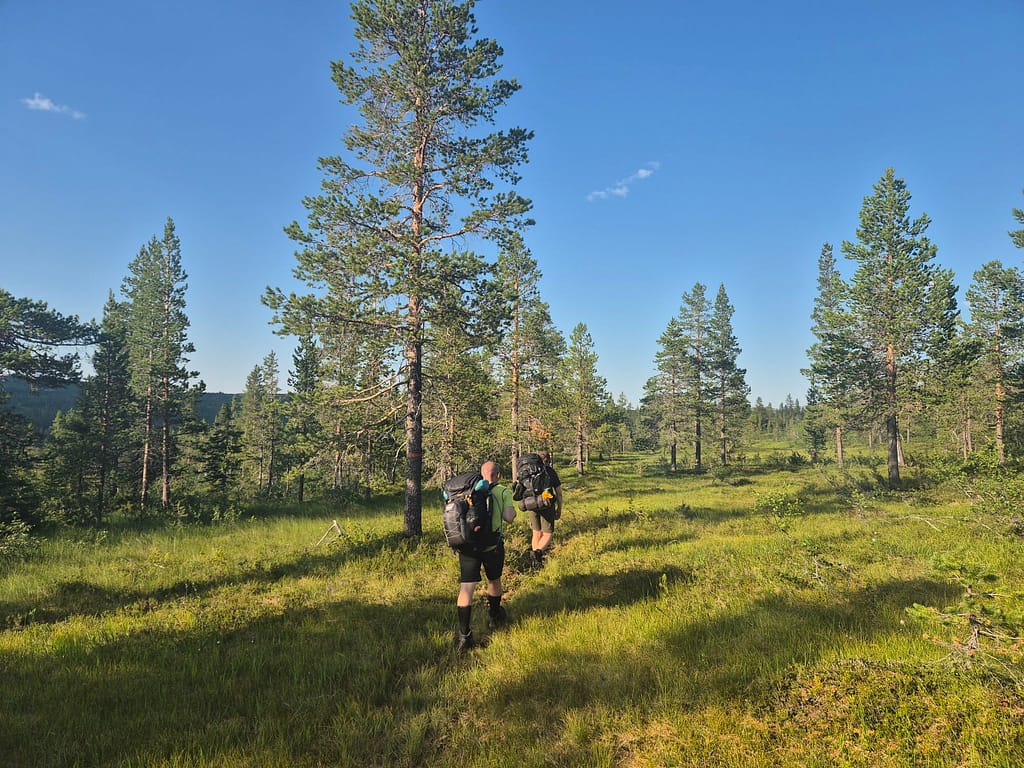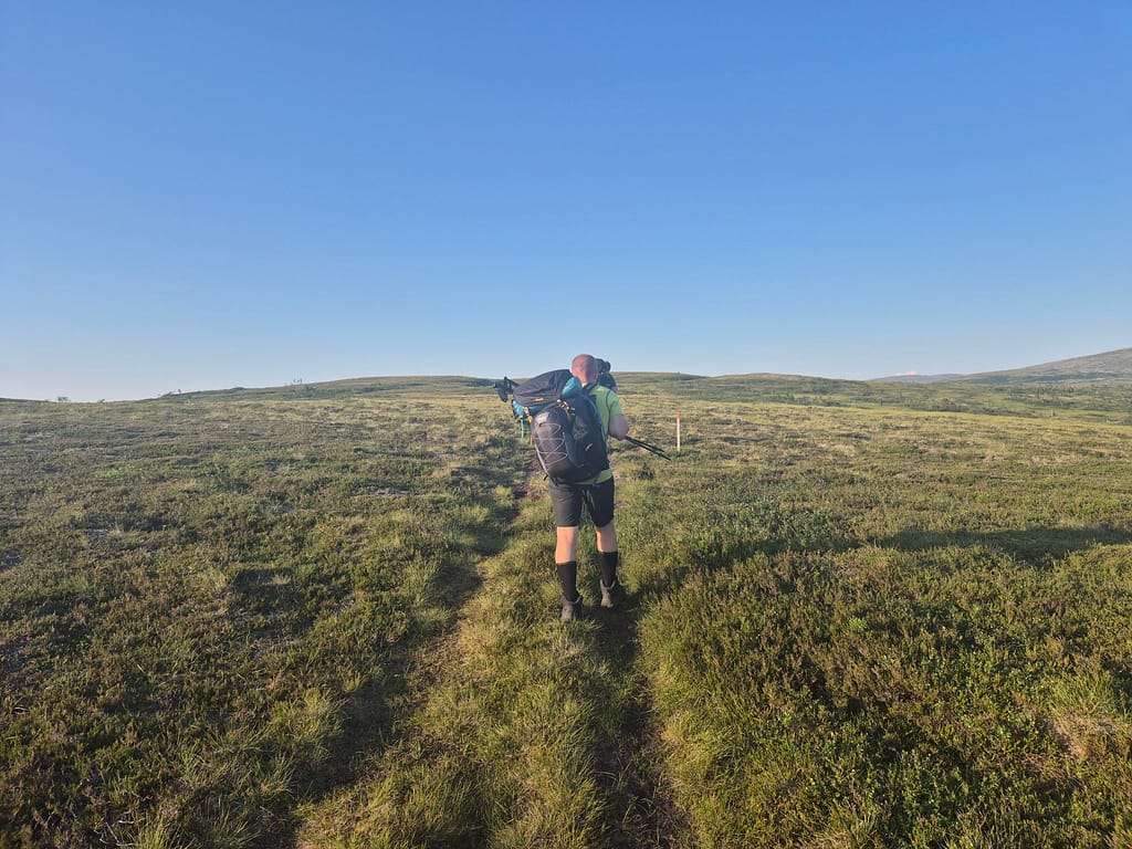 I dag ble det en god marsj på nærmere 25 km. Nok en dag med strålende vær. Vi startet dagen med å låne doen på Angeltjønnhytta. Herifra ble det myr og akog før vi gikk over Halsfjellet. Så snart man er over tregrensa er det flott terreng og god utsikt.