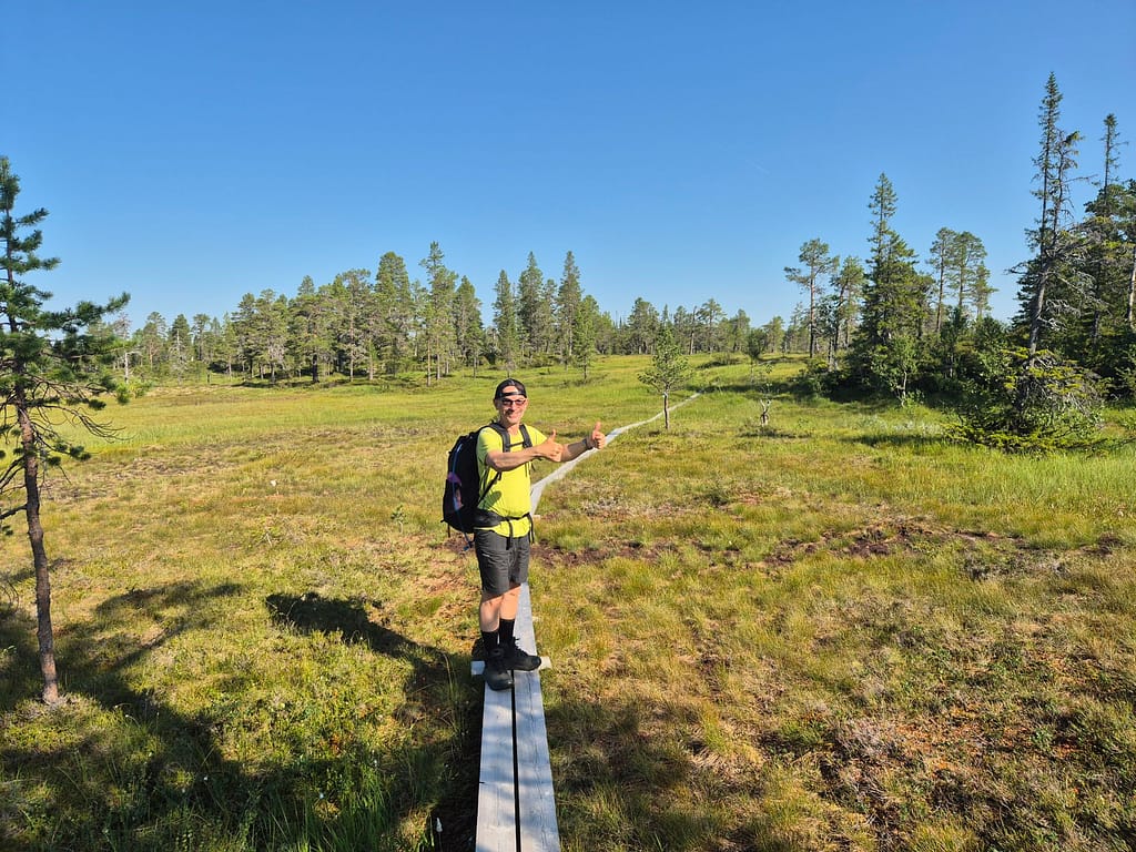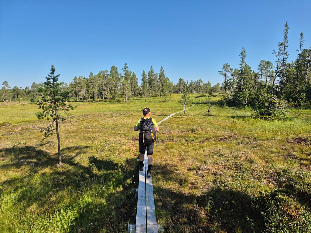 Rett før vannet vi campen med var det skilt med advarsel om våte klopper (planker). Vi tok dette som et godt tegn for at det ville være litt klopper over noen av myrene. På dagens etappe gikk vi omtrent 1/4 av marsjen på klopper. Det var veldig behagelig og kilometerne gikk fort.
