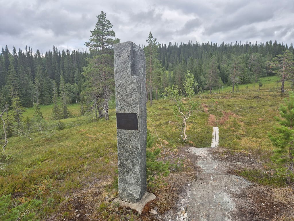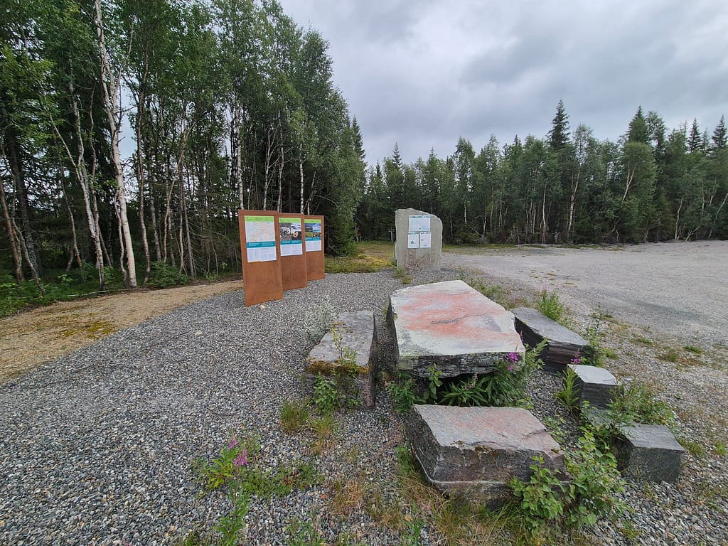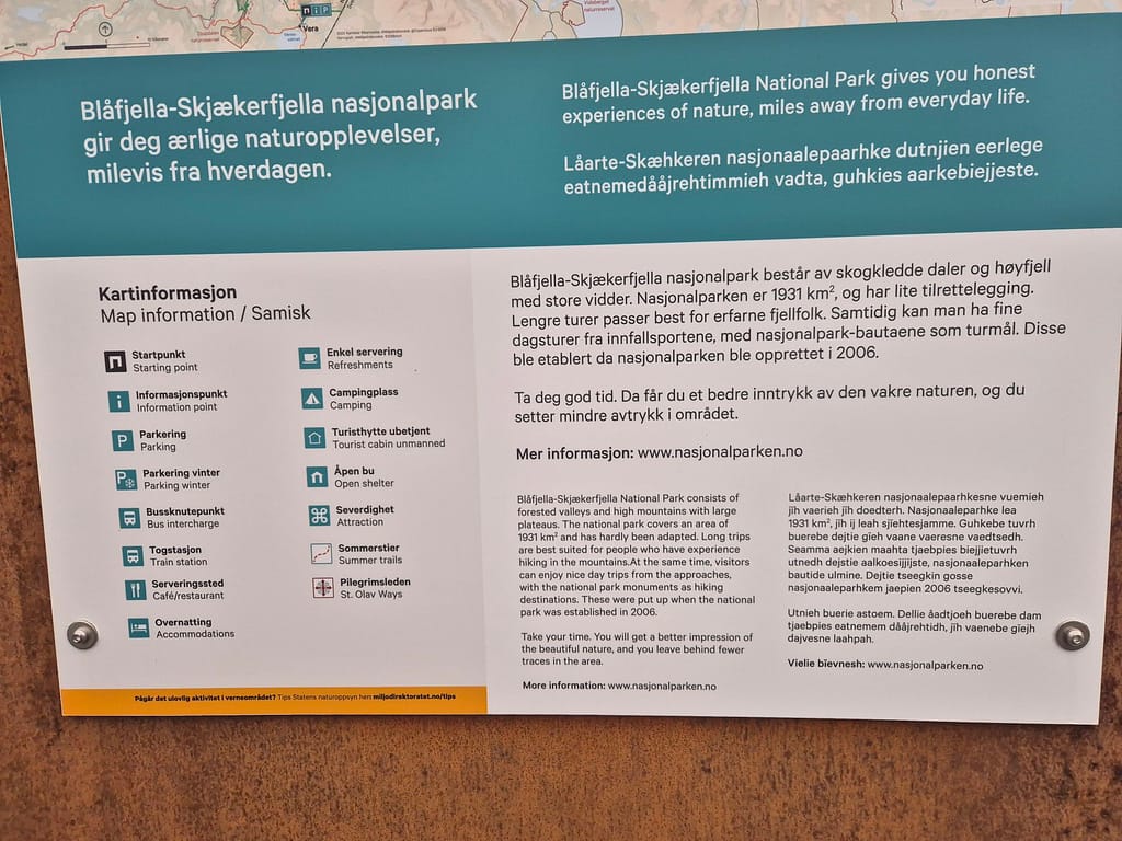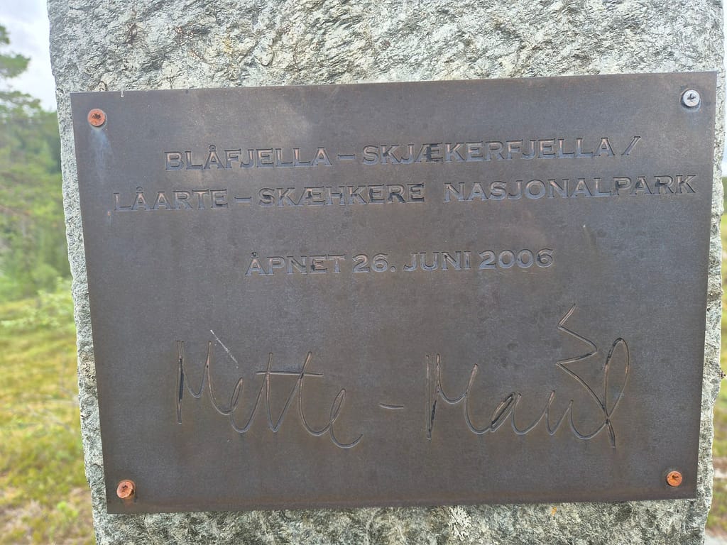 På andre siden av gata fra samfunnshuset var det informasjonstavler om Blåfjella/Skjækerfjella nasjonalpark. Det er også en et stort bord og benker i stein. Dette er den største nasjonalparken i Norge. Den ble åpnet av Mette Marit i 2003. Dette er markert med en stein som er satt opp noen kilometer inn i løypa.