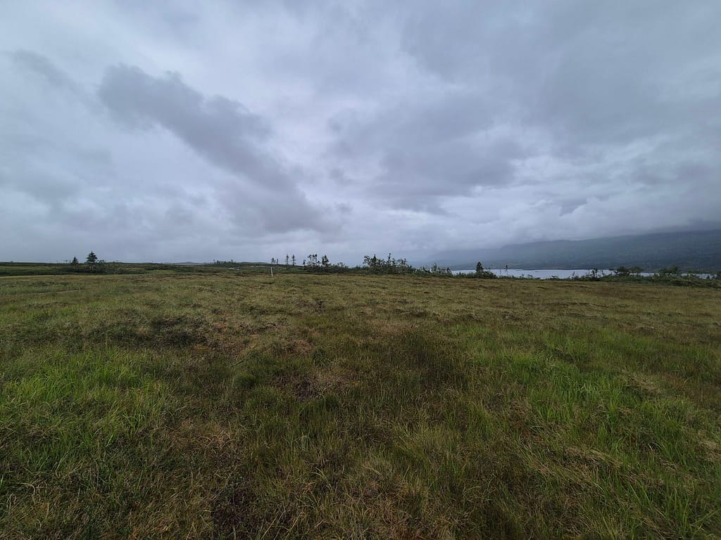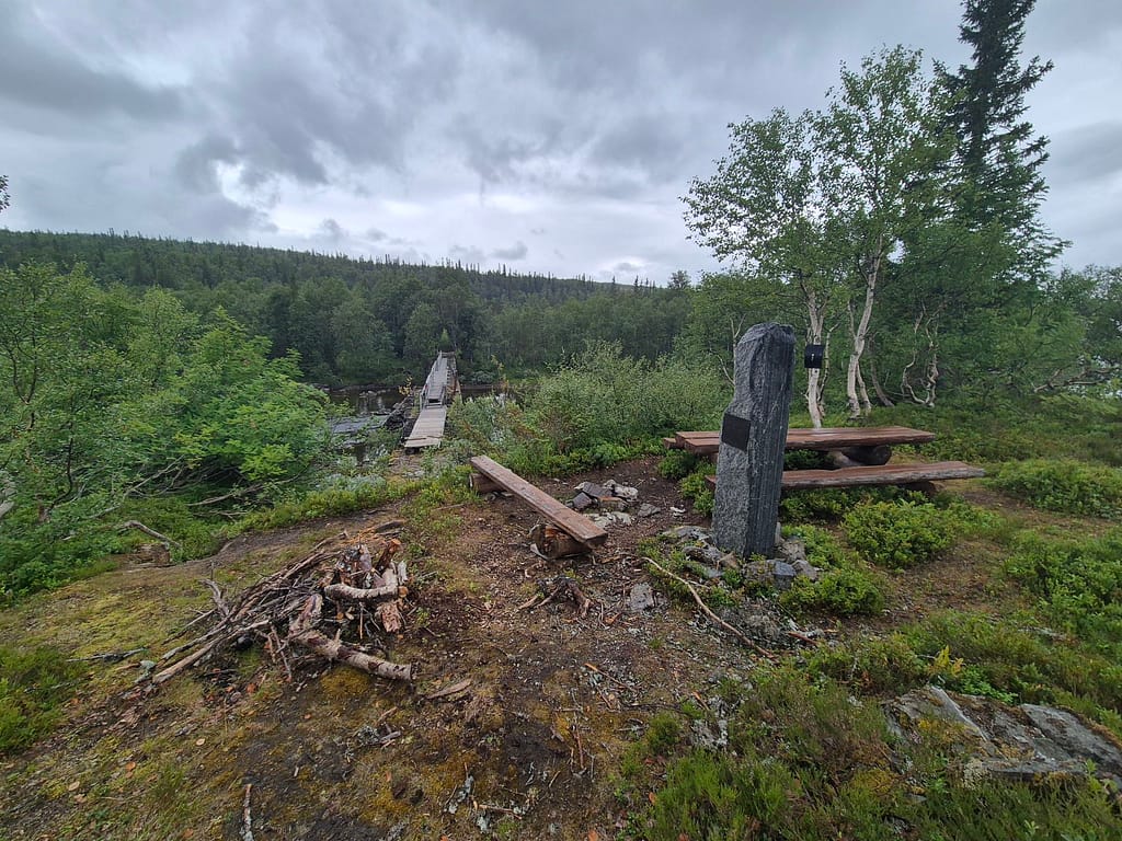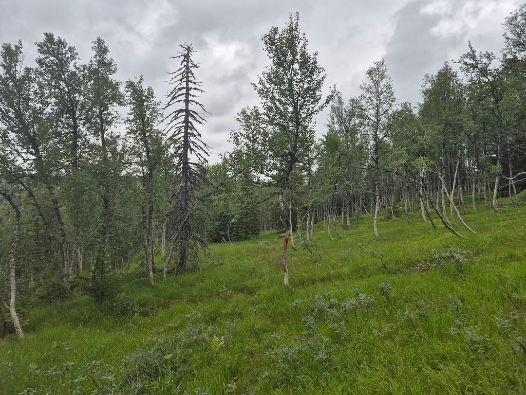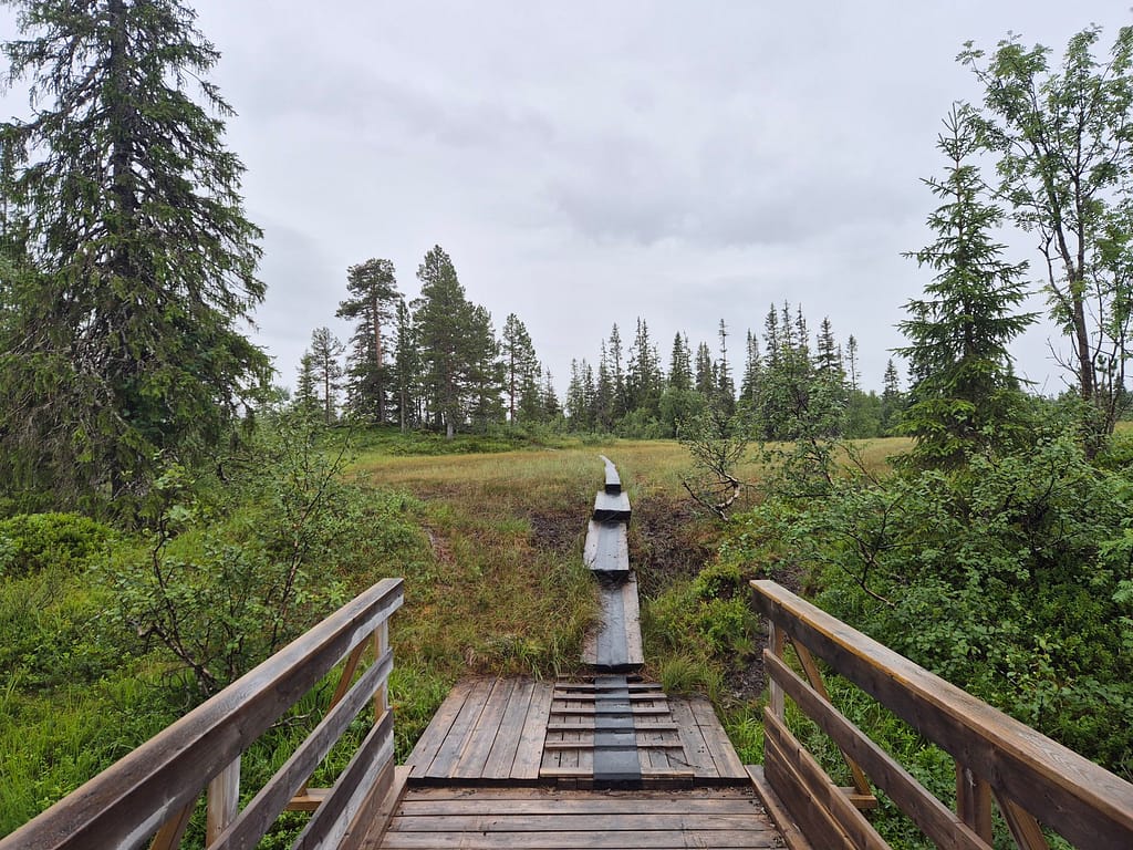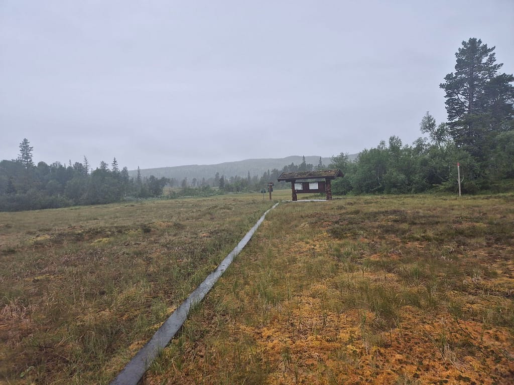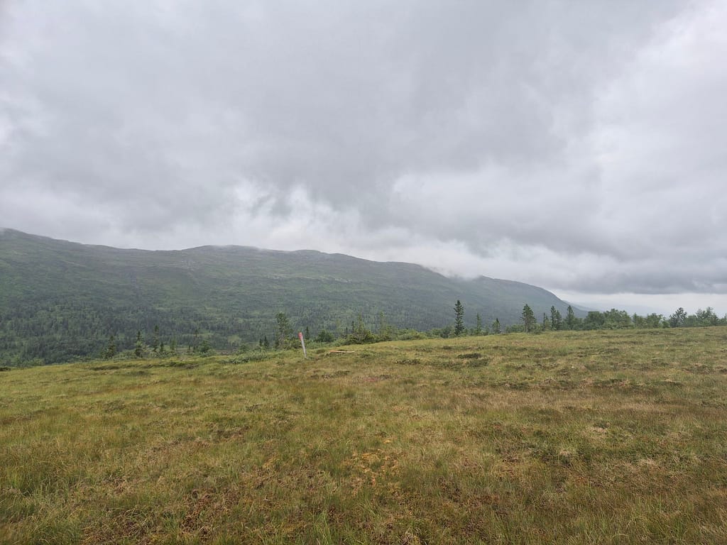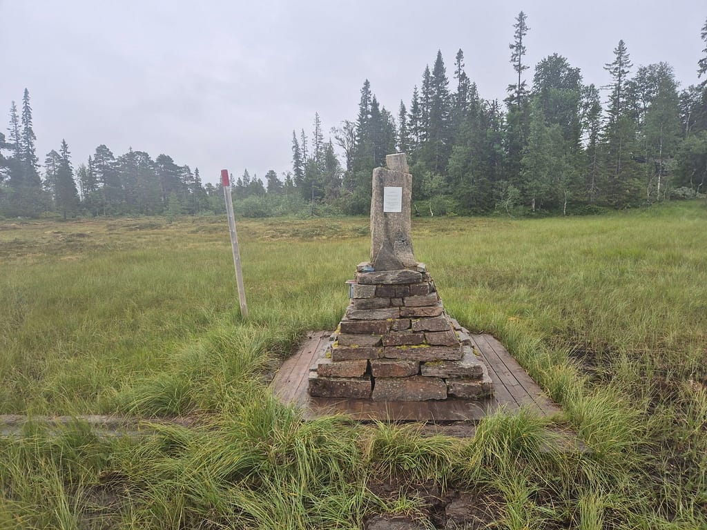 Terrenget i dag var stort sett skog og myr. Med litt regn utpå dagen ble det lite pauser. Under 1 km fra Setertjønnhytta så passerte jeg et punkt som markerer Norges geografiske midtpunkt. Dette er innmålt av statens kartverk. Rutemessig så er det fremdeles litt over en uke med vandring før jeg er omkring halvveis.