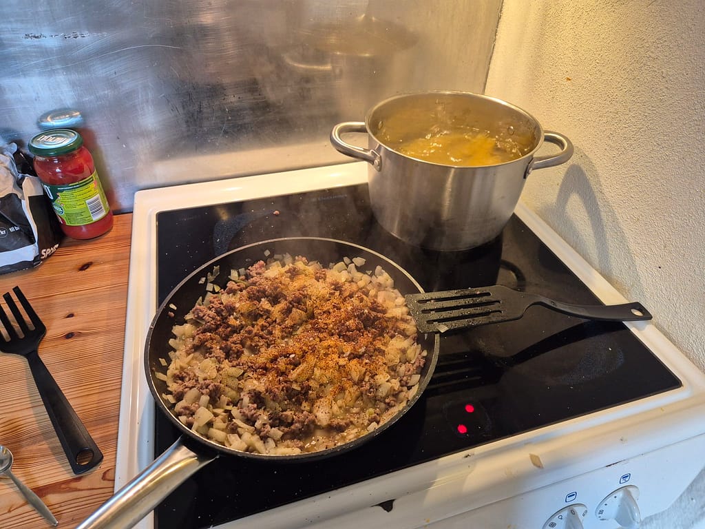 Etter noen slanke marrasjoner de siste dagene så laget jeg meg en stor porsjon med pasta og kjøttsaus. Jeg ble invitert overkant mett og slappet av det meste av ettermiddagen. Jeg fikk også dusjet og vasket opp klærne.
