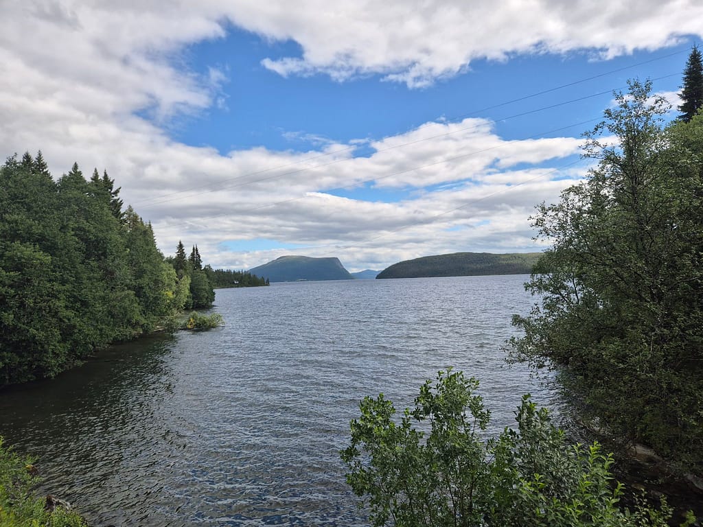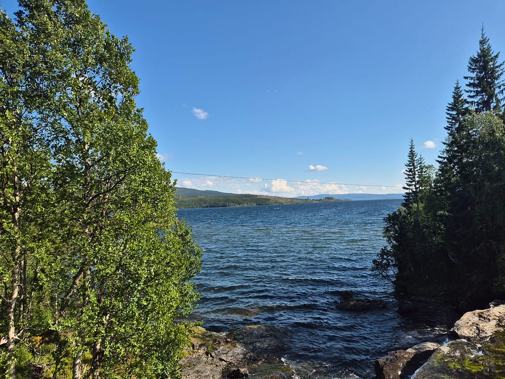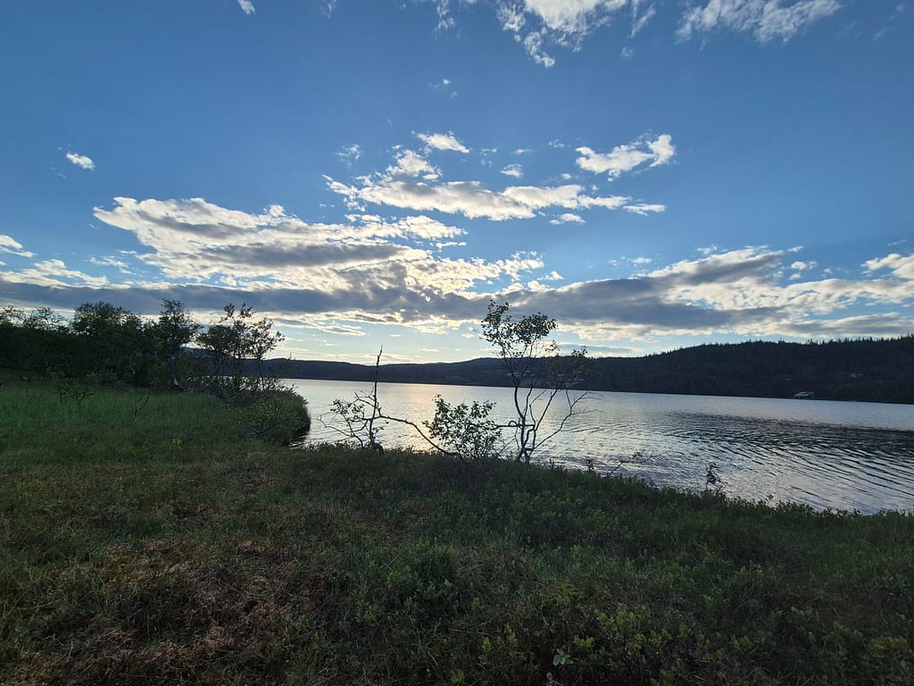 Det ble en fin vandring langs Tunnsjøen før jeg slo opp teltet rett før broa til Gjersvika. Her fant jeg en fin skjermet plass hvor det ble et forfriskende kveldsbad.