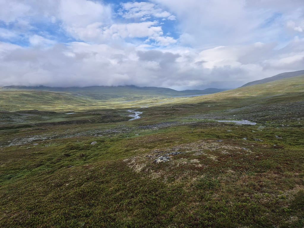 Fra Viermavatnet gikk jeg østover til jeg kom til Ranserdalen. Det vekslet mellom høyfjell med snødekte partier, myr, steinur, mose og lyng. Sett bort fra at det regnet 30mm denne dagen og blåste kraftig så var denne delen av terrenget fint. Innover Ranserdalen fulgte jeg reingjerde til jeg kom til Ranserbua. Det ble noen vadinger iløpet av dagen. Det merkes at elvene er ekstra strie i perioder med mye nedbør og vind.