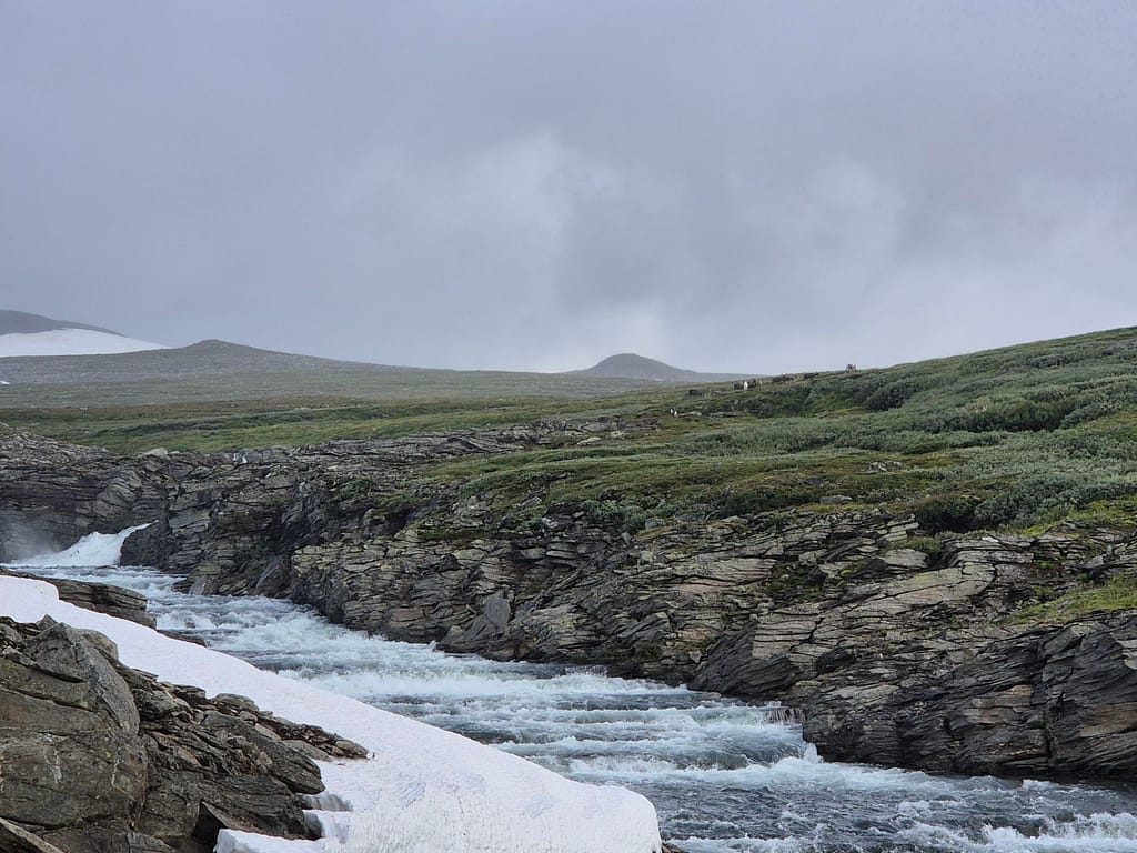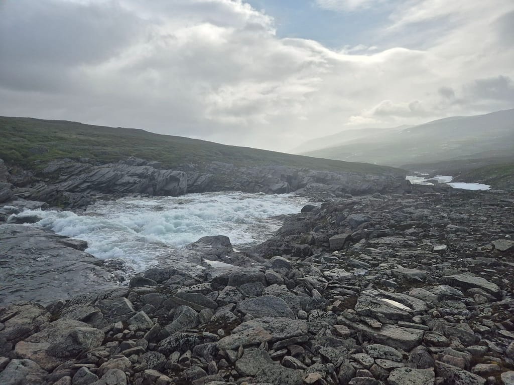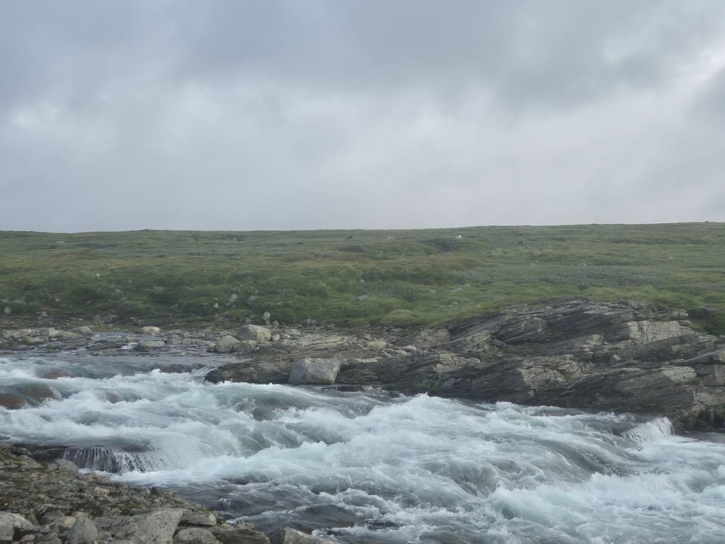 Etter beskjed fra nattens romkamerat at Ranserelva ikke lot seg krysse der jeg hadde tenkt så forsøkte jeg litt lengre opp. Det ble et iherdig forsøk og hele boxeren var våt. Desverre var det for mye strøm så jeg måtte snu halvveis i forsøket. Jeg endte dermed opp med å følge elva et par kilometer oppover til det ble roligere vann. Her ble det en ny kryssing. Det regnet tidvis og blåste fælt. Det virket som at elva var ekstra stri i dag med de store nedbørsmengdene fra de siste dagene, i kombinasjon med kraftig vind I samme retning som elva.