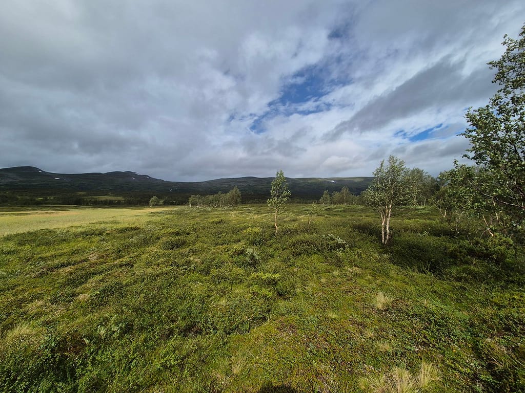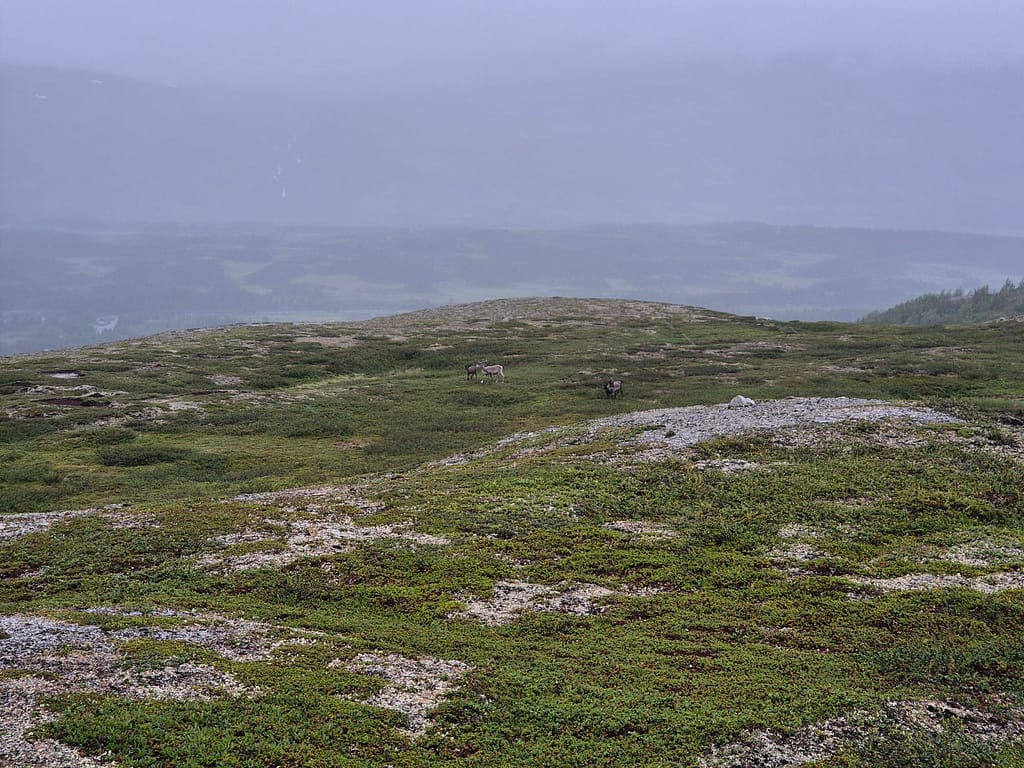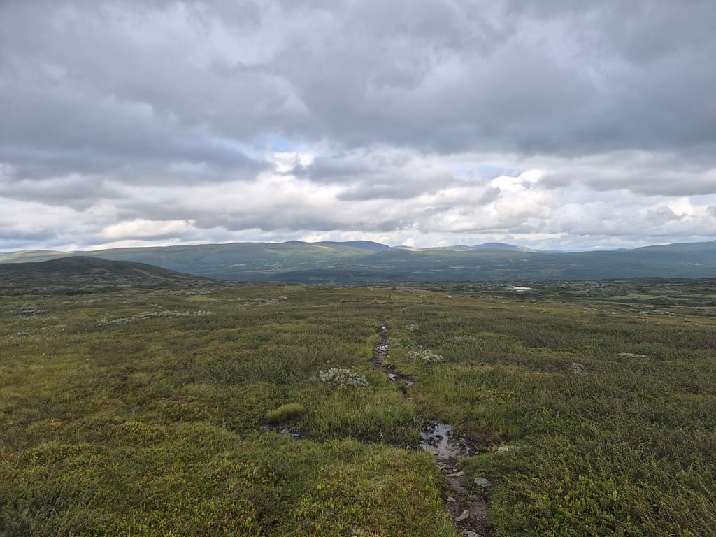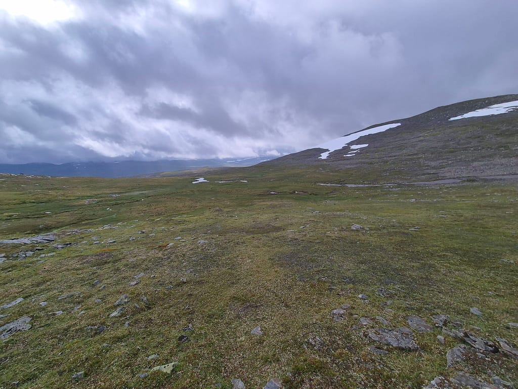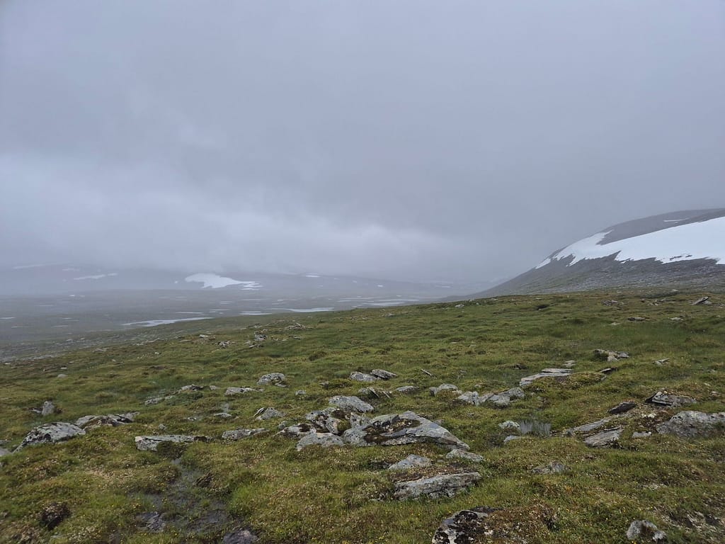 For å slippe å følge elva ned igjen så endte jeg opp med å gå på skrått rundt Reinfjellan til nordsiden av Rotnan. Ettersom det ikke er stier på Børgefjell så endte dette opp som et like godt alternativ enn det jeg først hadde tenkt. Det var fint og lettgått terreng, sett bort fra været. Det ble flere vadinger iløpet av dagen før jeg til slutt slynget meg ned igjennom skogen til Tiplingelva.