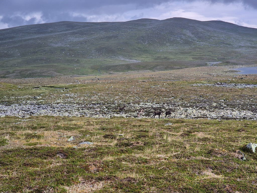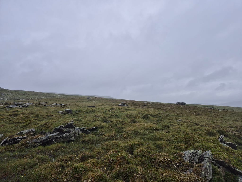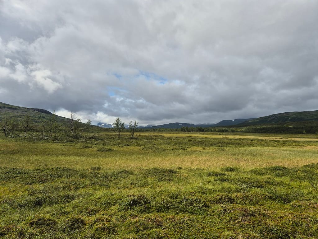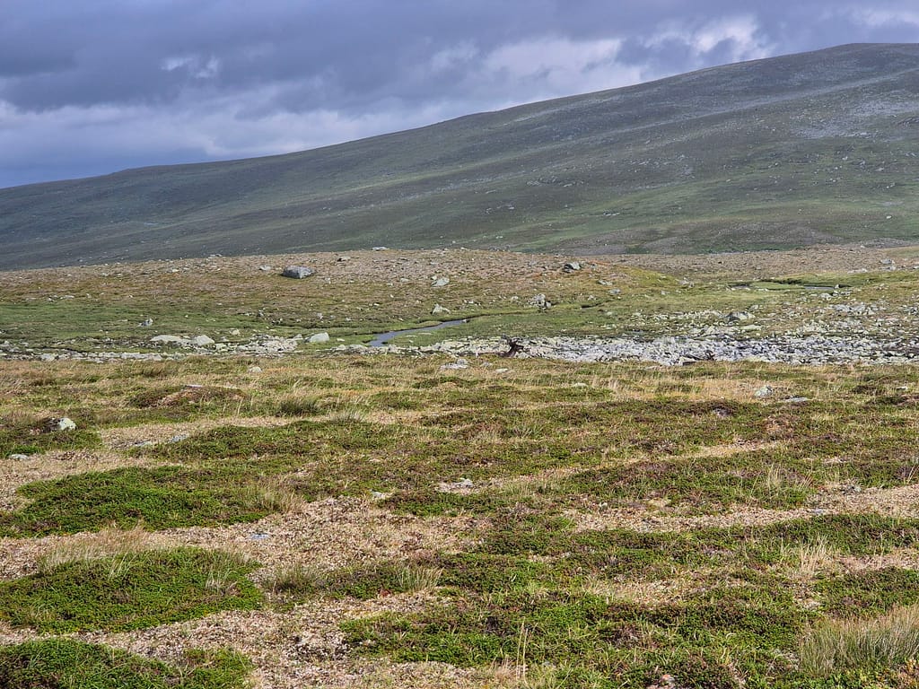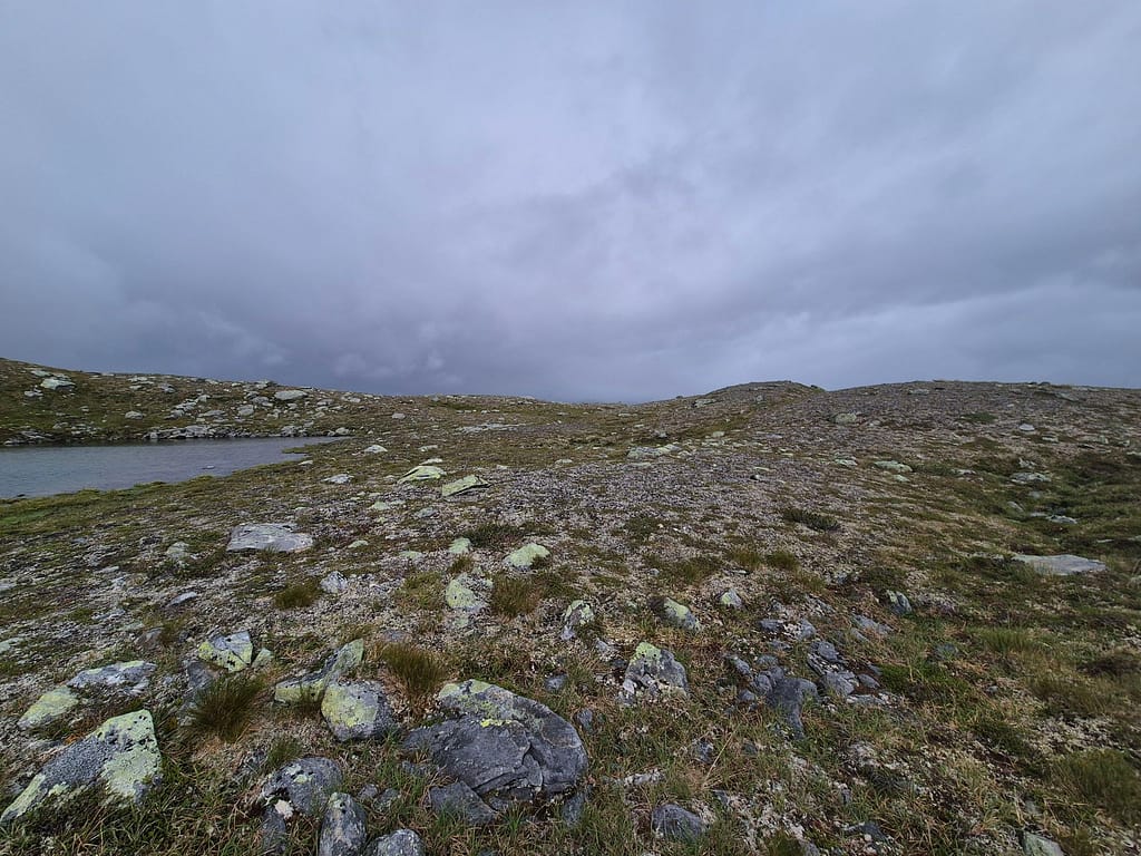 For å slippe å følge elva ned igjen så endte jeg opp med å gå på skrått rundt Reinfjellan til nordsiden av Rotnan. Ettersom det ikke er stier på Børgefjell så endte dette opp som et like godt alternativ enn det jeg først hadde tenkt. Det var fint og lettgått terreng, sett bort fra været. Det ble flere vadinger iløpet av dagen før jeg til slutt slynget meg ned igjennom skogen til Tiplingelva.